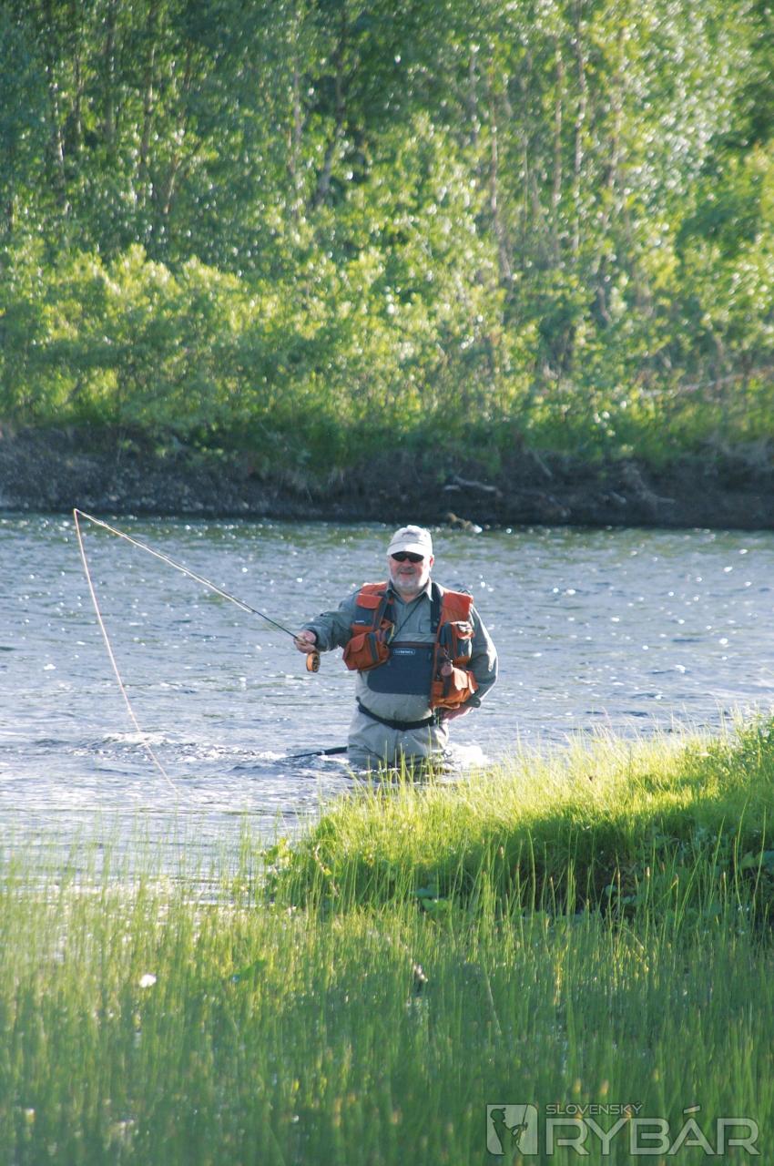 První den jsme si s sebou vzali ještě brodicí hole, ale další dny již zůstávaly u srubu. Ihned po zabrození jsme začali chytat lipany. Nebyli velcí, kolem 35 cm, ale i to nás povzbudilo k dalšímu lovu. Oba jsme začali chytat s nymfami, protože hladina byla stále klidná a ryby nesbíraly. Až později jsme zjistili, že to vůbec nic neznamená a že se dají velmi dobře „vyházet“.
