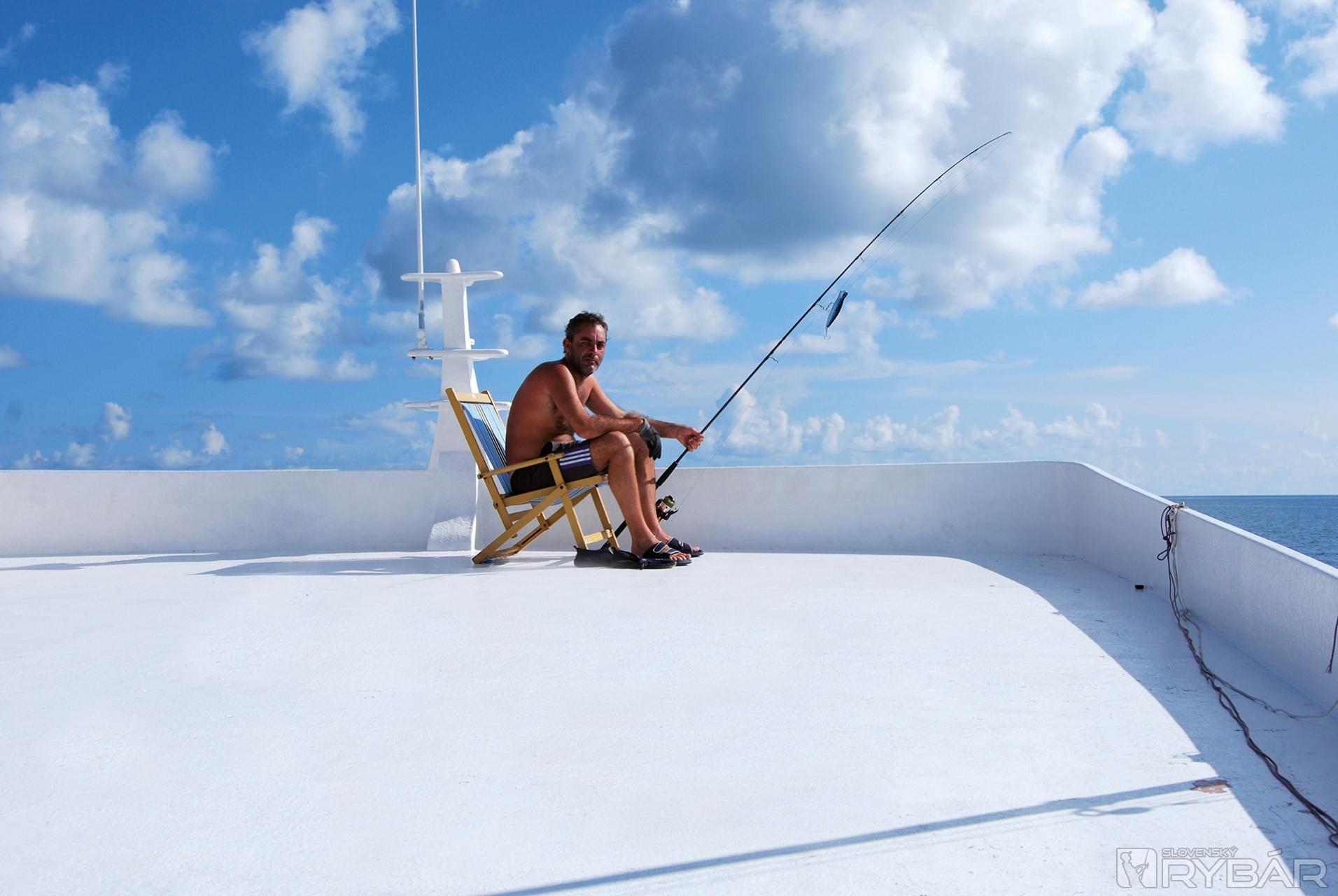 Ibrahim (aké iné meno tu už môžete čakať), náš trvale opálený kapitán, vyráža plnou parou vpred. Nabáda nás, aby sme čím skôr spustili udice na troling, lebo nás čaká niekoľkohodinová cesta do vybratého loviska atolu Lahviyiani. Tento systém trolingu mi tak trochu pripomína systém lovu Big Game Fishing, ktorý som zažil na Floride pri love plachetníkov a dorád, iba s tým rozdielom, že tam sme na jachte dostali do rúk kompletné udice a nástrahy a všetky pohyby za nás robili dvaja mládenci, ktorých sme mali v cene jachty.