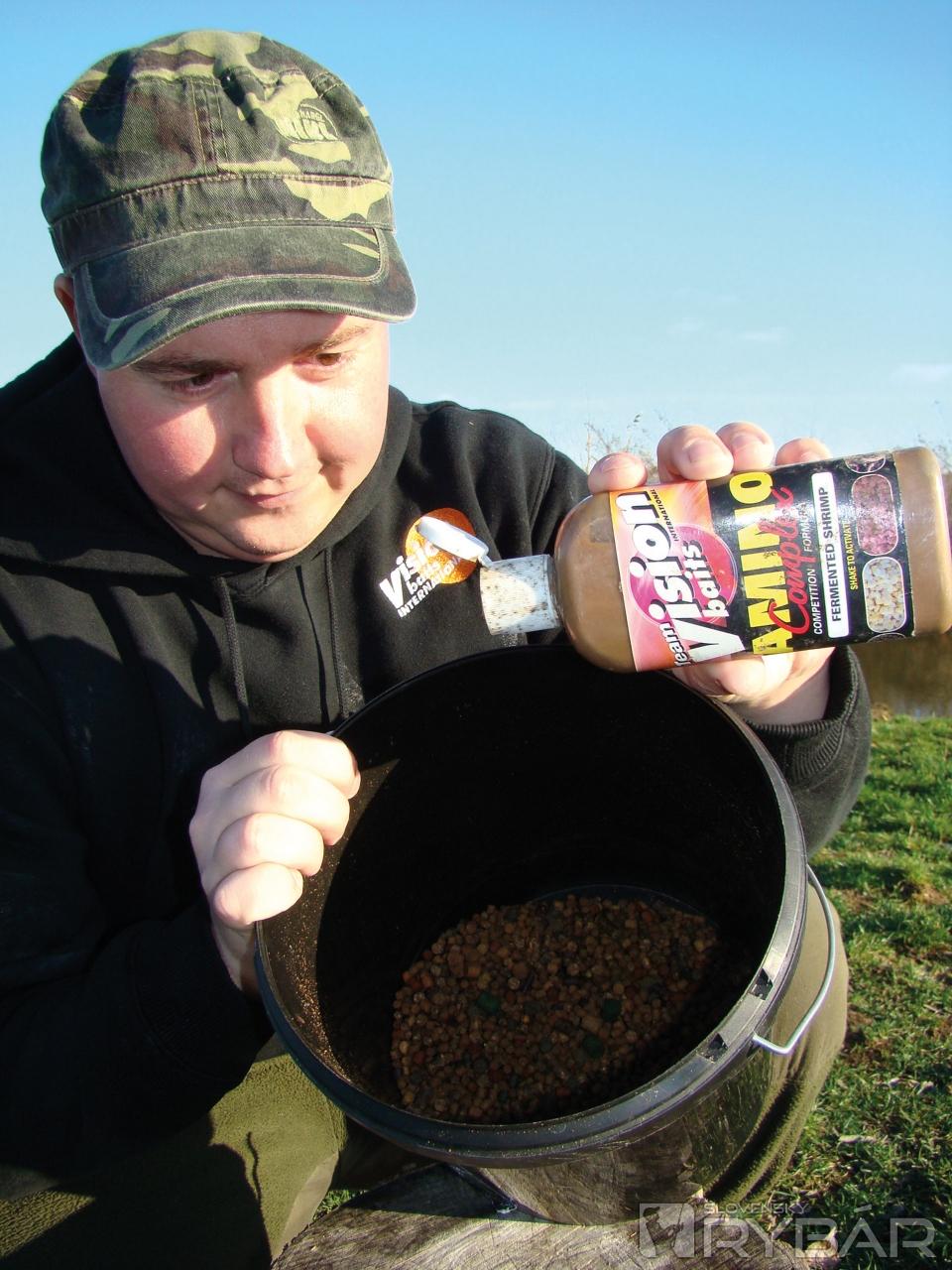 Trvá to možno minútku, dve a montáž letí späť na úspešné miesto. Pár rozčerení hladiny od prikŕmených boilies a stôl je opäť prestretý. Medzičasom si Miloš pripravuje method mix, primiešava aminokomplex a vlhčí vodou. Postupne zmes dostáva správnu konzistenciu, formuje z nej 5-6 kŕmnych gúľ veľkosti mandarínky a s citom ich hádže k potopenému kmeňu. Komentuje to so slovami, že necháme miesto oddýchnuť a ak sa podarí ešte jeden kaprík na nástrahy na dno, zmení taktiku a vyskúša chytať s malou ovocnou pop-kou nad kobercom z koreneného method mixu a mini peletiek.