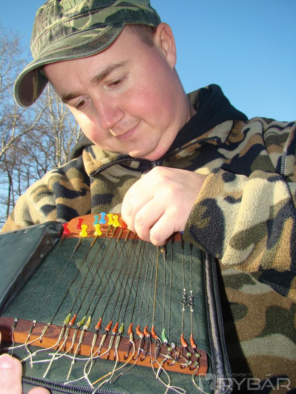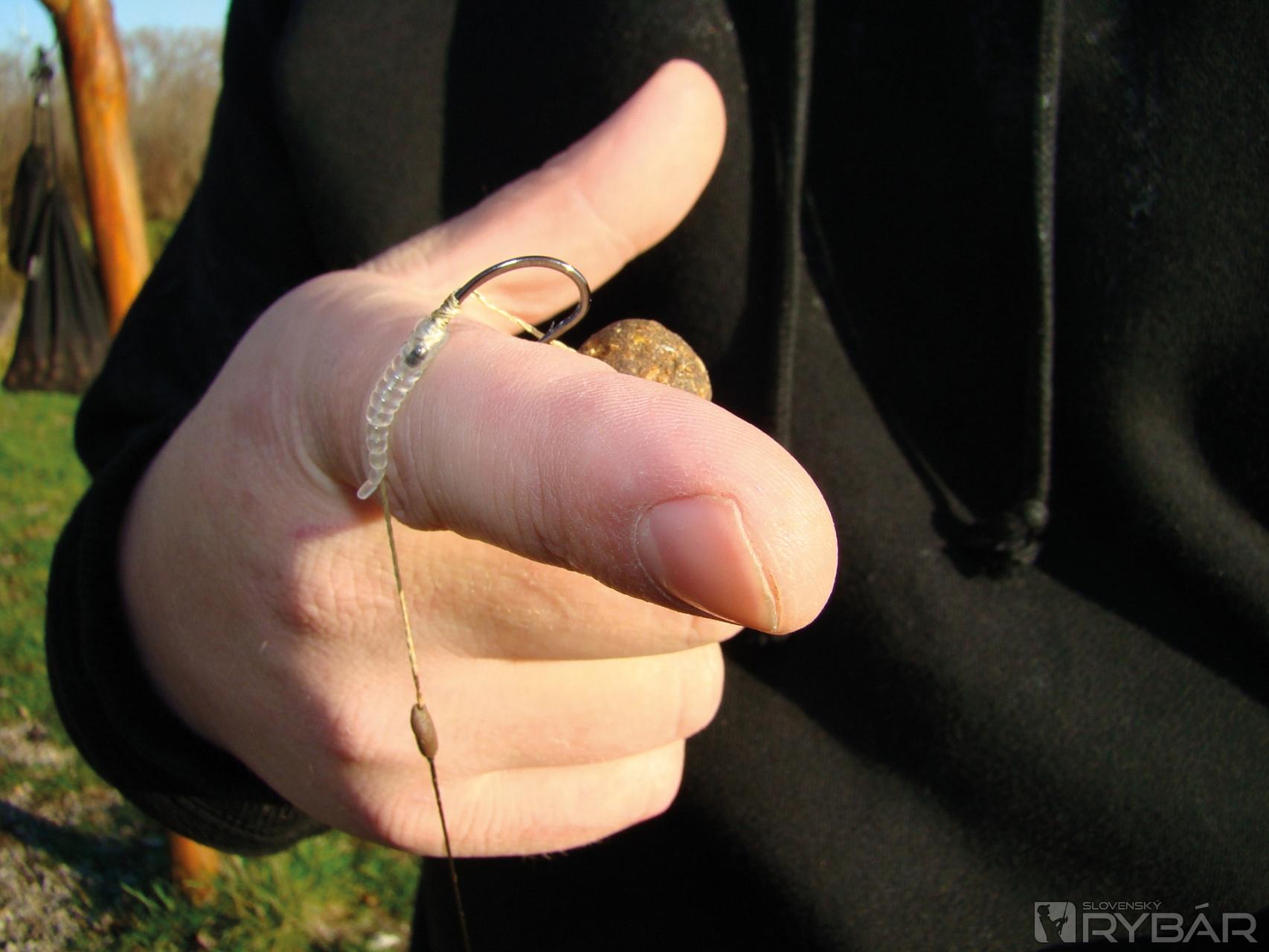 Celý postup sa opakuje aj pri druhej udici, s tým rozdielom, že montáž tvorí 20-centimemtrový kus stuženej šnúrky v kombinácii s malým háčikom s navlečeným maskovacím „rovnátkom“ (červom) a 16 mm boilies nadipovanom v rybacom dipe so zvýšenou dávkou sladidla. Montáž dopĺňa malá PVA pančuška naplnená zmesou peliet nadipovaných boostrom.
