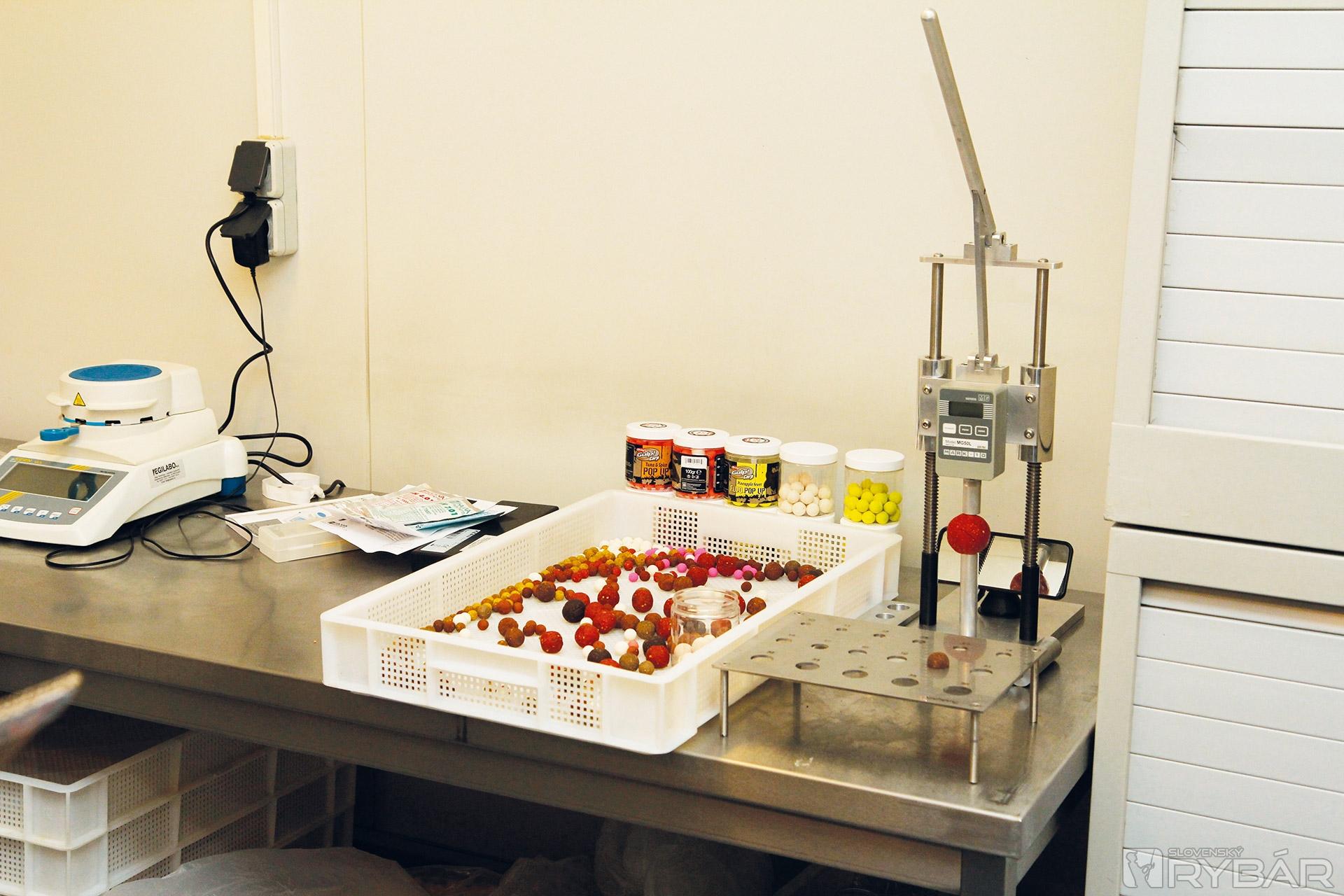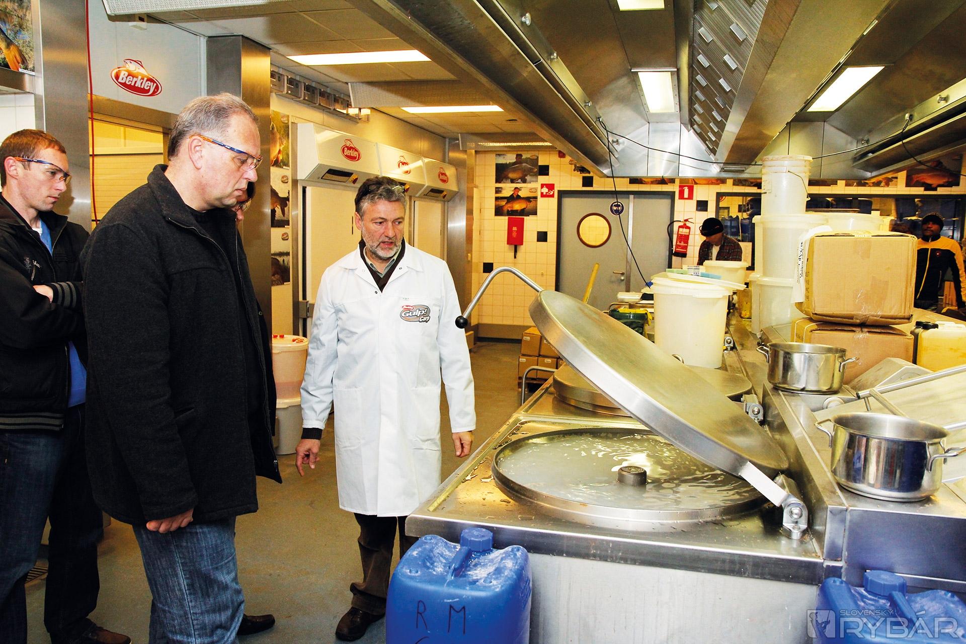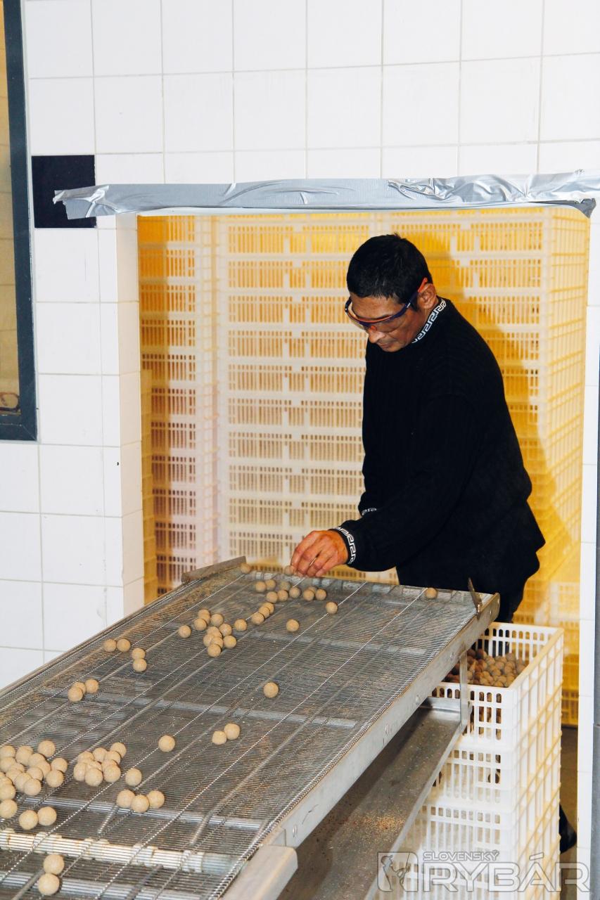 Presúvame sa do samotnej výrobne boilies. Vo veľkých nádobách sa miešajú atraktanty, vône. Ďalšia miestnosť je plná suchej zmesi do boilies. „Tu hore je zásobník. Práve pracujeme na výrobe Squid a Liver.“ Fotografovať, bohužiaľ, nemôžeme a úplne to chápeme a akceptujeme. Tryska vytláča valčeky, rezačka ich krája, vytvára guľôčky, ktoré sa varia a pomaly sa presúvajú na pás, na konci ktorého ich zamestnanec ručne triedi.