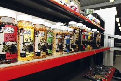 Manuálna práca je pri tomto procese veľmi dôležitá. Vytriedené boilies putujú do sušiacich košov a vozia sa do sušiarne, kde sa pri určitej teplote a vlhkosti pripravujú na balenie. Ďalšia miestnosť je určená na skladovanie semien. Tie sa dovážajú prevažne z Anglicka. „Partiklové návnady sú ďalším veľmi dôležitým artiklom. Ako vidíte, máme ich naozaj dosť a spracúvame ich metódou tak, aby v nich boli aj napriek varu obsiahnuté dôležité nutričné látky, ktoré prilákajú rybu na lovné miesto.“