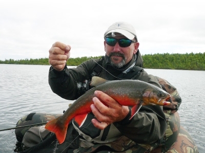 Pomaly som sa plavil v pobrežných partiách, moju pozornosť utlmili protiľahlé zasnežené svahy. A práve vtedy sa to stalo: prudké, nečakané šklbnutie, pomarančový blesk letel meter do výšky, nasledovali ešte dva rýchle výskoky a čau, bol preč. Obaja s Ivanom sme ešte dostali jednu šancu, ale premeniť voči takému bojovníkovi sa nám ju nepodarilo. Dôležité však bolo, že sme mali možnosť povodiť jednu z najbojovnejších a najkrajších lososovitých rýb. Bola to tá správna bodka za touto vydarenou výpravou.