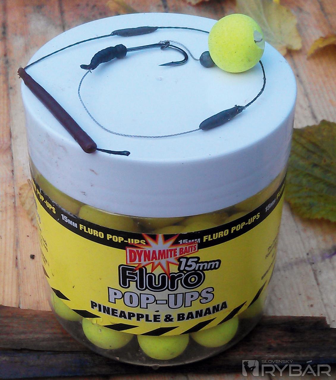 Ďalším odporúčaním bola nástraha s menším priemerom: 15 mm pop-up od Dynamite baits príchuť Pineapple-banana /Ananás-banán/. Poradili nám minimálne na 3-4 udice použiť uvedenú nástrahu samostatne – nakoniec sme chytali až na 6 prútov s uvedeným boilies. Na ďalšie dve montáže sme nastražili brazílsky orech resp. Dušan potápavé boilies tiež od Dynamite baits Robin RED /tu sme používali aj pelety rovnakého druhu/ a Tigrí Orech /Tiger Nuts/, čím sme aj zakrmovali.