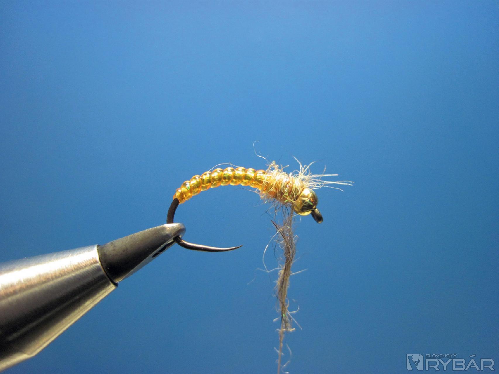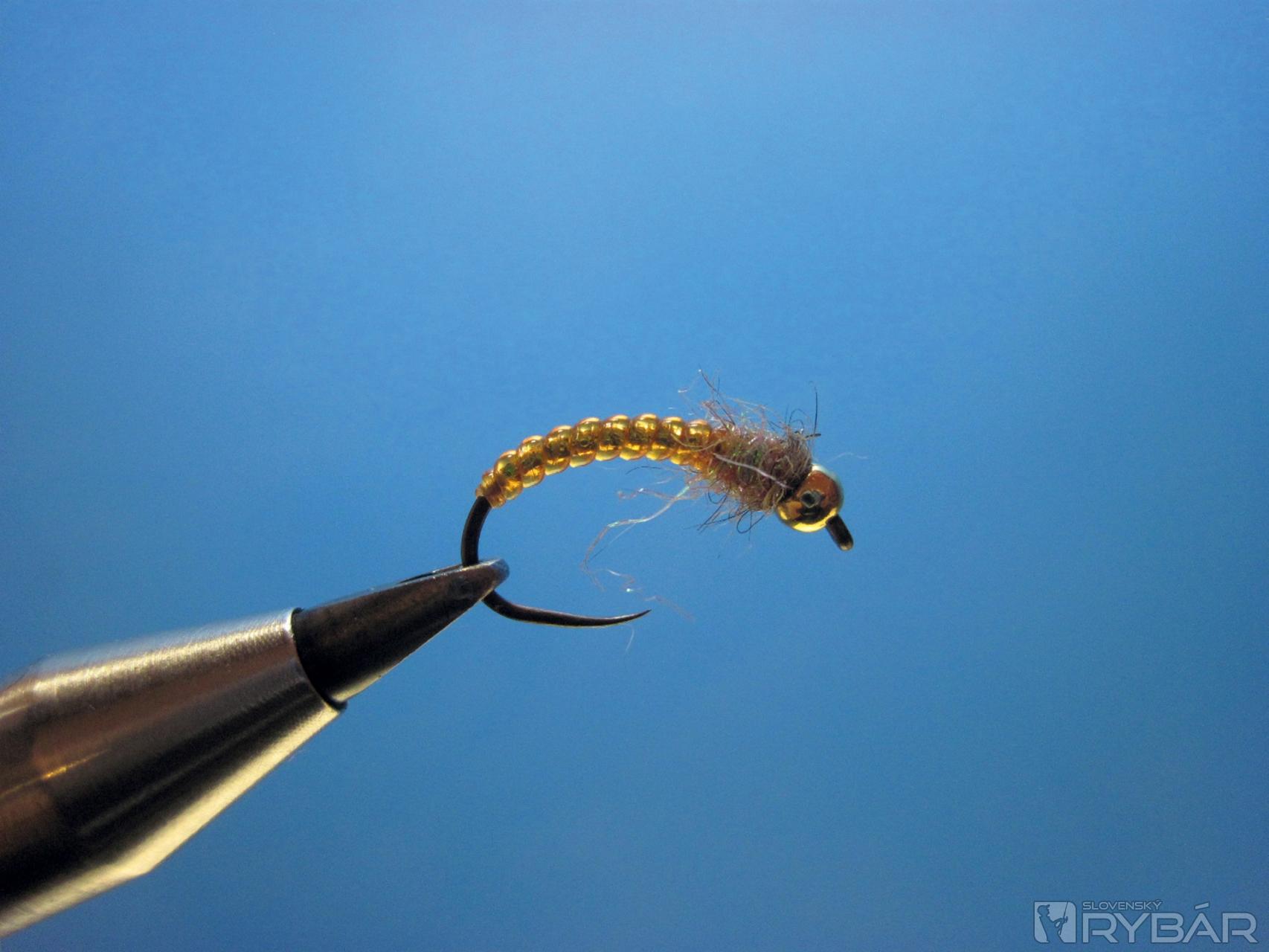 Istý čas som používal veľmi priesvitný bodyglass, ktorý som podmotal zlatou alebo striebornou holografickou lametkou. Takéto telíčka som používal na malé zlatohlavé nymfy, ktoré chytali lipne, pstruhy a jalce doslova „ako o život“. Je potrebné vždy nakombinovať farby podľa konkrétnej vody a prispôsobiť mušku obľúbeným vzorom, ktoré sú v danej lokalite úspešné.