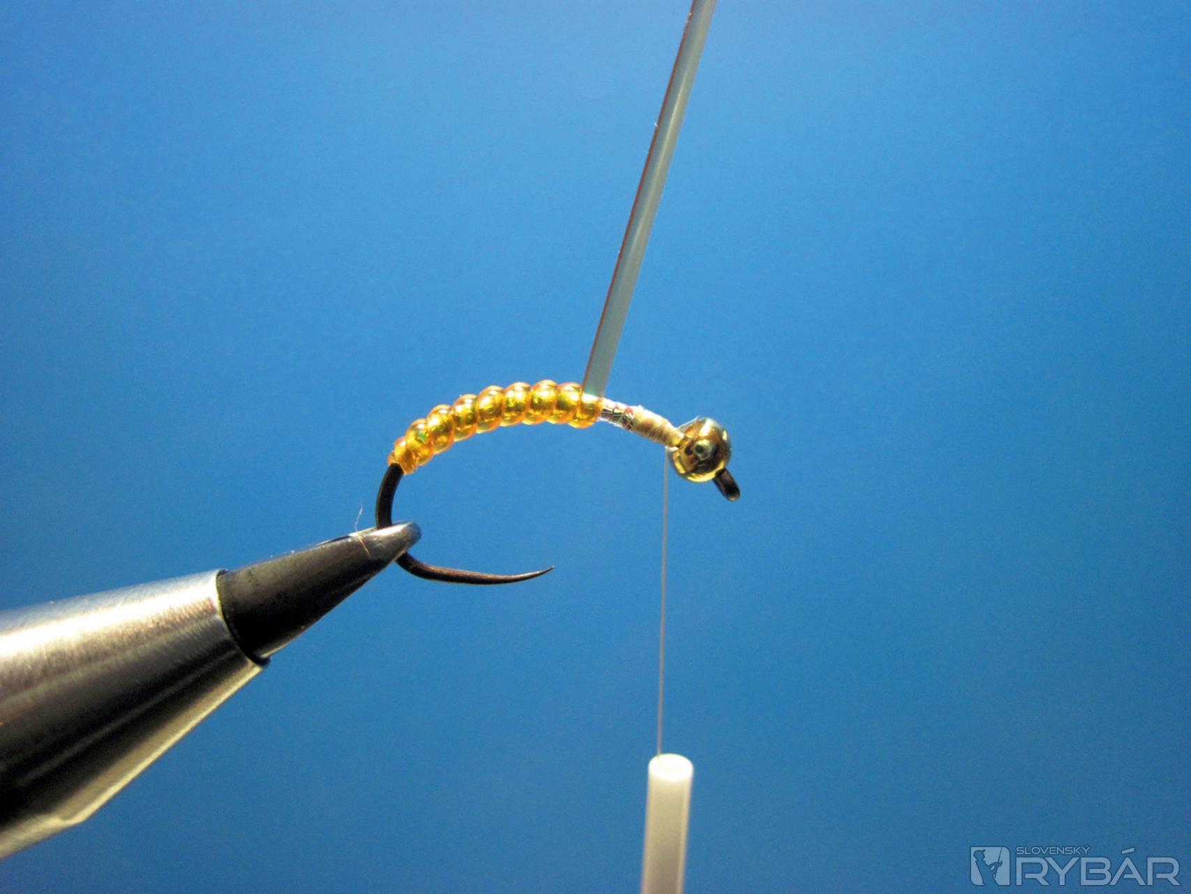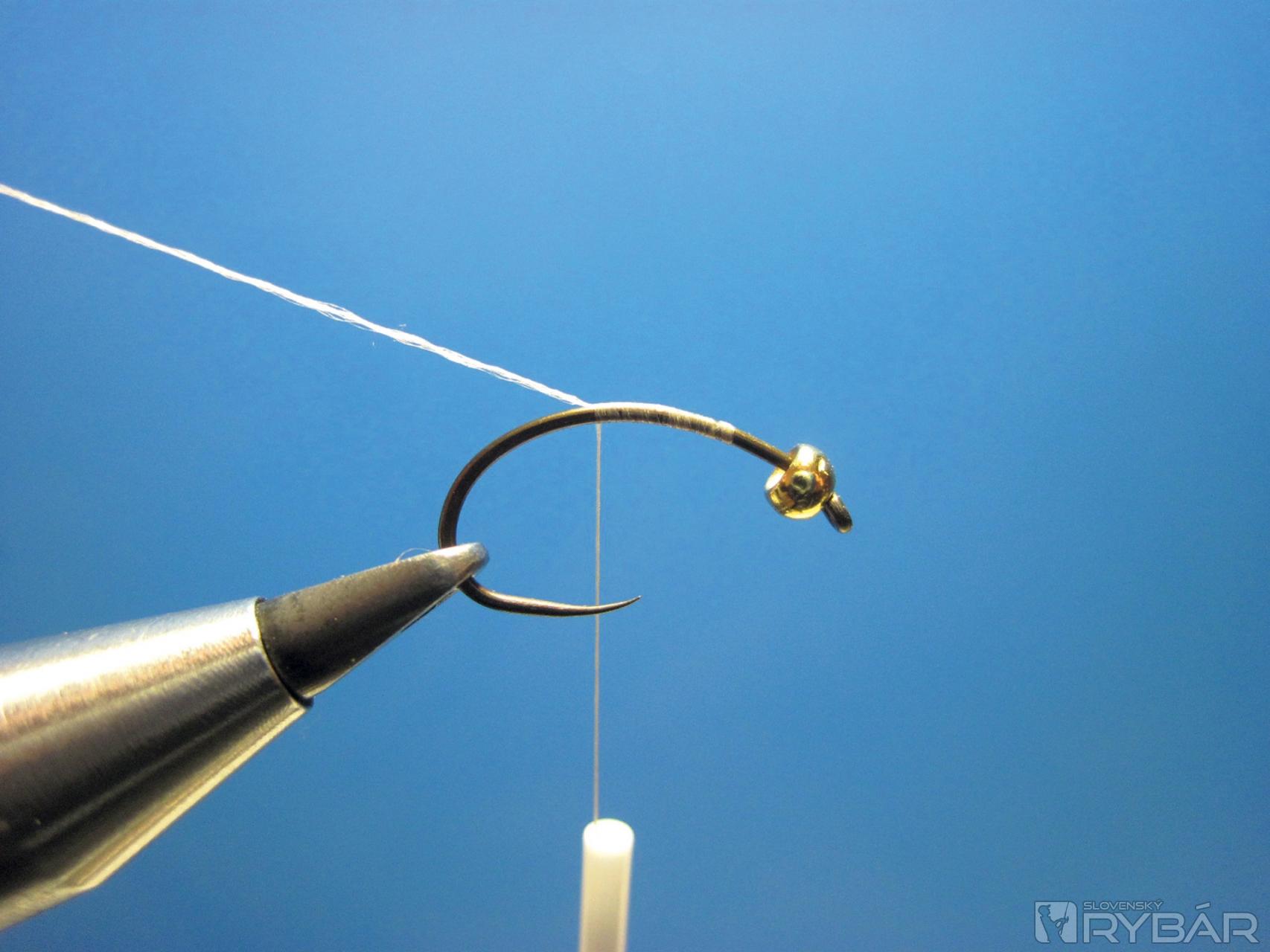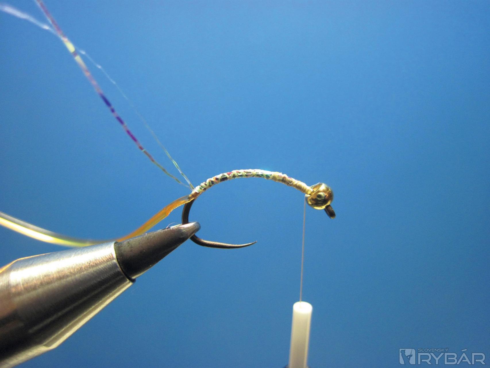 Pri hlavičke naviažeme dve perleťové vlákna a ich viazanie ukončíme cca 1 mm pred miestom, kde je naviazaný bodyglass.