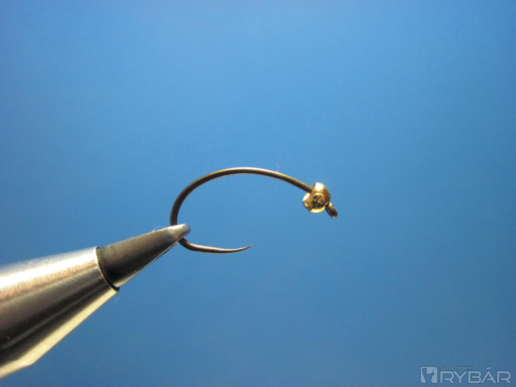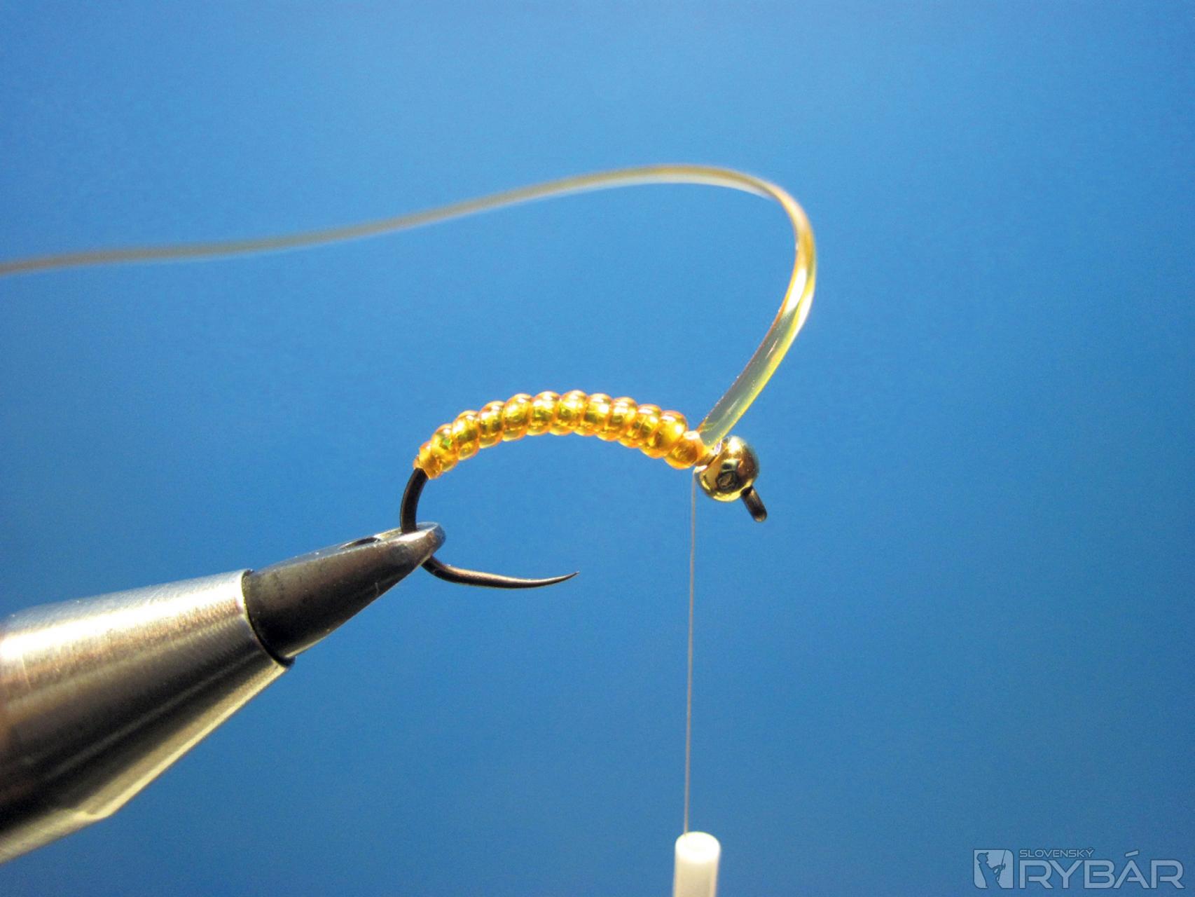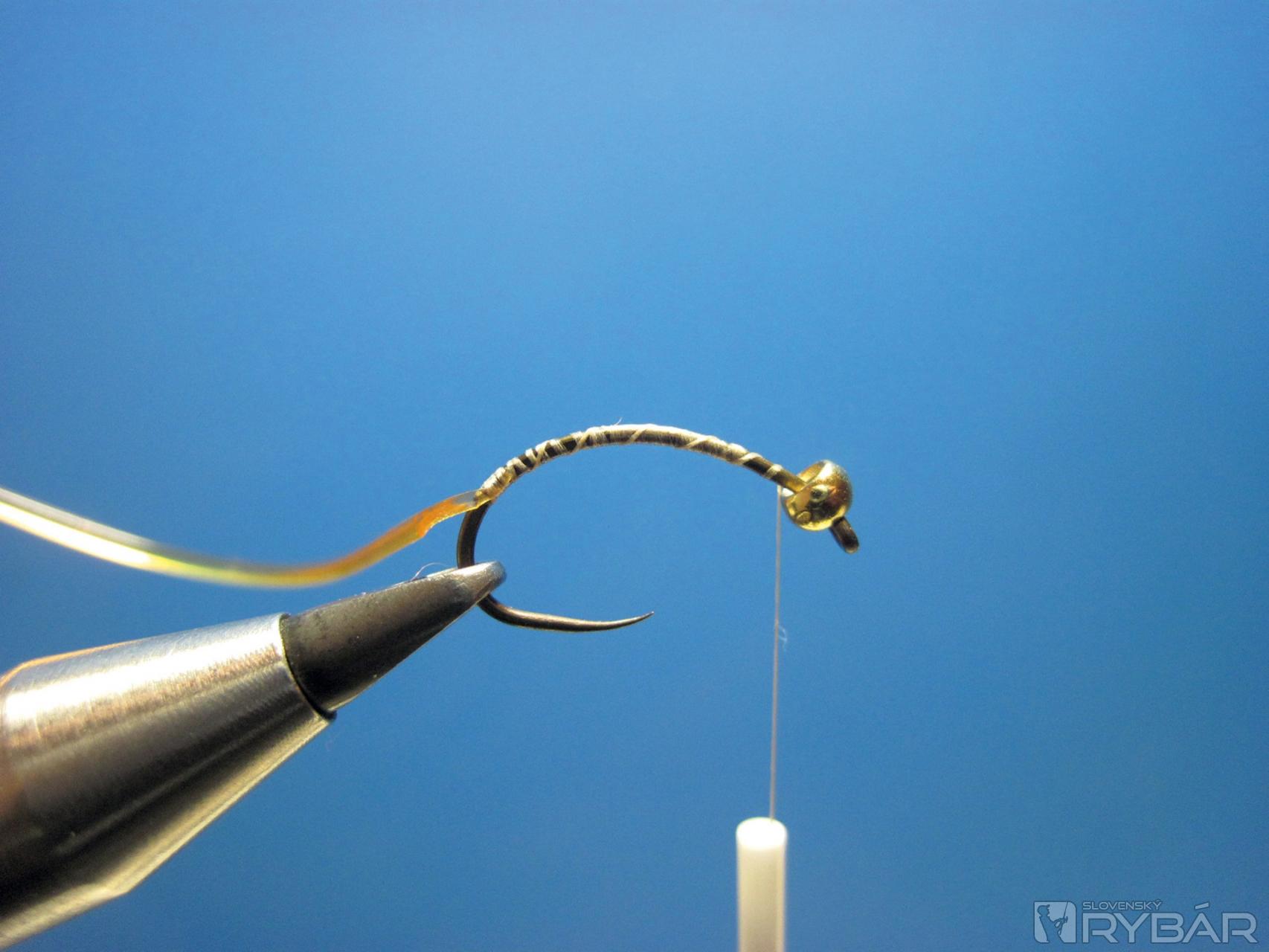 Pri hlavičke naviažeme dve perleťové vlákna a ich viazanie ukončíme cca 1 mm pred miestom, kde je naviazaný bodyglass.