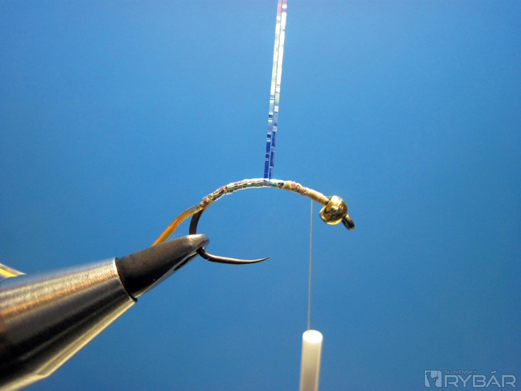 Najprv s pomocou rotačného ramena navinieme perleťové lametky po celej dĺžke ramienka háčika. Lametky zafixujeme pri hlavičke a odstrihneme ich zvyšné konce.