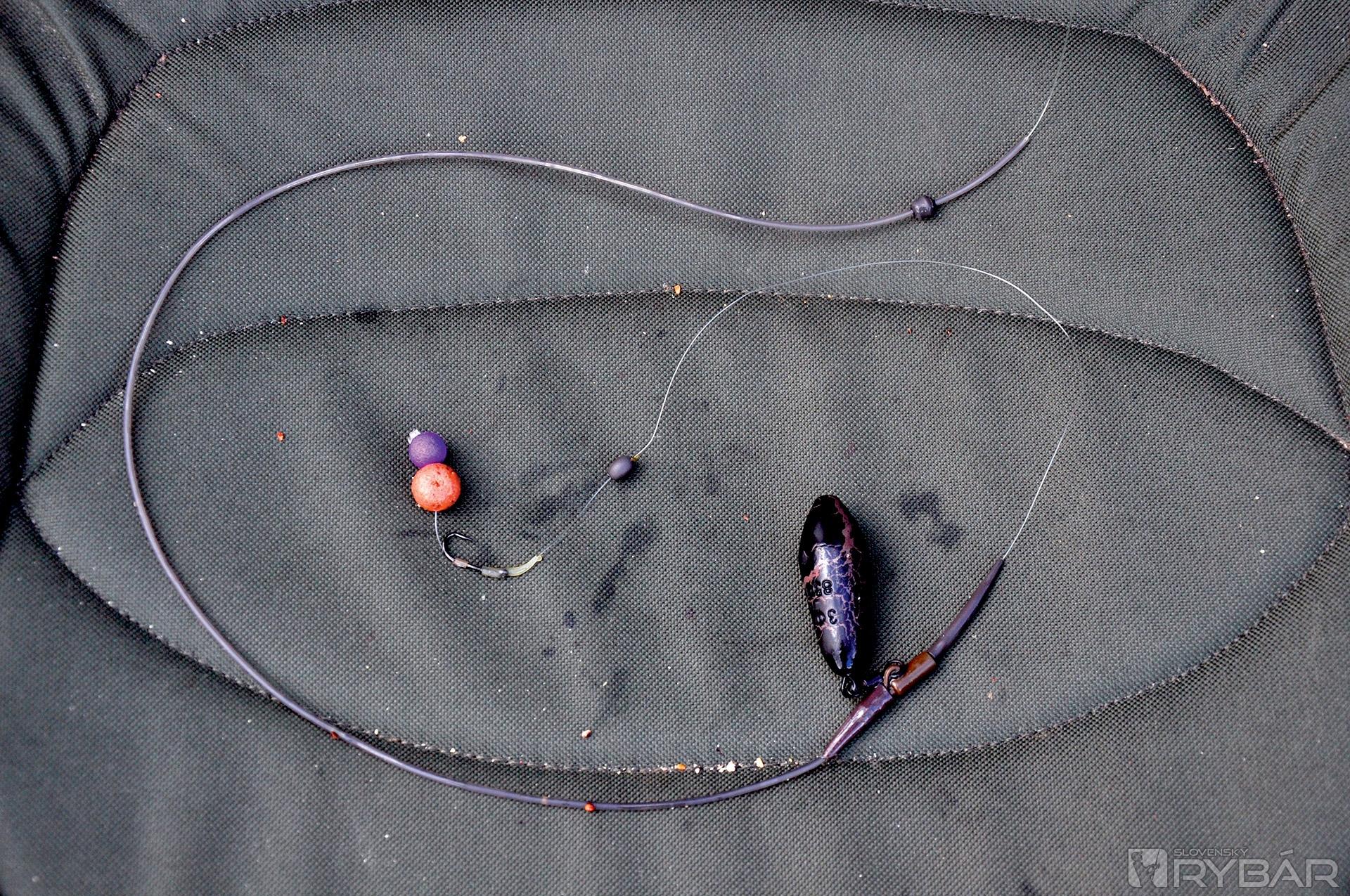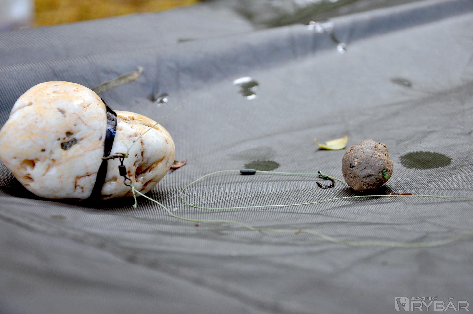 Čo sa týka montáže, obvykle pri vyvážaní používam montáž s odpadávajúcim kameňom zaveseným do gumičky. Ten zvyčajne spadne vo chvíli, keď sa zaseknutá ryba zľakne a prudko vyrazí. Kameň by mal byť dostatočne ťažký a hladký, aby ľahko skĺzol z gumičky. Spúšťanie kameňa vyžaduje trochu cviku, ale po čase na to určite prídete. K tejto montáži dávam takmer vždy 35-50 cm dlhý nadväzec z odolnej pletenej šnúrky. A, pochopiteľne, dostatočne silný háčik, ako je Heavy Carp. Pri menších vzdialenostiach alebo špecifických situáciách používam aj ťažšie olovká 100-160 g. Montáž sa s nimi lepšie ukladá a je možné použiť aj kratšie nadväzce.