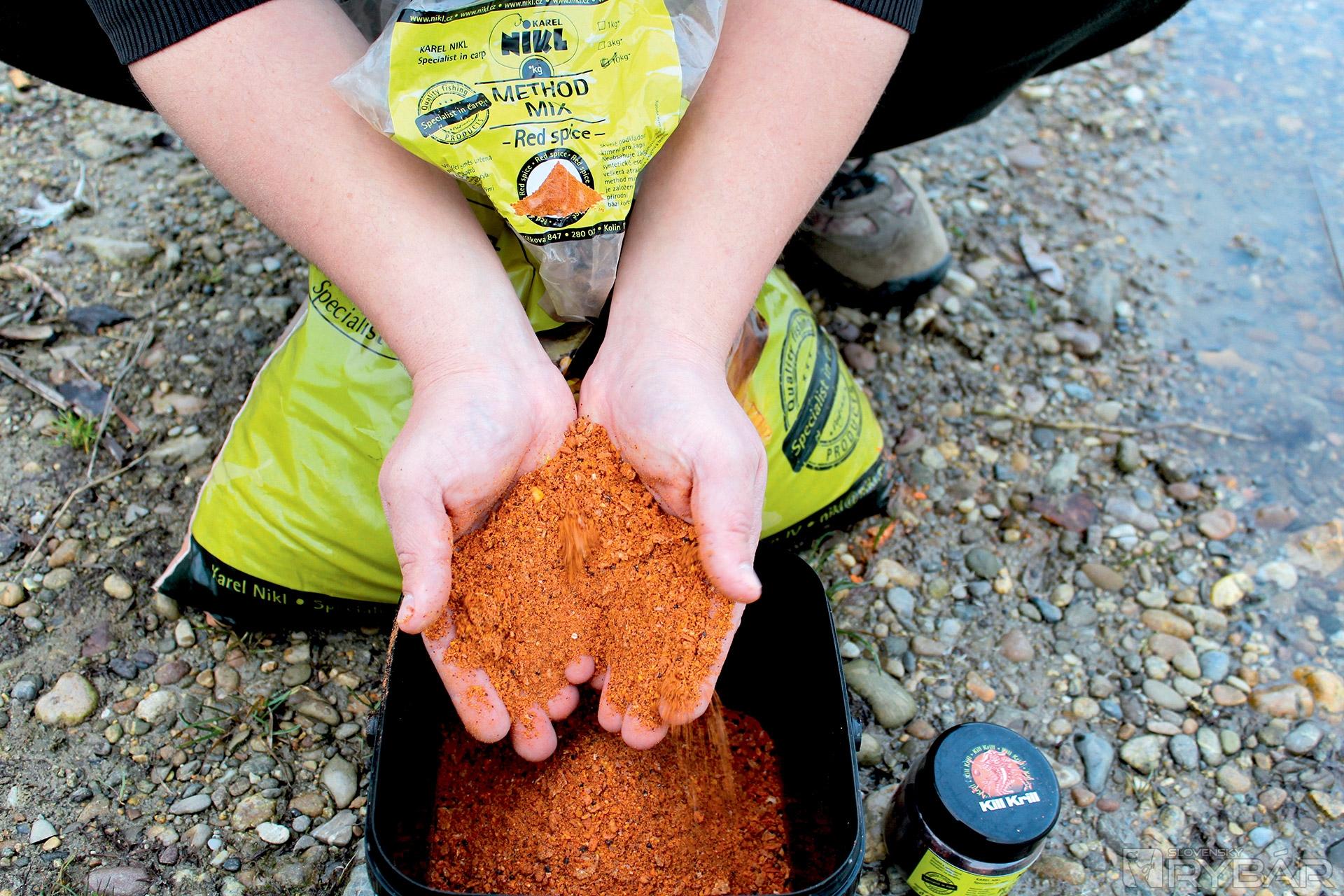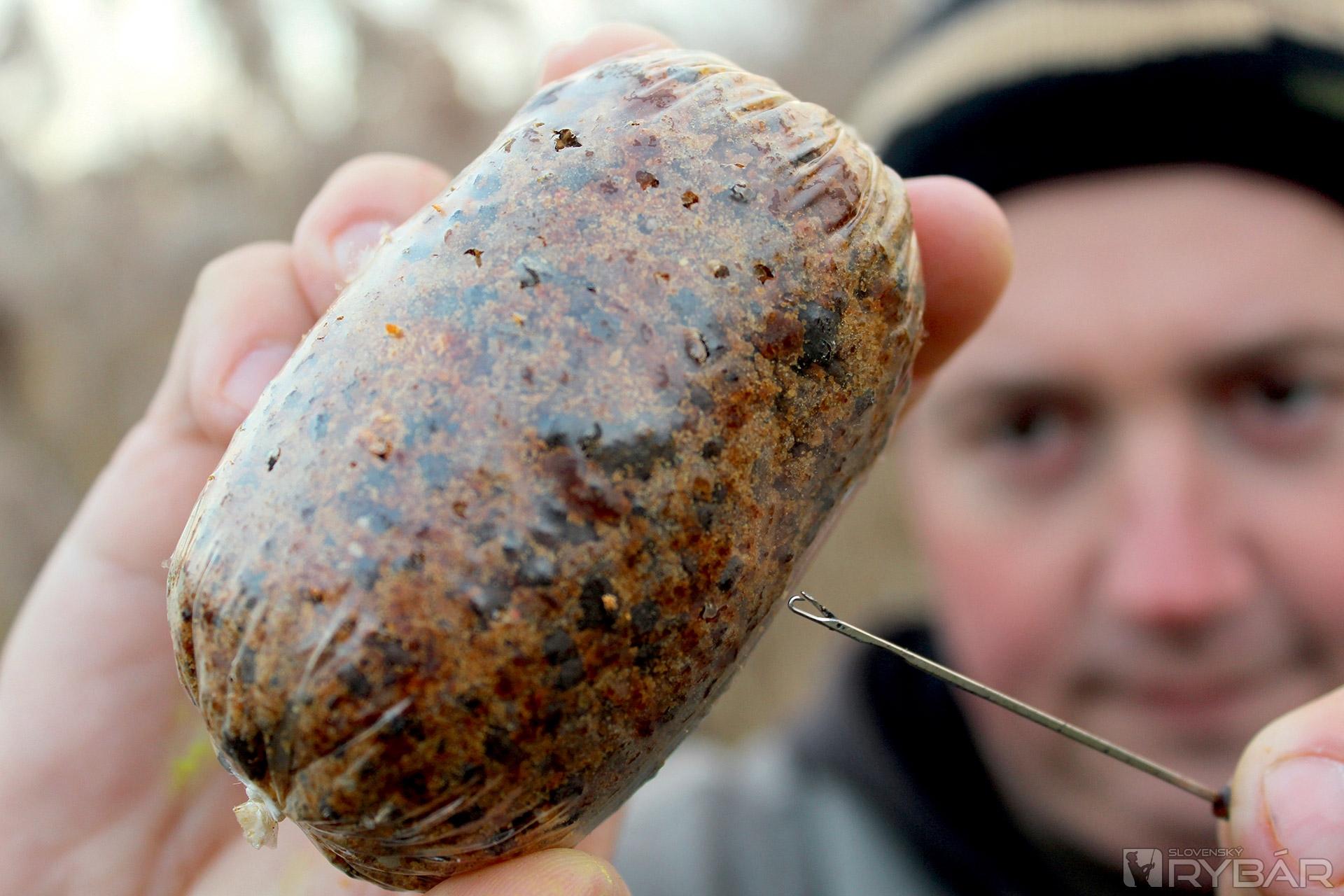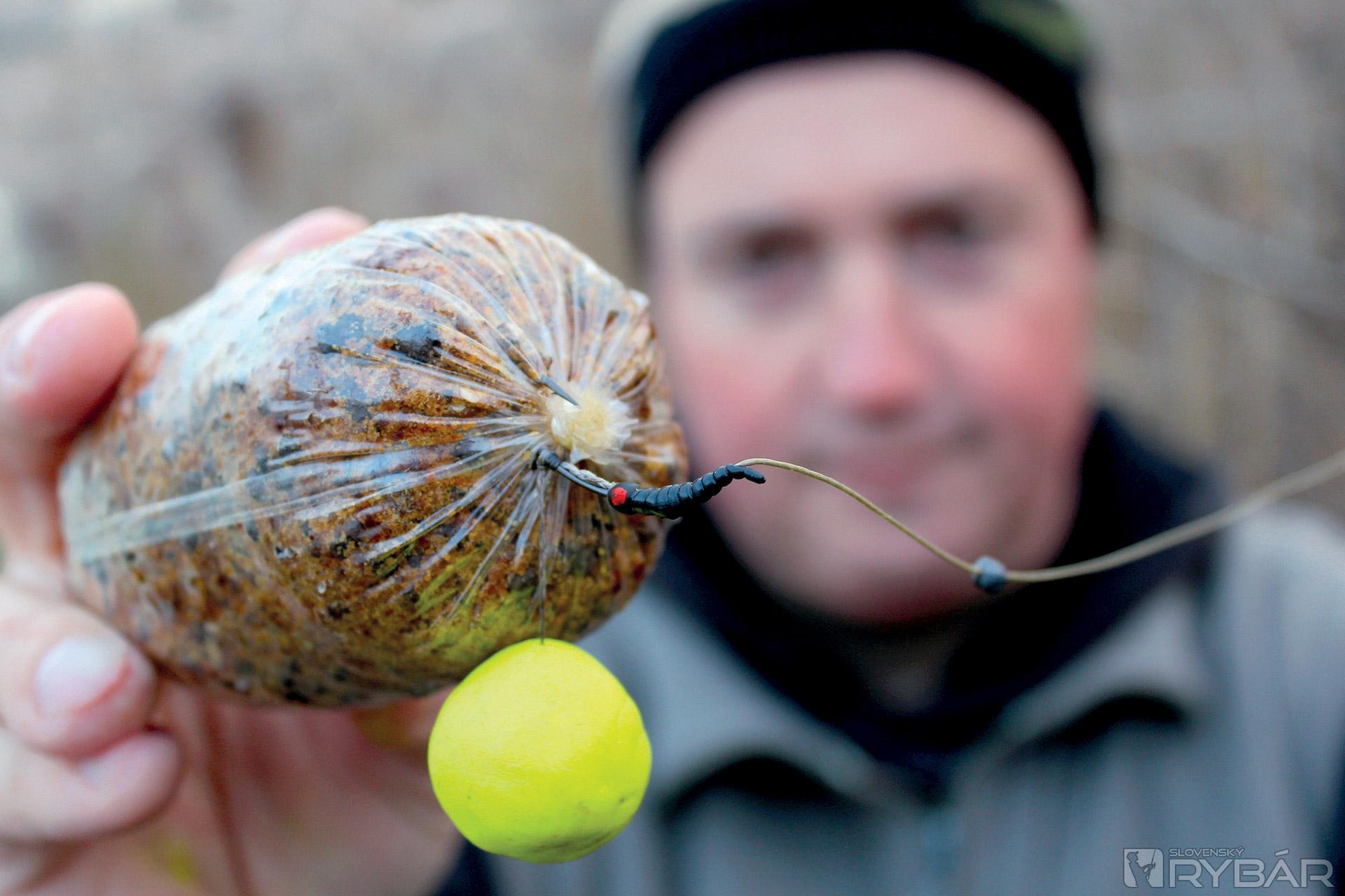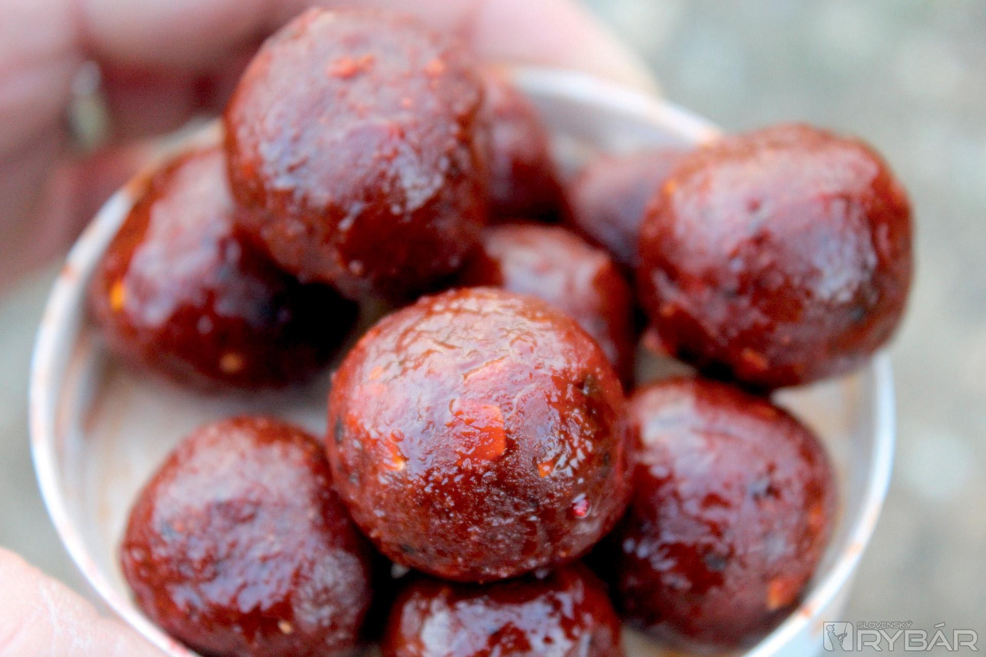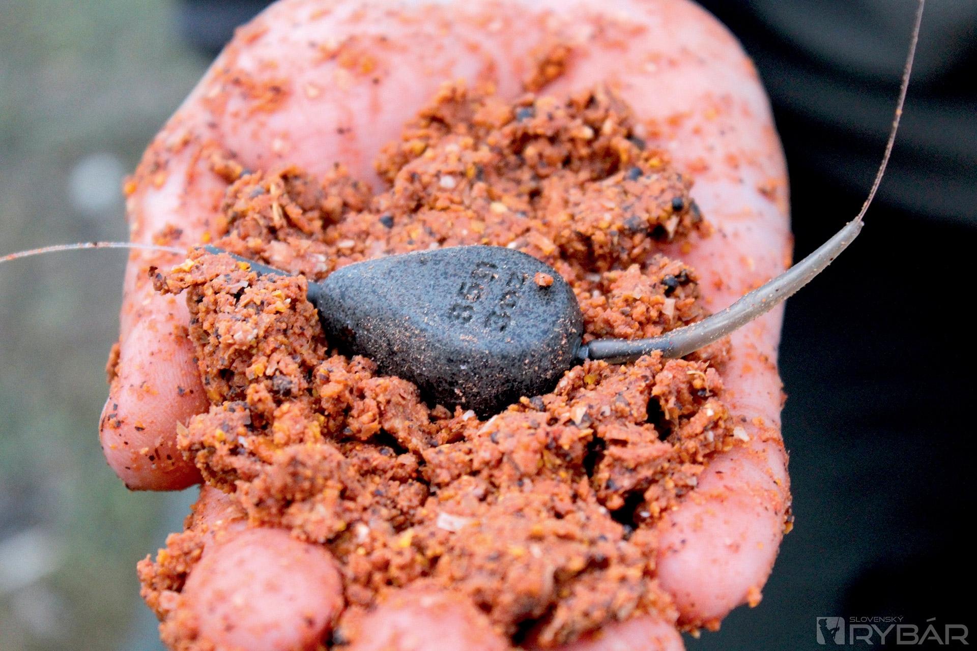 Ďalej napichujem priamo na háčik pripravené PVA vrecúško z drveného boilies, peliet a method mixu Red Spice. Všetko je ešte preliate boostrom KrillBerry a môže to smerovať do vody. Na druhú montáž nastražujem malý 14 mm Pop-Up Kill Krill a obaľujem ho do Pop-Up Ready pasty Ananás, ktorú testujeme celú sezónu a ešte ma ani raz nesklamala. Tu nepridávam PVA vrecko, ale okolo olova obaľujem jemnú vrstvu krásne voňavého Red Spice Method Mixu zmiešaného s troškou vody a boostrom Krillberry a; aj táto montáž letí do vody.