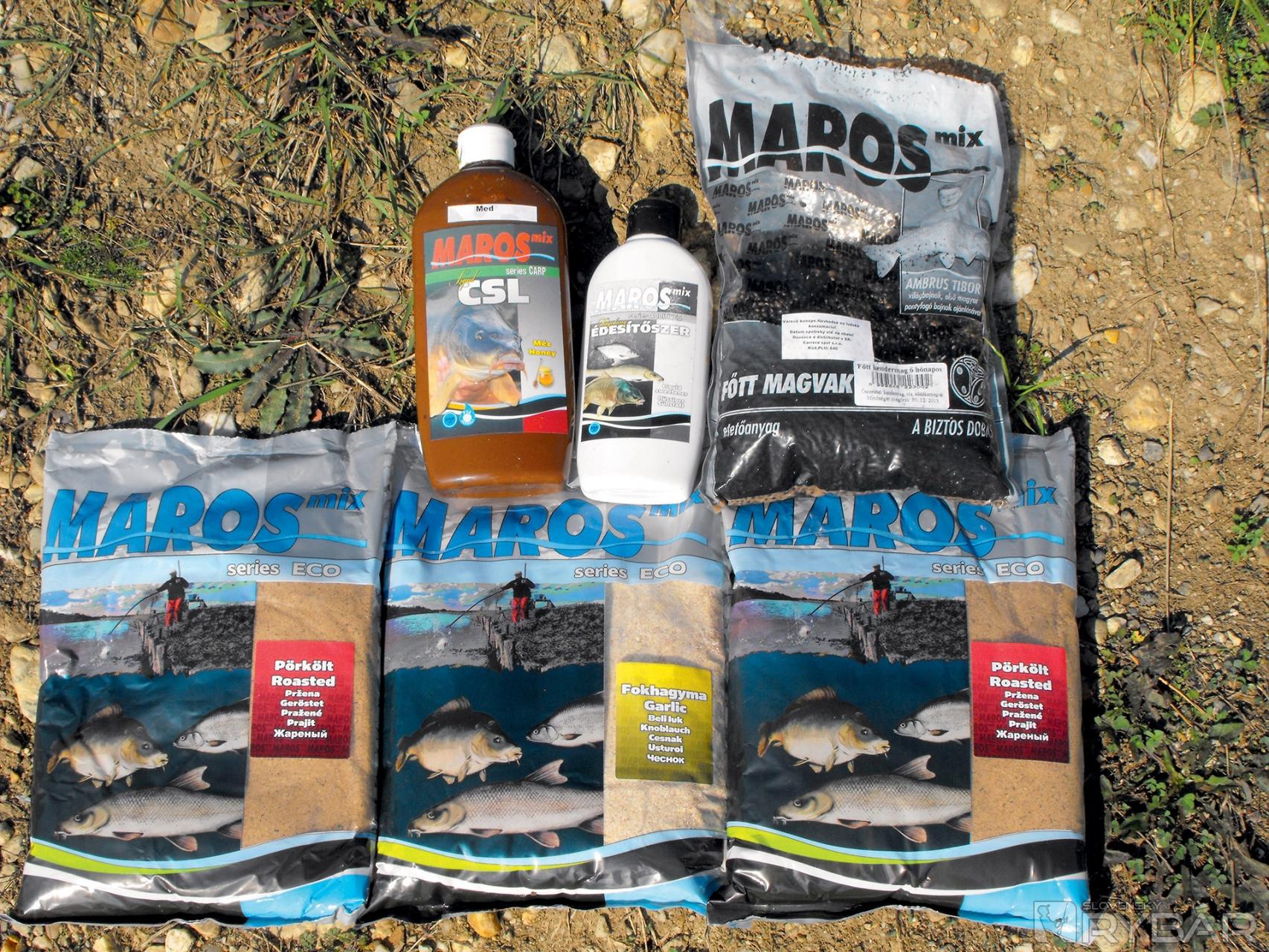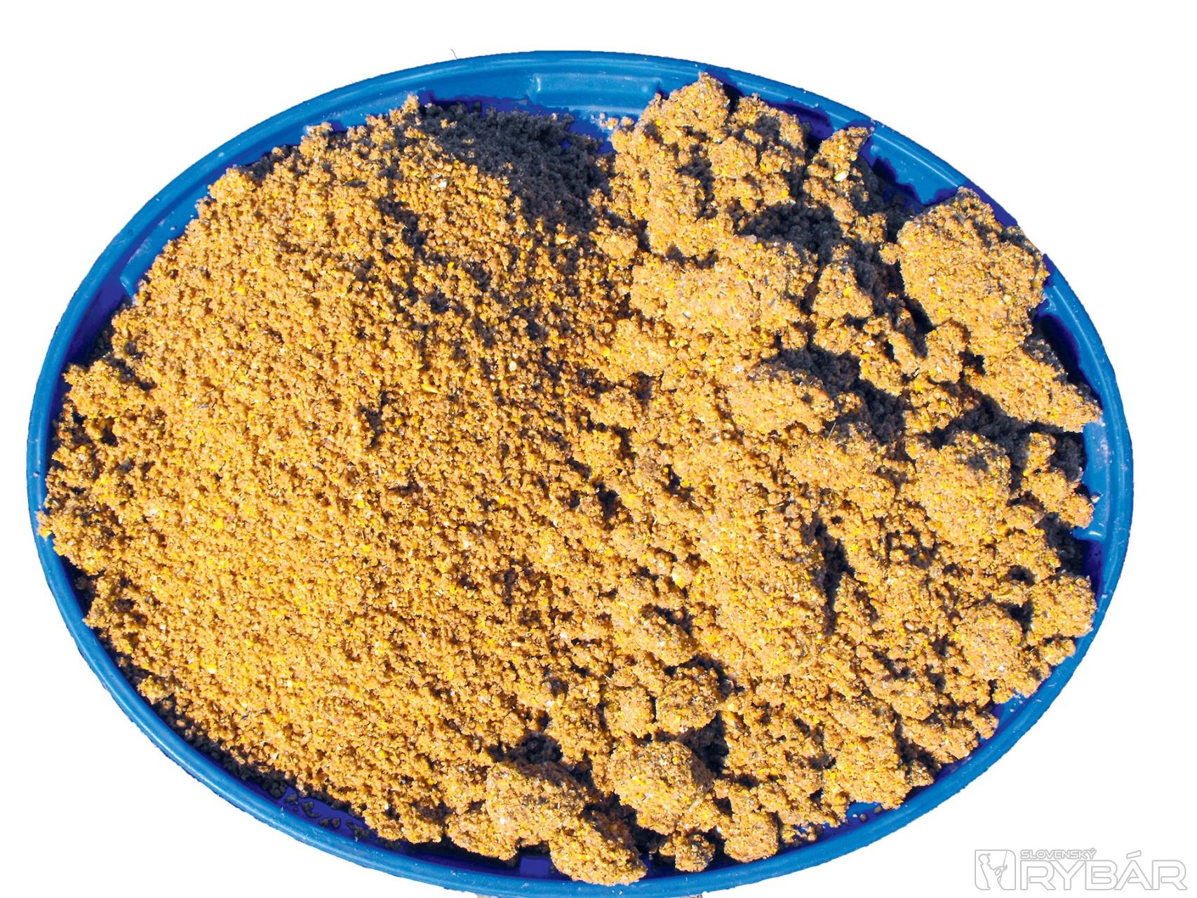 Na cielený lov karasov už mám svoju rokmi osvedčenú receptúru a používam dve rozličné príchute krmív. Na dnešný lov som namiešal najlacnejšie krmivá z ponuky Maros Mixu a to so série Eco pražené a cesnak. Tieto dve krmivá sa spolu dobre miešajú, výborne sa dopĺňajú a príjemne voňajú. Pomiešal som 2 kg krmiva pražené a 1 kg krmiva cesnak. Takto som dostal celkom tmavohnedé krmivo s vôňou cesnaku a pražených semiačok. Do malého vedierka som nabral približne pol litra vody z jazera, pridal tekuté sladidlo a kukuričný likér. Túto tekutinu som postupne nalieval na suché krmivo a postupne miešal. Keď z toho vznikla požadovaná konzistencia, tak som krmivo nechal odstáť asi na 10 minút a medzitým som si rozložil prút, stoličku...