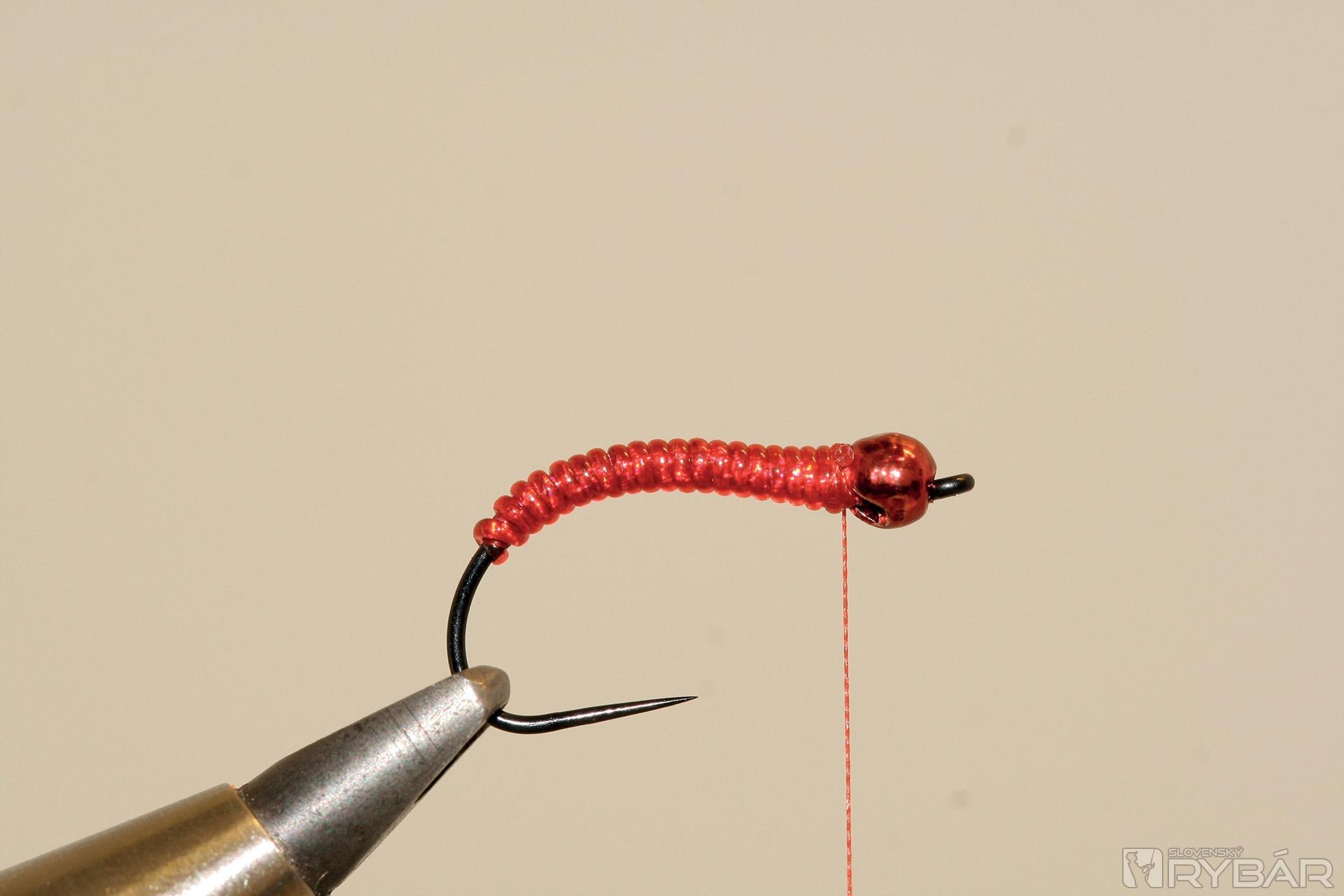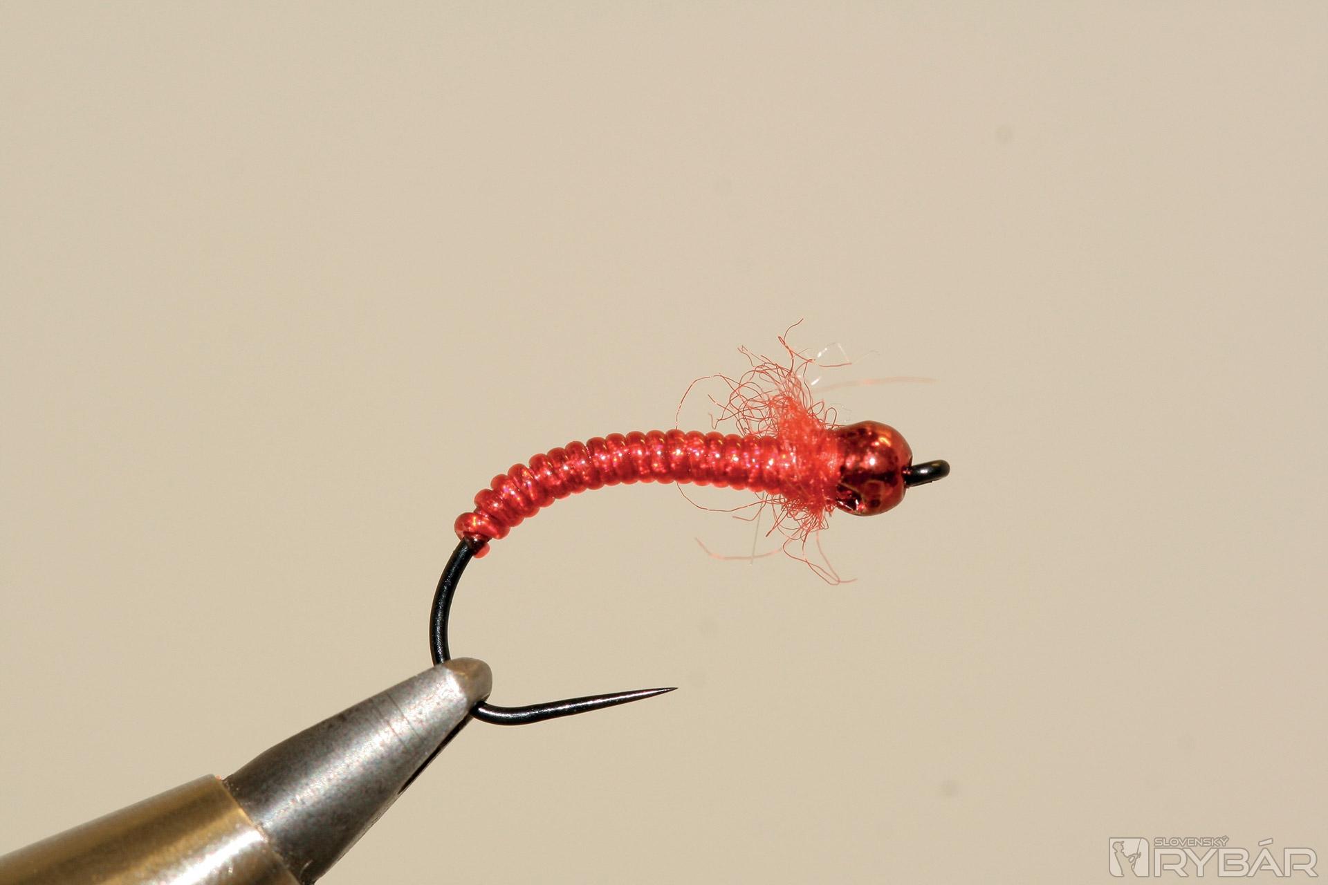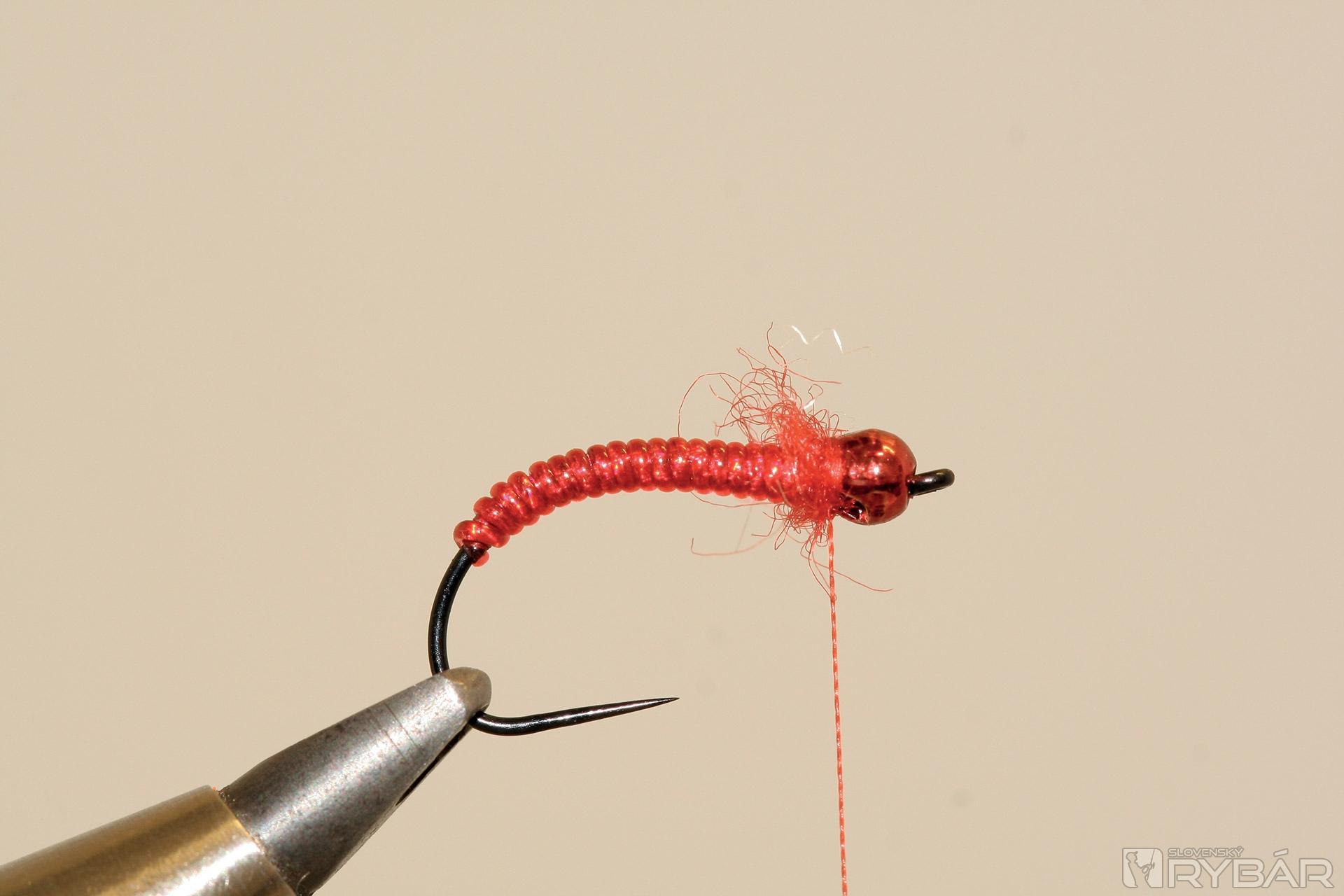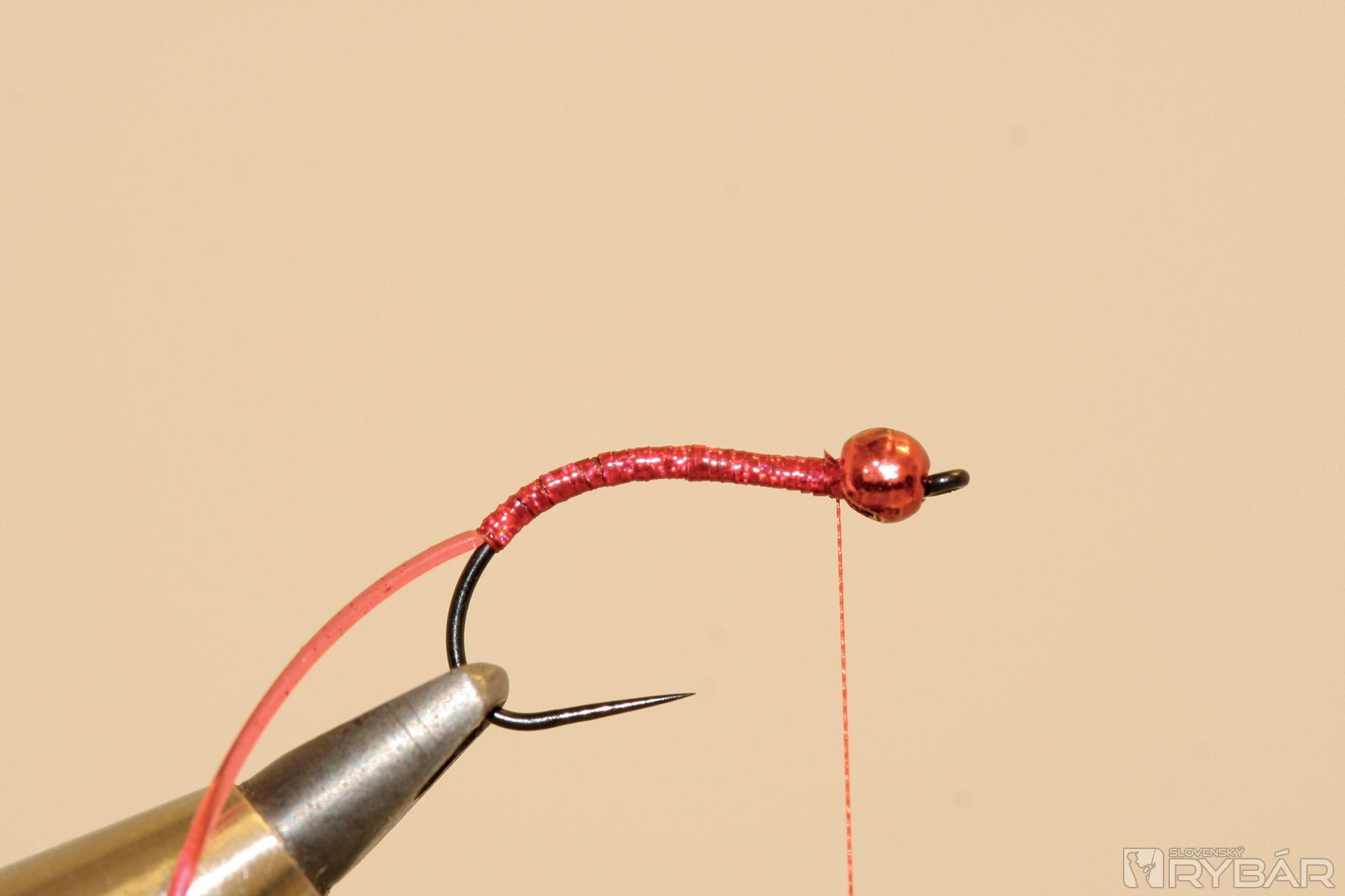 háčik (TMC 206 BL), volfrámová guľôčka, červená viazacia niť, červená lesklá lametka, červený bodyglass, červený syntetický dabing.