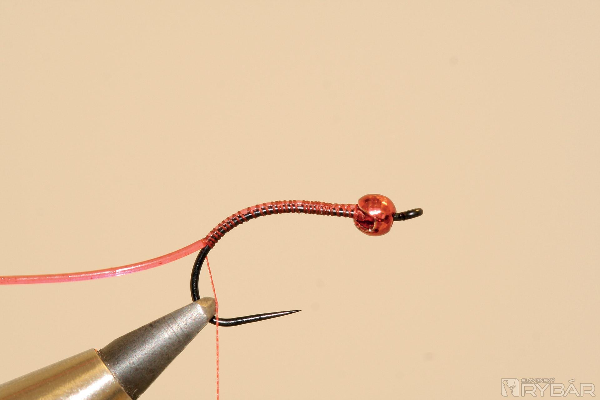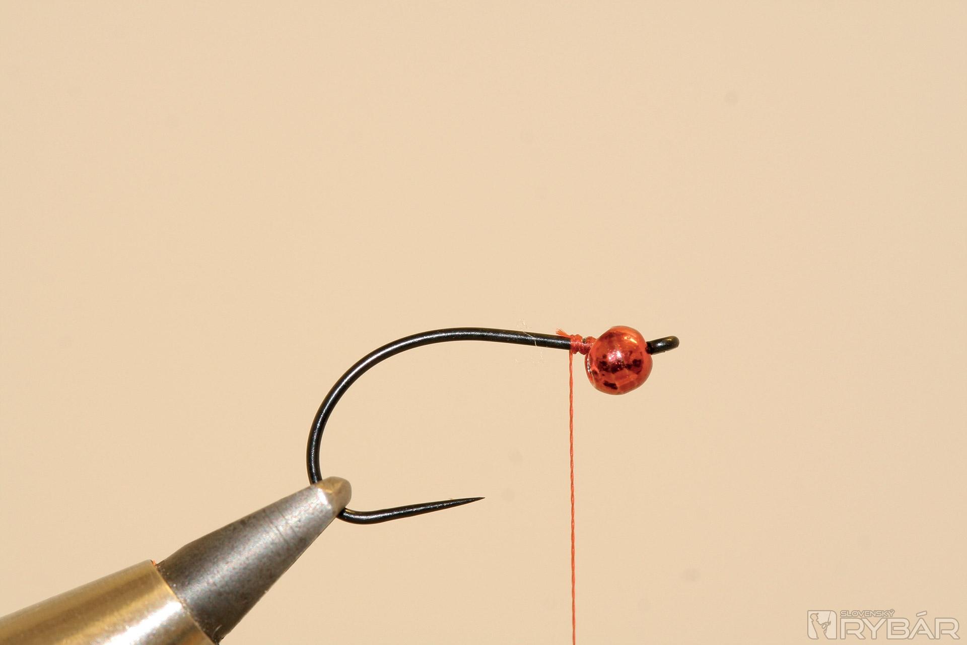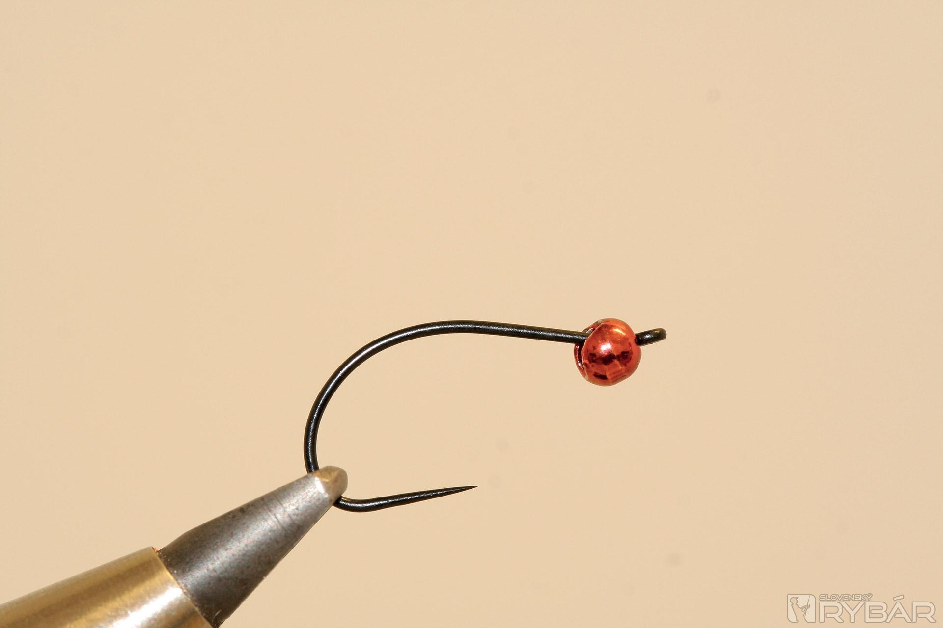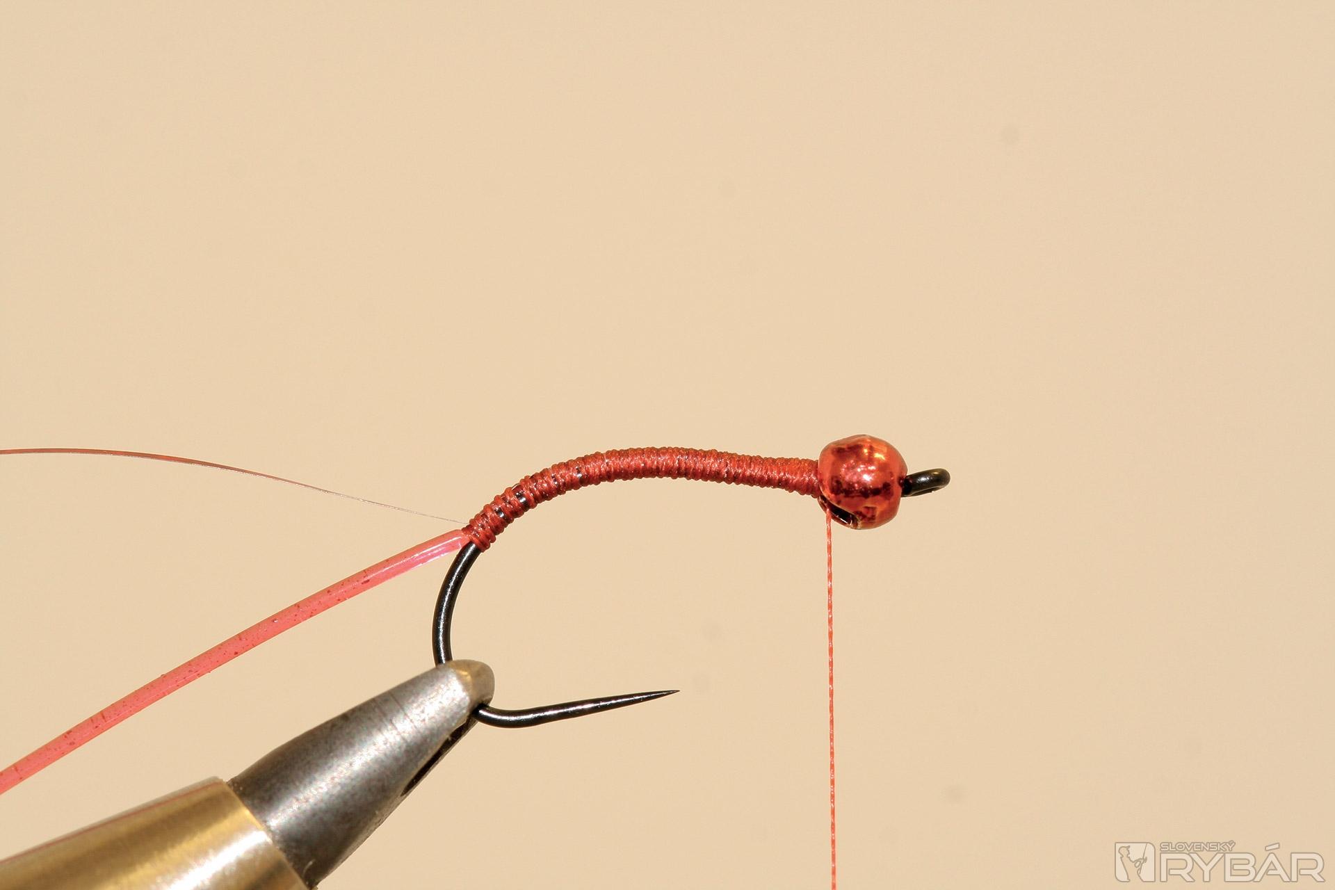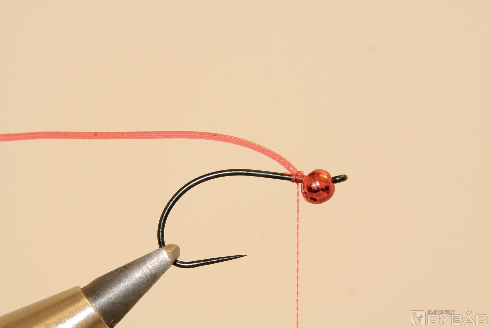 háčik (TMC 206 BL), volfrámová guľôčka, červená viazacia niť, červená lesklá lametka, červený bodyglass, červený syntetický dabing.