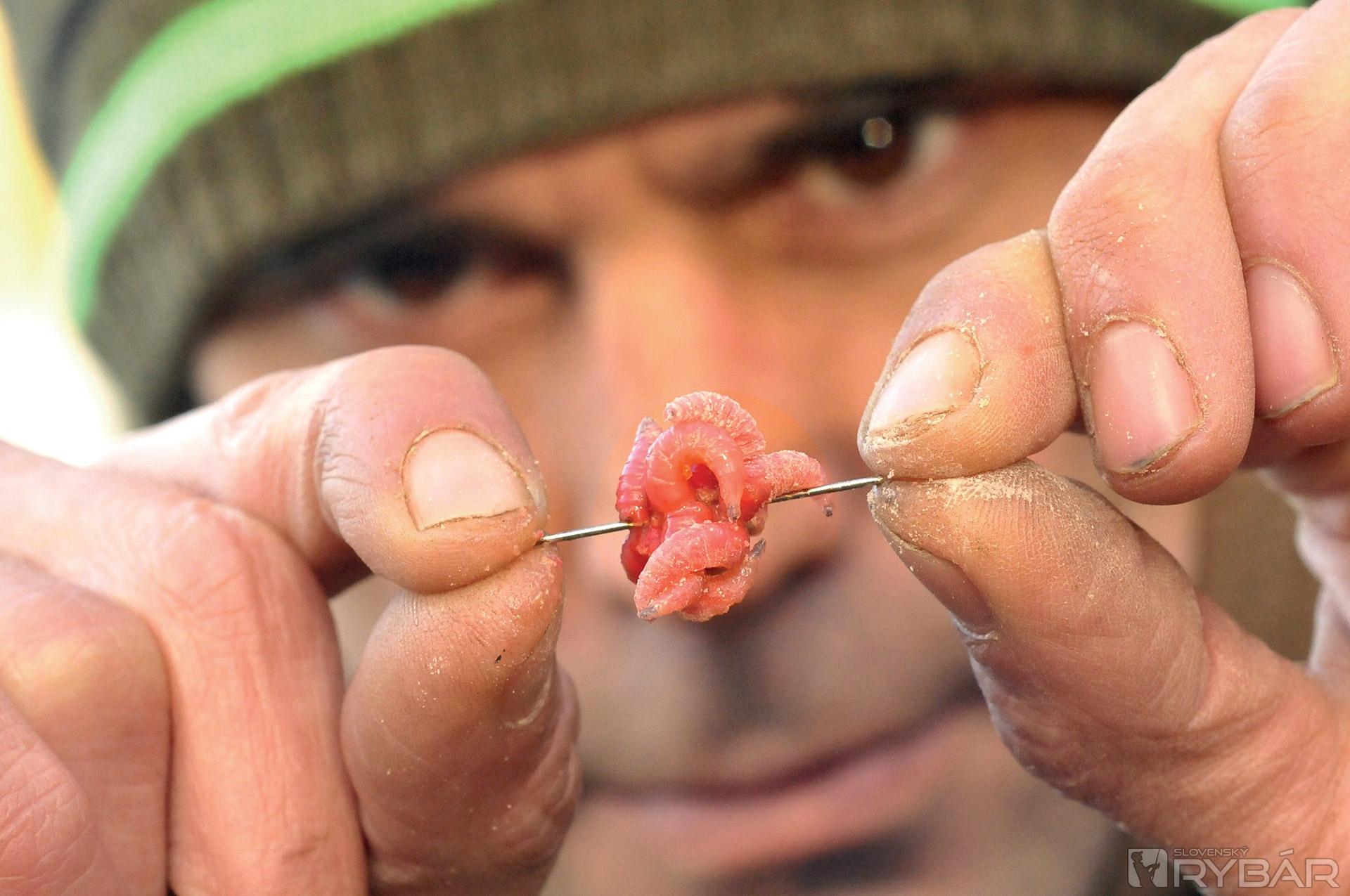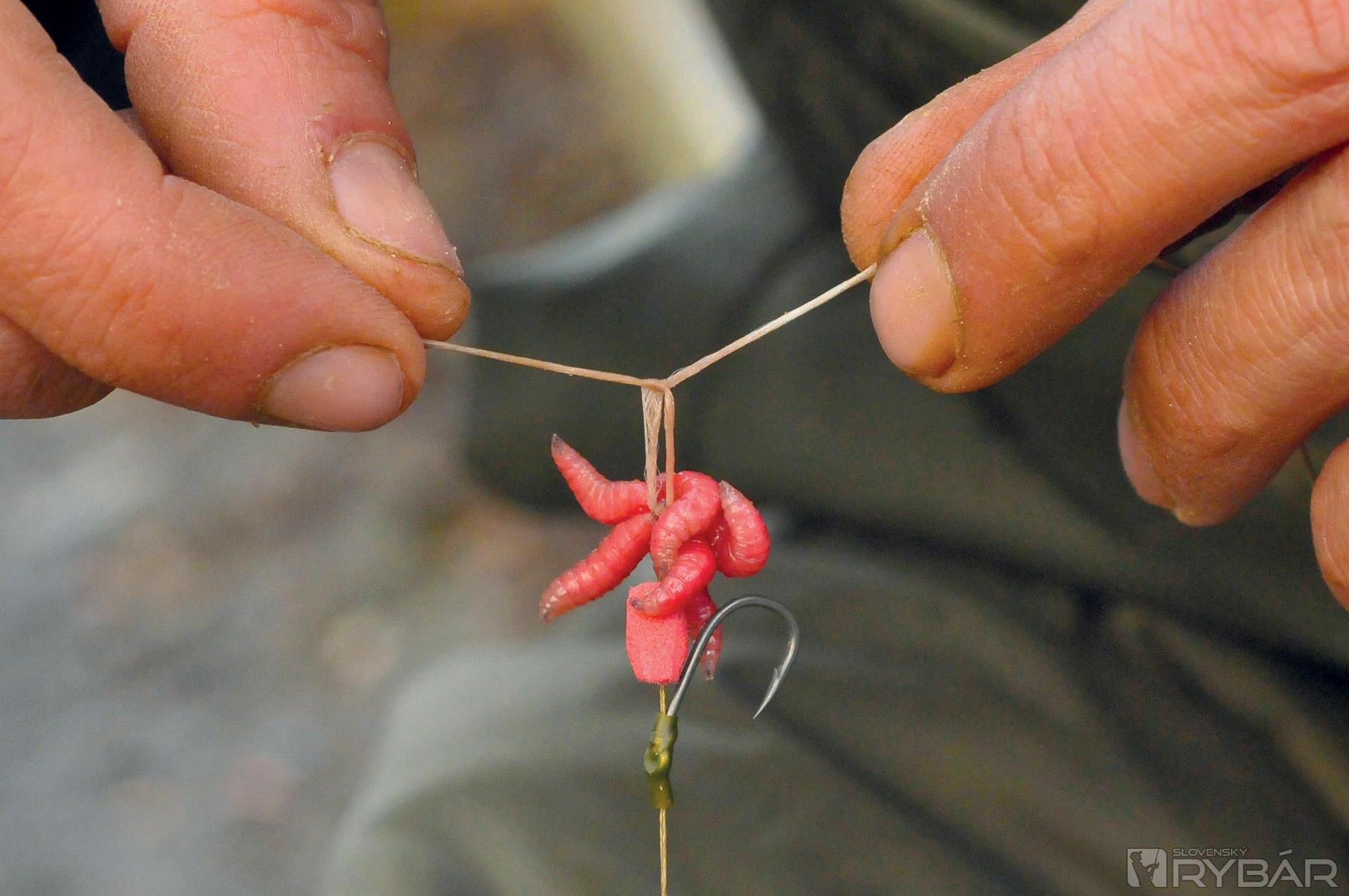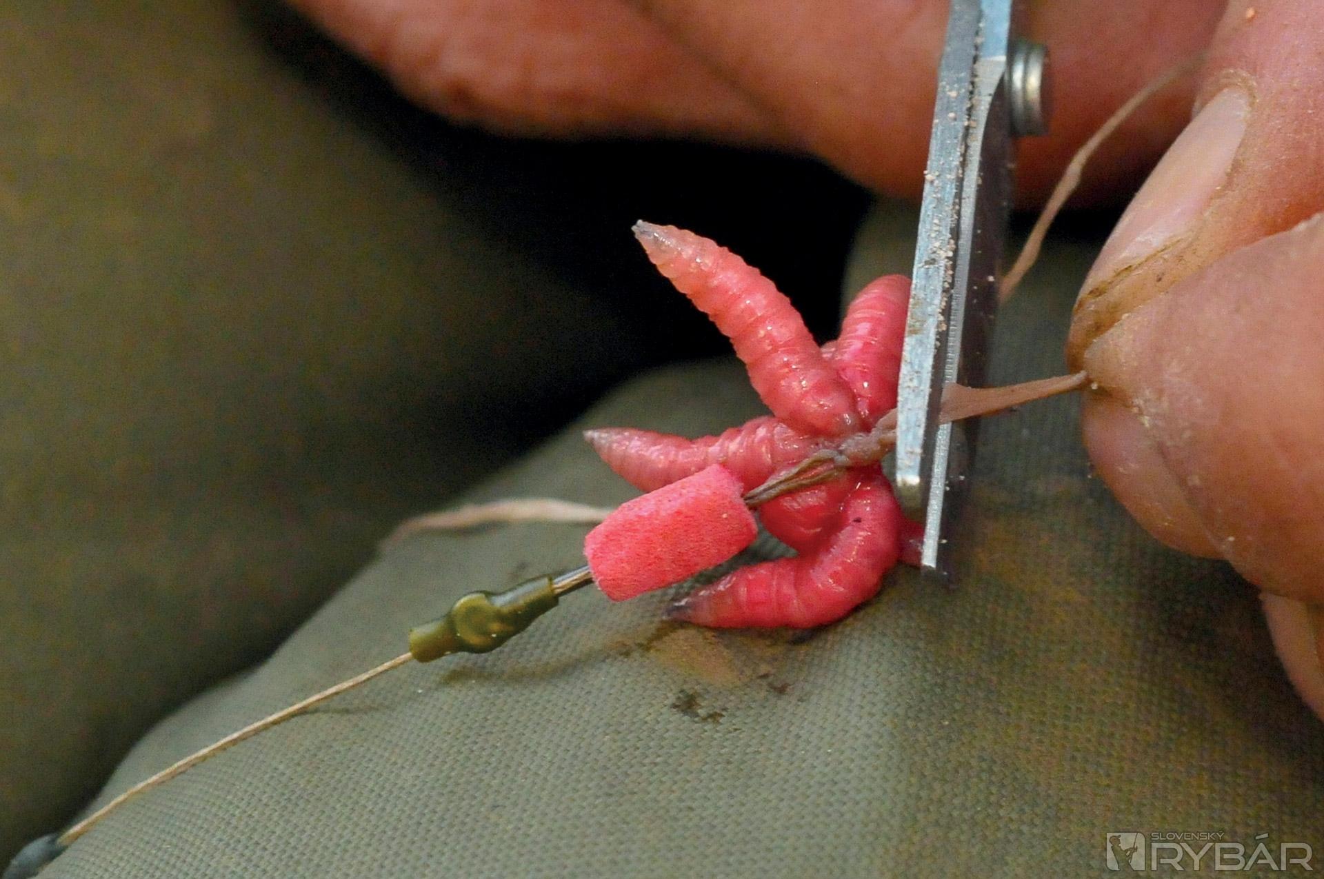 Keď navliekam červy, dávam ich tam od 11 do 14 kusov. Nikdy však nie 13, to prináša nešťastie a ja som poverčivý. Niektorí ľudia preferujú poriadne hrče červov, ja však nie. Uprednostňujem také množstvo, aby rybu upútalo, ale nie také, aby to vyzeralo čudne. Nástraha musí vyzerať tak, aby sa prirodzene vznášala a hýbala nad dnom, alebo nad návnadou. Rád používam túto montáž v spojení s kúskom rozpustnej peny a malou PVA pančuškou. Keď zhotovujem PVA pančušku, vždy ju najprv naplním kúskom rozdrobených boilies, až potom vkladám kostniaky. Návnady dávam naozaj málo, celá PVA pančuška býva veľká asi ako golfová loptička.