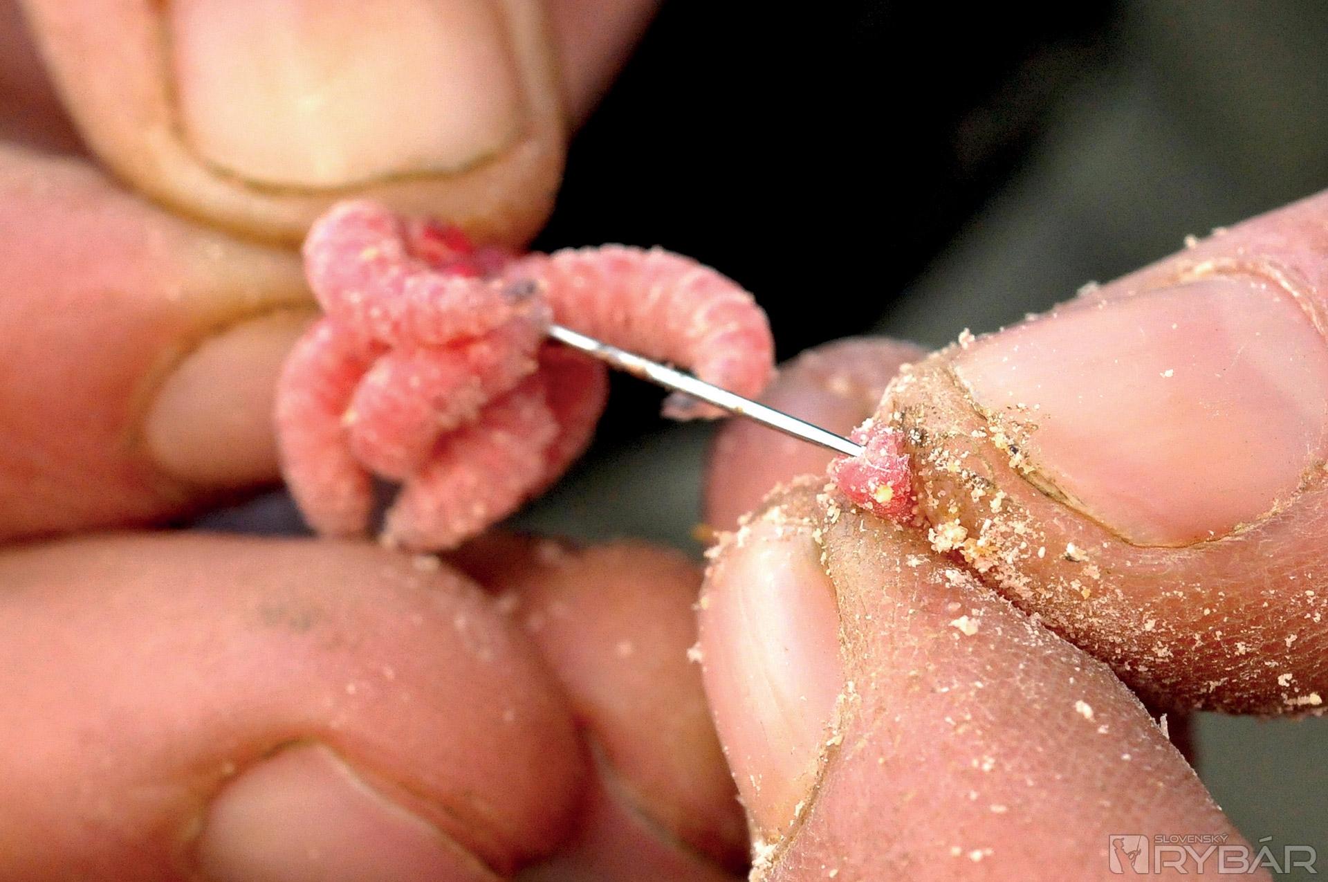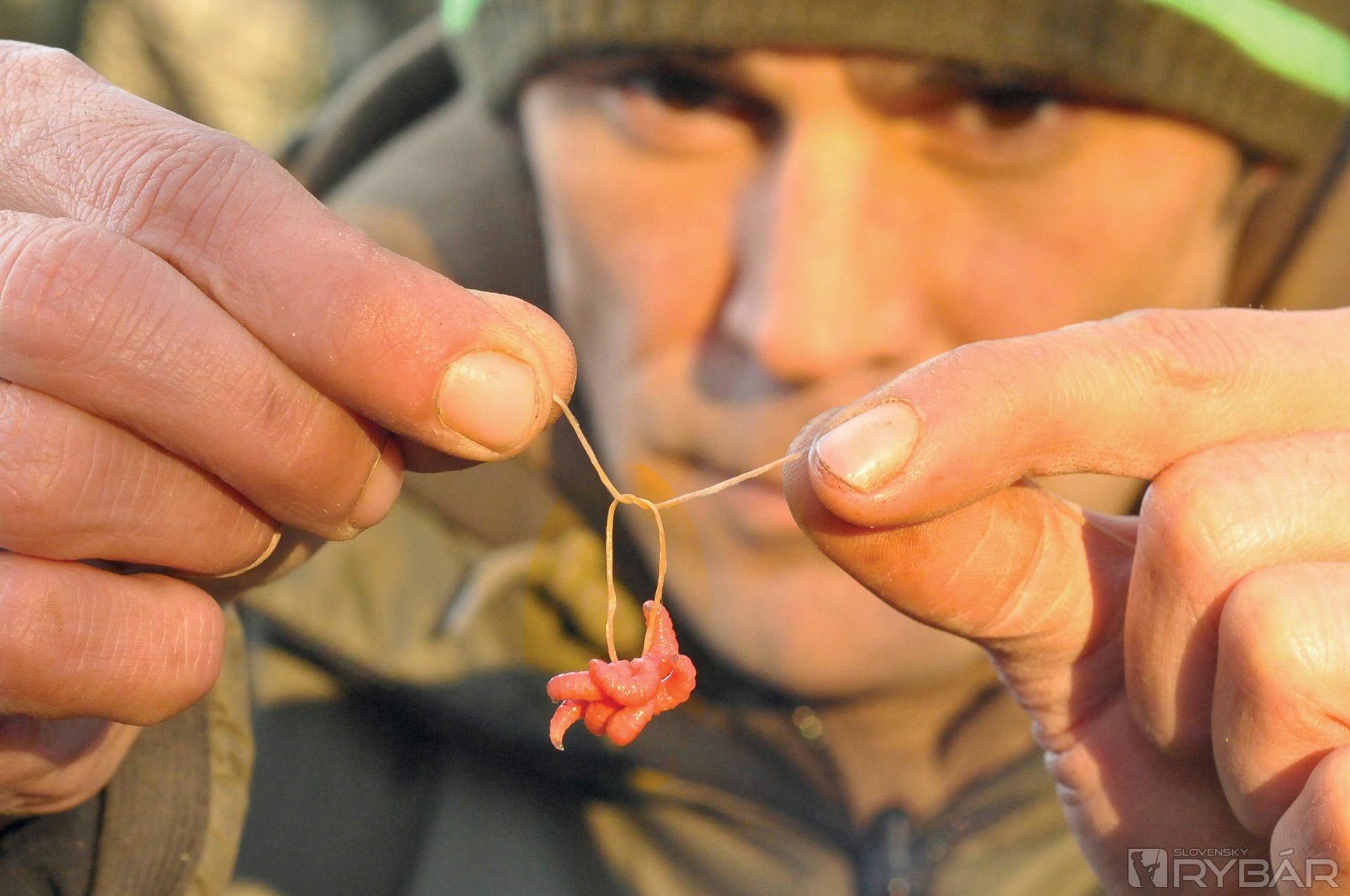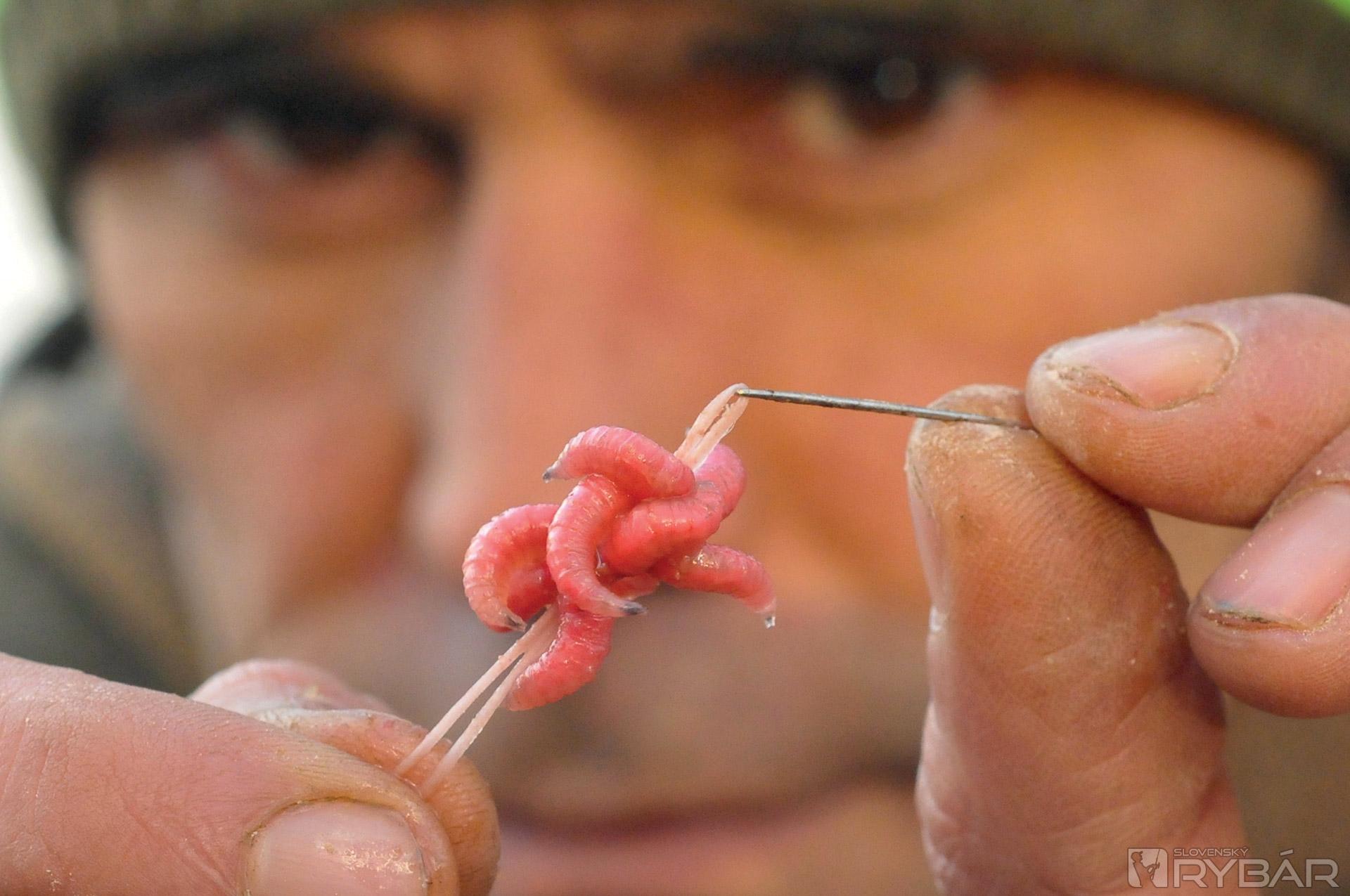 Keď navliekam červy, dávam ich tam od 11 do 14 kusov. Nikdy však nie 13, to prináša nešťastie a ja som poverčivý. Niektorí ľudia preferujú poriadne hrče červov, ja však nie. Uprednostňujem také množstvo, aby rybu upútalo, ale nie také, aby to vyzeralo čudne. Nástraha musí vyzerať tak, aby sa prirodzene vznášala a hýbala nad dnom, alebo nad návnadou. Rád používam túto montáž v spojení s kúskom rozpustnej peny a malou PVA pančuškou. Keď zhotovujem PVA pančušku, vždy ju najprv naplním kúskom rozdrobených boilies, až potom vkladám kostniaky. Návnady dávam naozaj málo, celá PVA pančuška býva veľká asi ako golfová loptička.