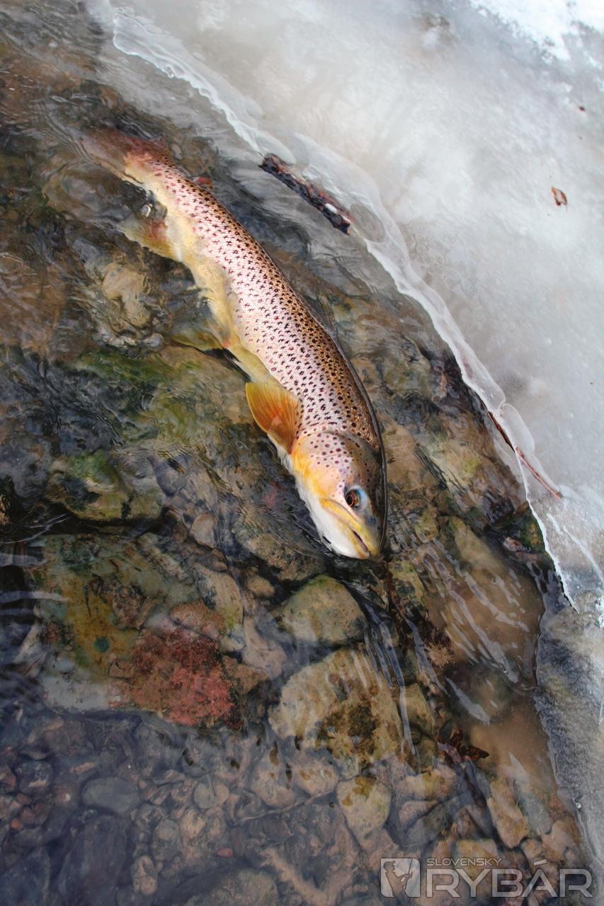 Stretnutie mi dodalo úplne novú silu, hrial ma pocit radosti. Nedalo sa mi odísť od vody. Akoby aj mráz na chvíľu poľavil. Na končekoch prstov som prestal cítiť chlad – „zostala len bolesť“. Tak toto je už naozaj posledný hod, stále som si opakoval… Nakoniec ma nepretržitá séria posledných hodov skutočne odmenila. Na konci šnúry sa niečo pohlo. Asi podustva, alebo mrena sa zachytila za bok, pomyslel som si. Ba ani vtedy, keď sa krásny, takmer polmetrový potočák objavil na hladine, nedochádzalo mi, čo sa vlastne deje. Až keď prudko vyrazil dolu prúdom a šnúra cez zamrznuté očká prskala kúskami ľadu, pochopil som. Tak predsa, aj v takejto zime ryby berú! Udica sa prehýba do neuveriteľných kriviek, no nadväzec stále drží. Toto nemá so zdolávaním nič spoločné. Je to lotéria, kto viac vydrží, čo povolí… Po chvíli, zdá sa, že mám mierne navrch a priťahujem pstruha bližšie. Vlastne cúvam dozadu, pretože so zamrznutou šnúrou ani nepohnem. Navijak je úplne zbytočný. Pstruha dostávam na plytčinu, rýchlo fotím a púšťam späť na slobodu. Orava, ďakujem. Ešte chvíľu sa prechádzam okolo vody. Nemôžem sa nabažiť zimnej krásy. Cestou domov zastavujem na svojich obľúbených miestach, robím pár fotiek. Posledná tohtoročná rybačka, rozlúčka s riekou. Je smutná, ale krásna.