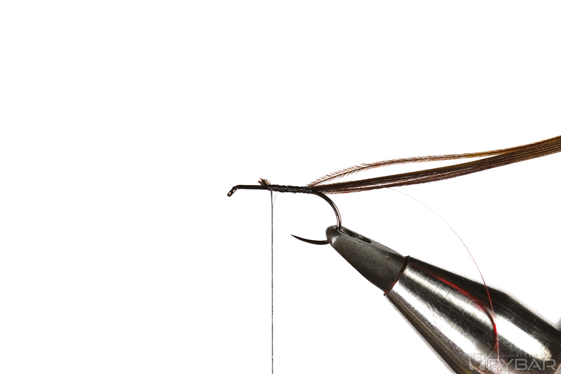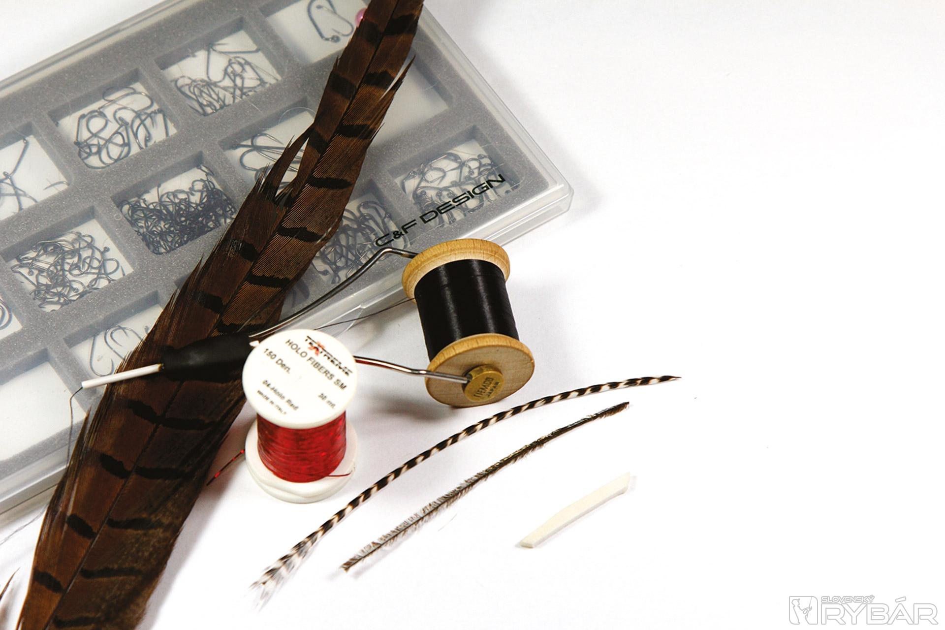 Malý suchý háčik, čierna viazacia niť, červená lametka, pero z bažanta, grizzly pierko, biely polycelón, pero z páva.