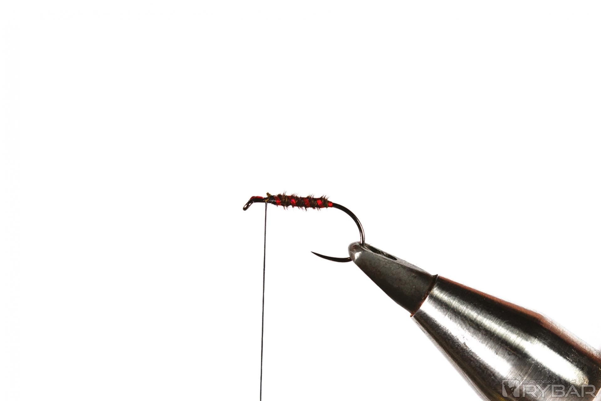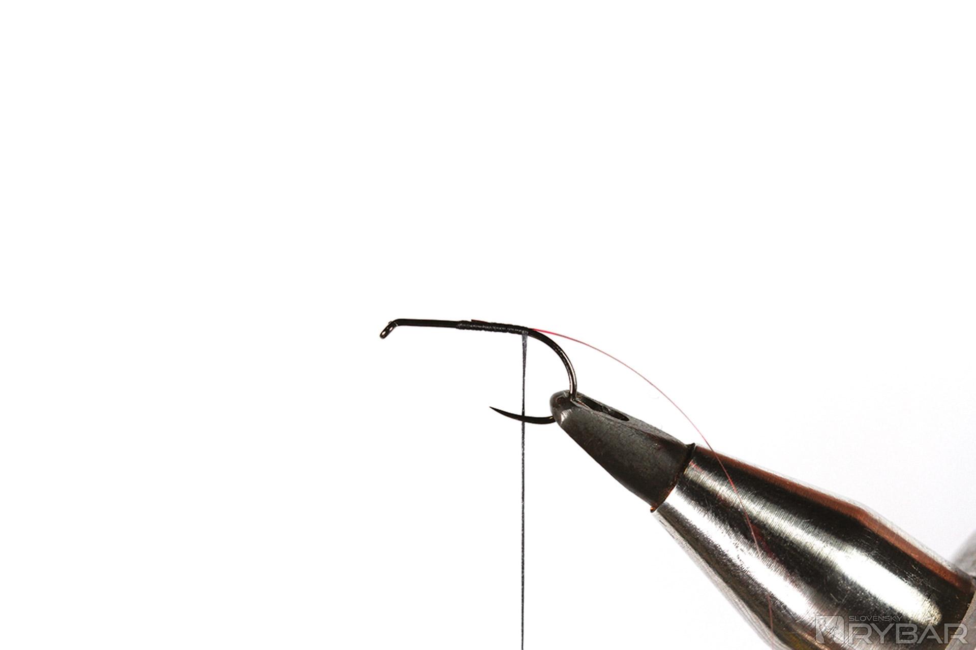 1. Háčik si upneme do zveráčika a naviažeme červenú lametku.