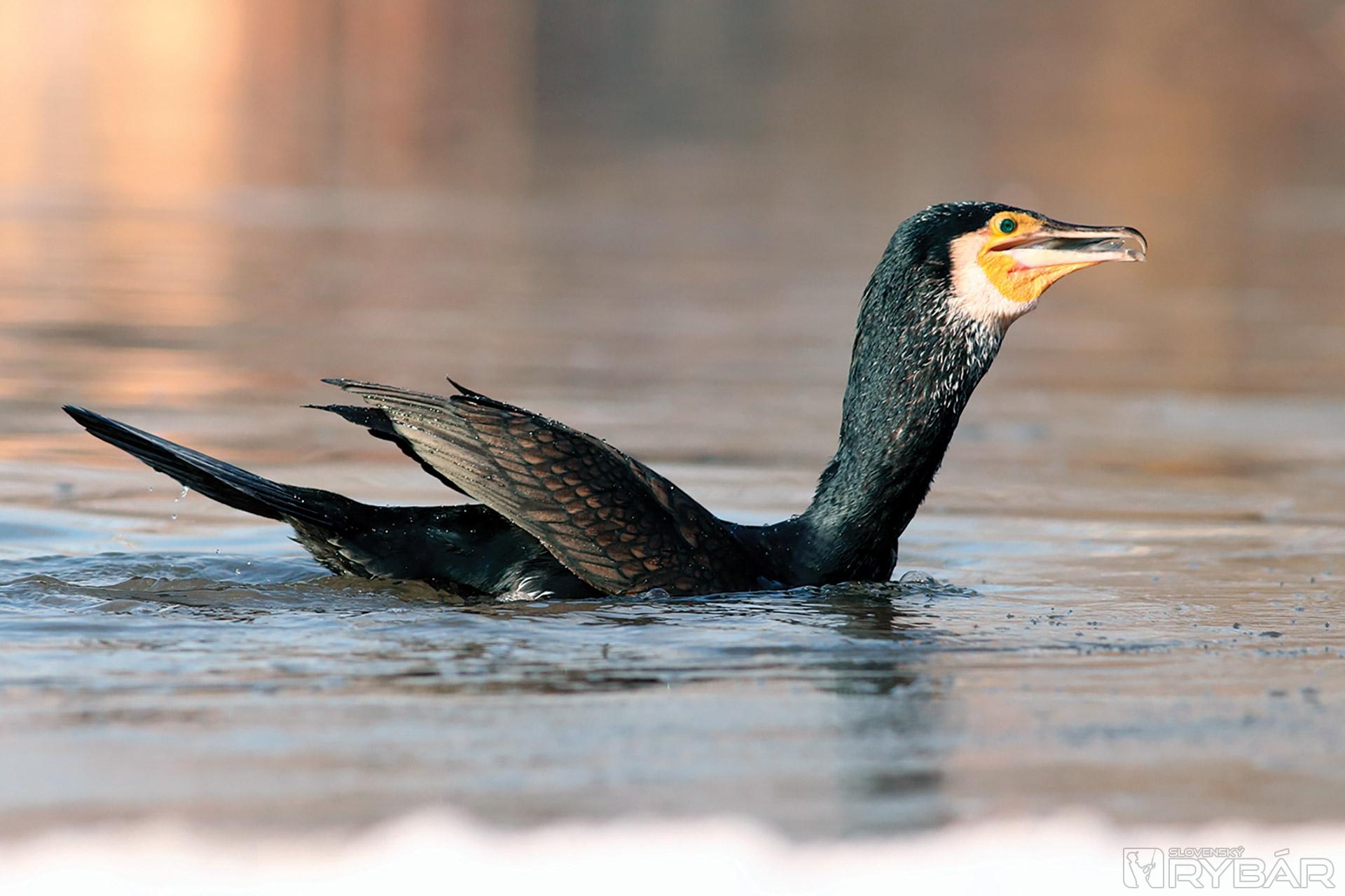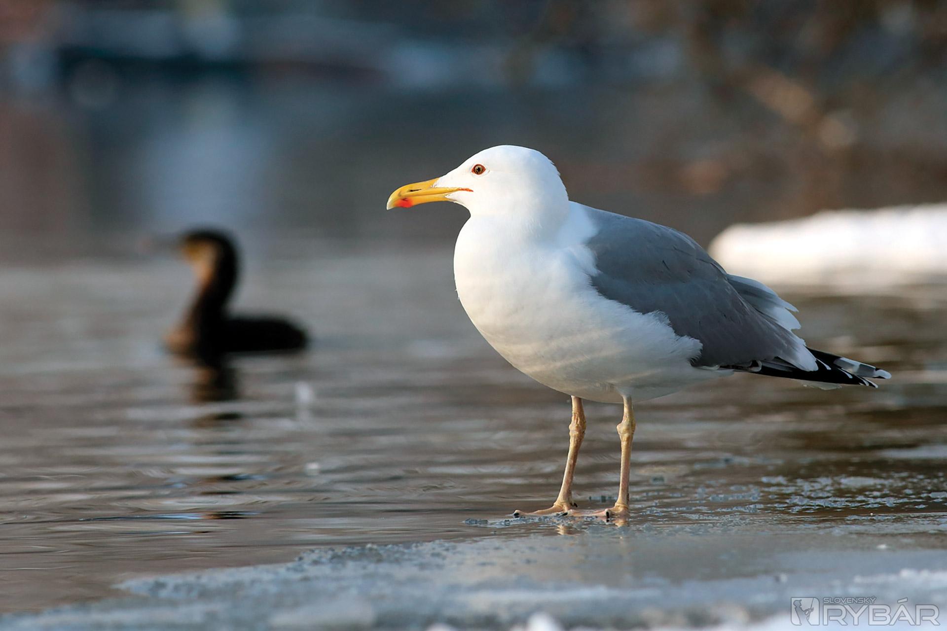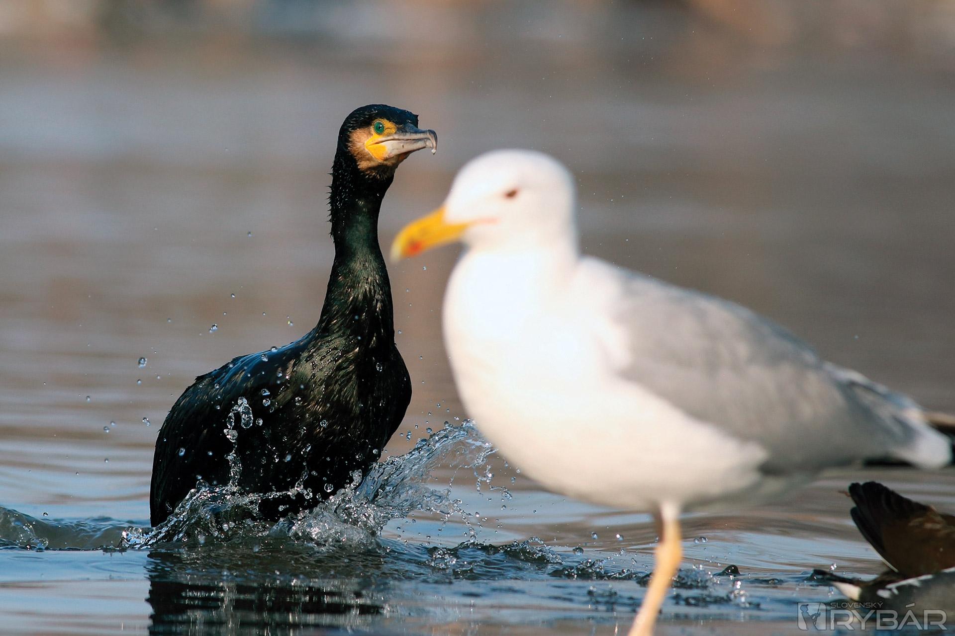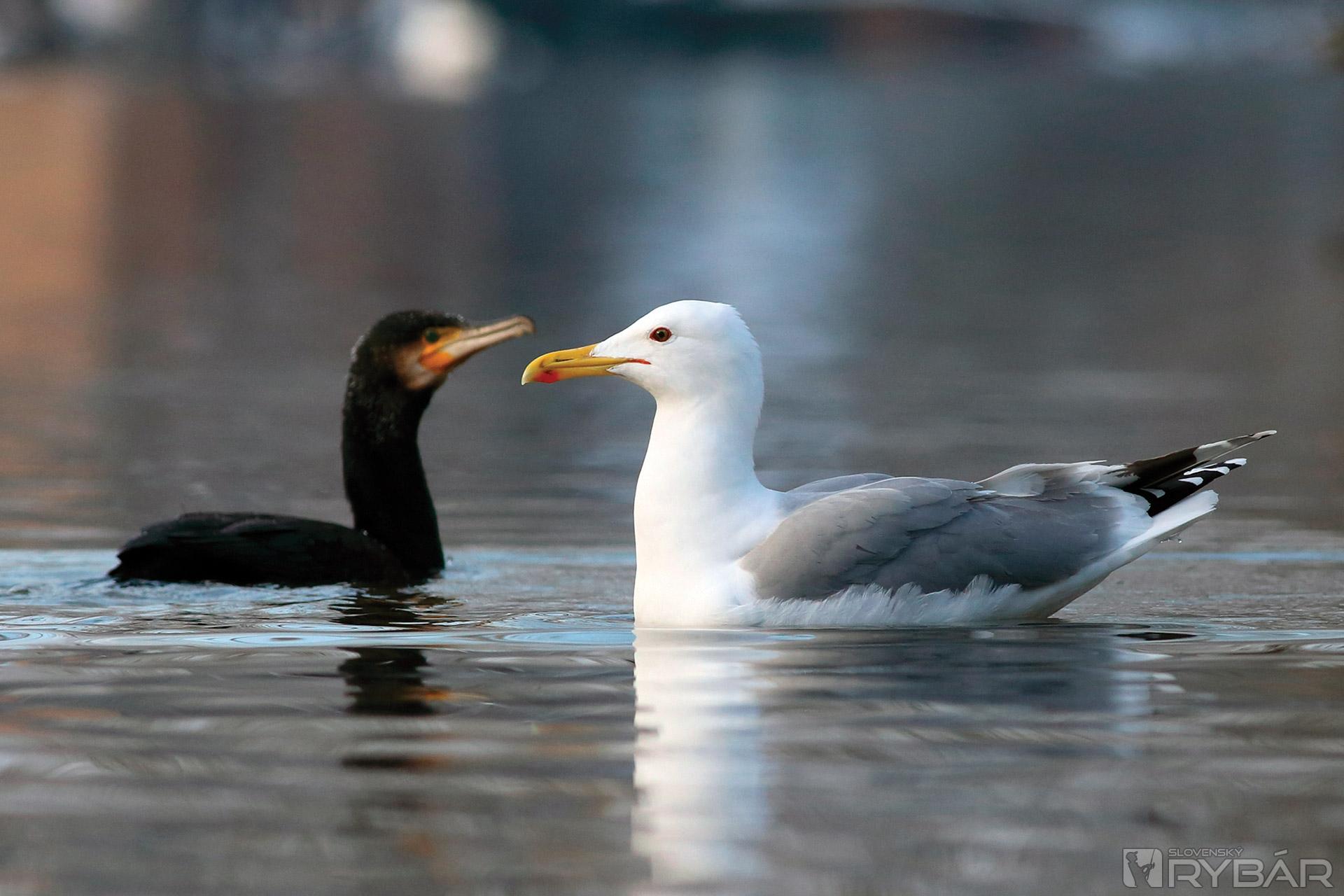 V mrazivom ráne sa na hladine rieky objavujú dvaja lovci – kormorán a čajka.