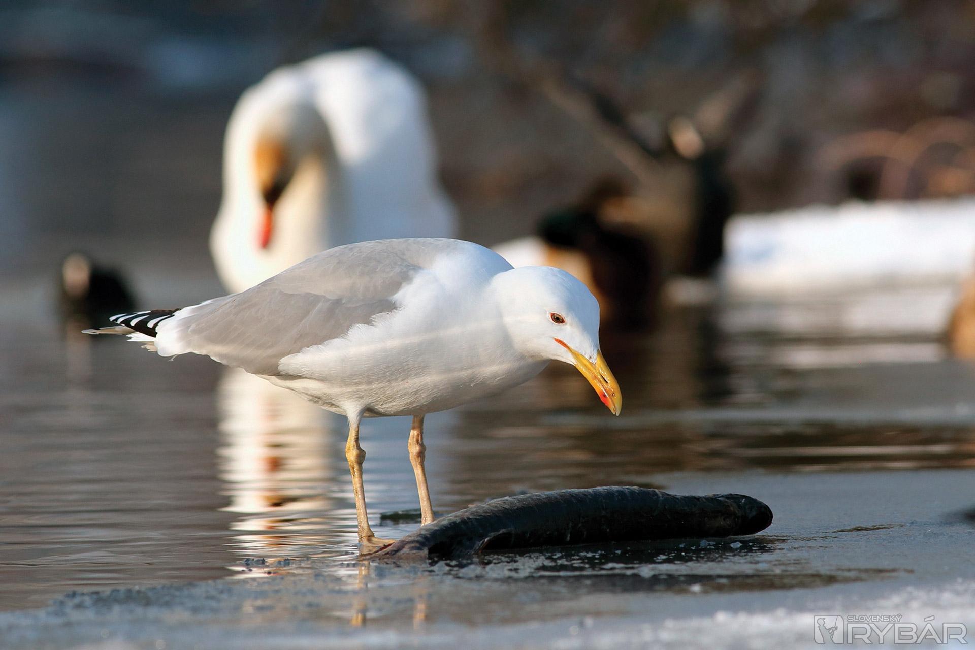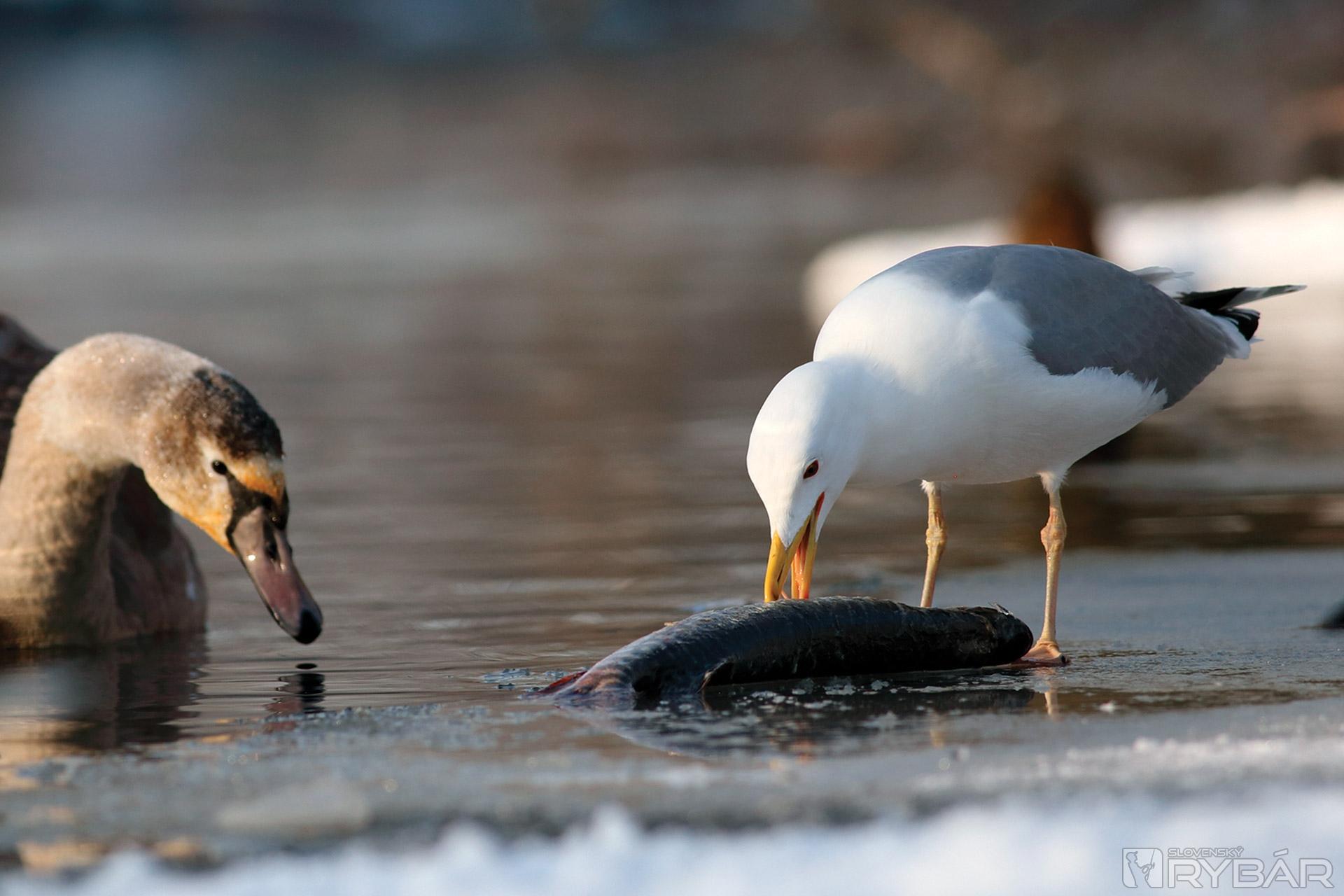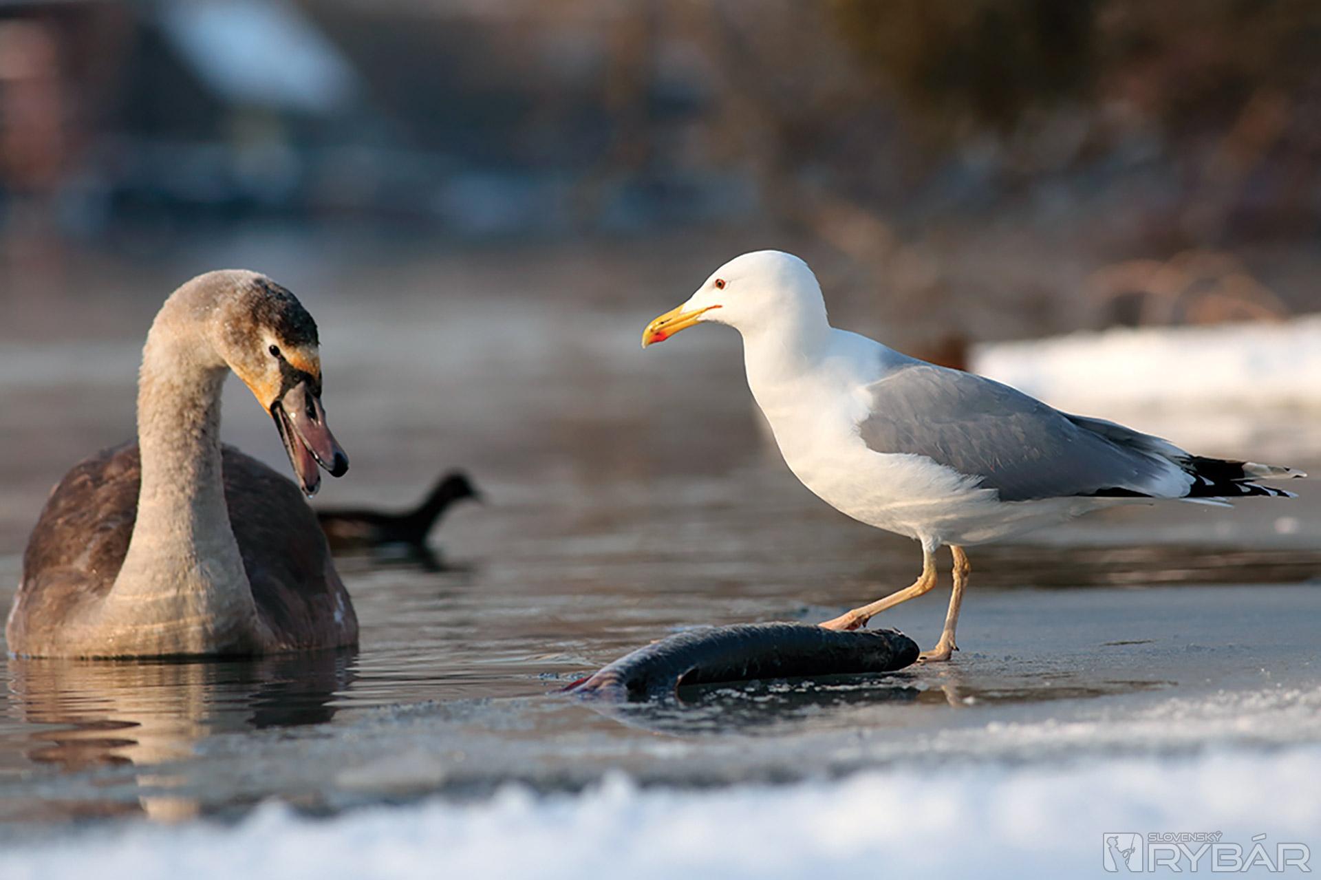 Starý „labuťák“ našťastie tiež pochopil, že šťuka nie je preňho vhodná potrava. Konečne sa čajka môže pustiť do koristi. No mladá labuť by chcela tiež ochutnať. Alebo je len zvedavá?