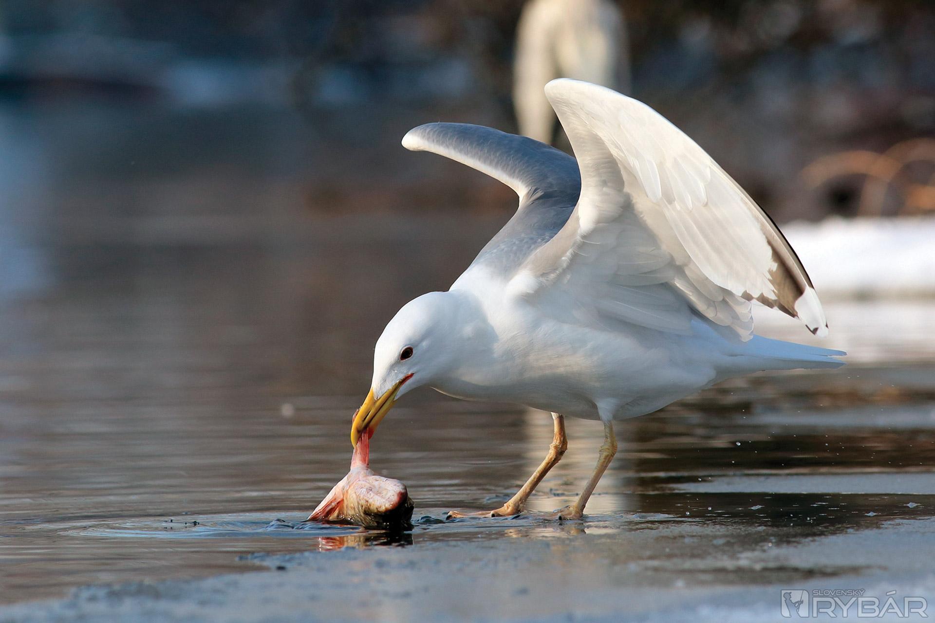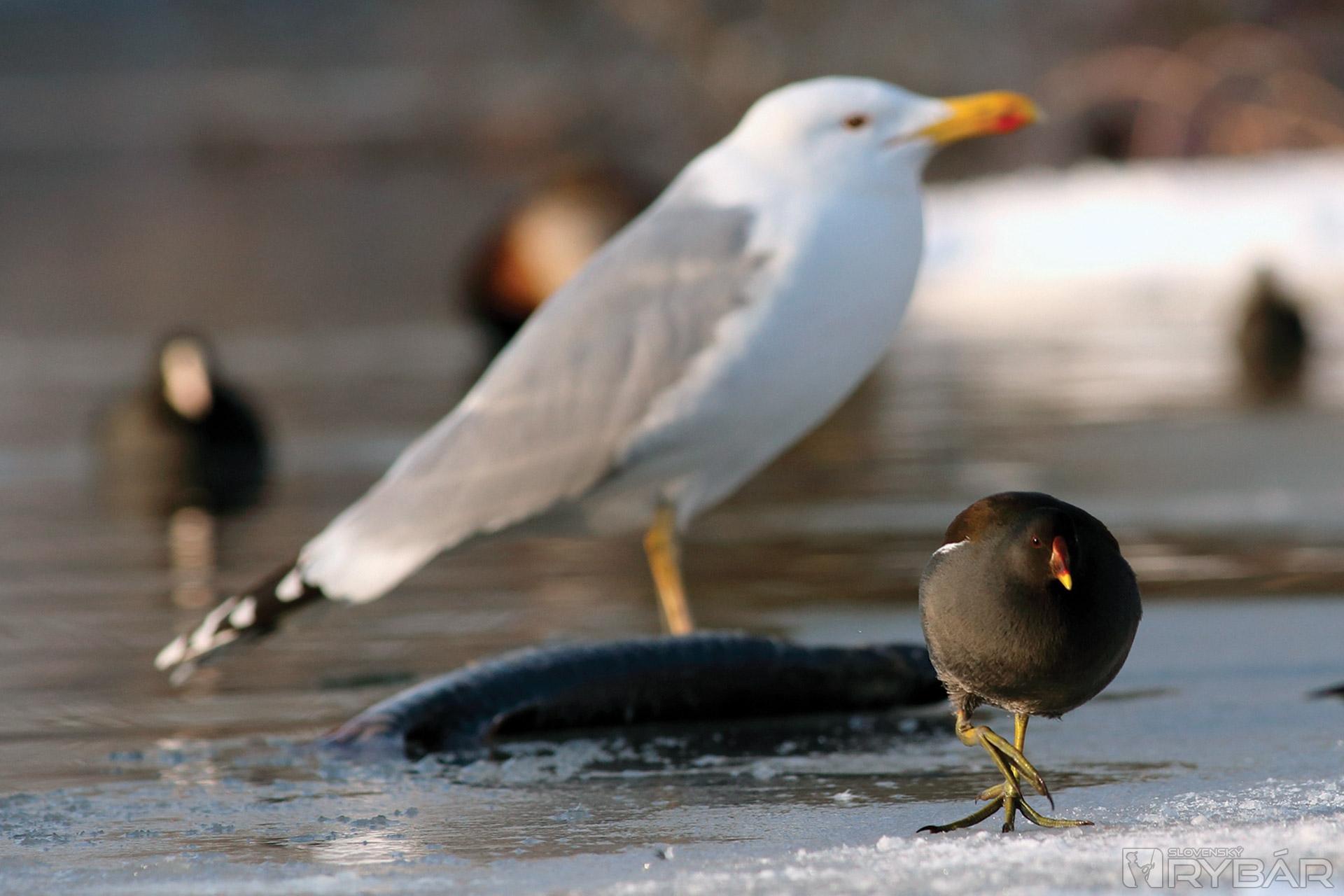 Skutočne, kormorán tu zanechal korisť, ktorú sám nedokázal zožrať. Poranená šťuka sa tak stáva ľahkou korisťou pre čajku. Musí sa však poponáhľať, pretože priletela volavka, ktorá by tiež chcela výdatné raňajky.