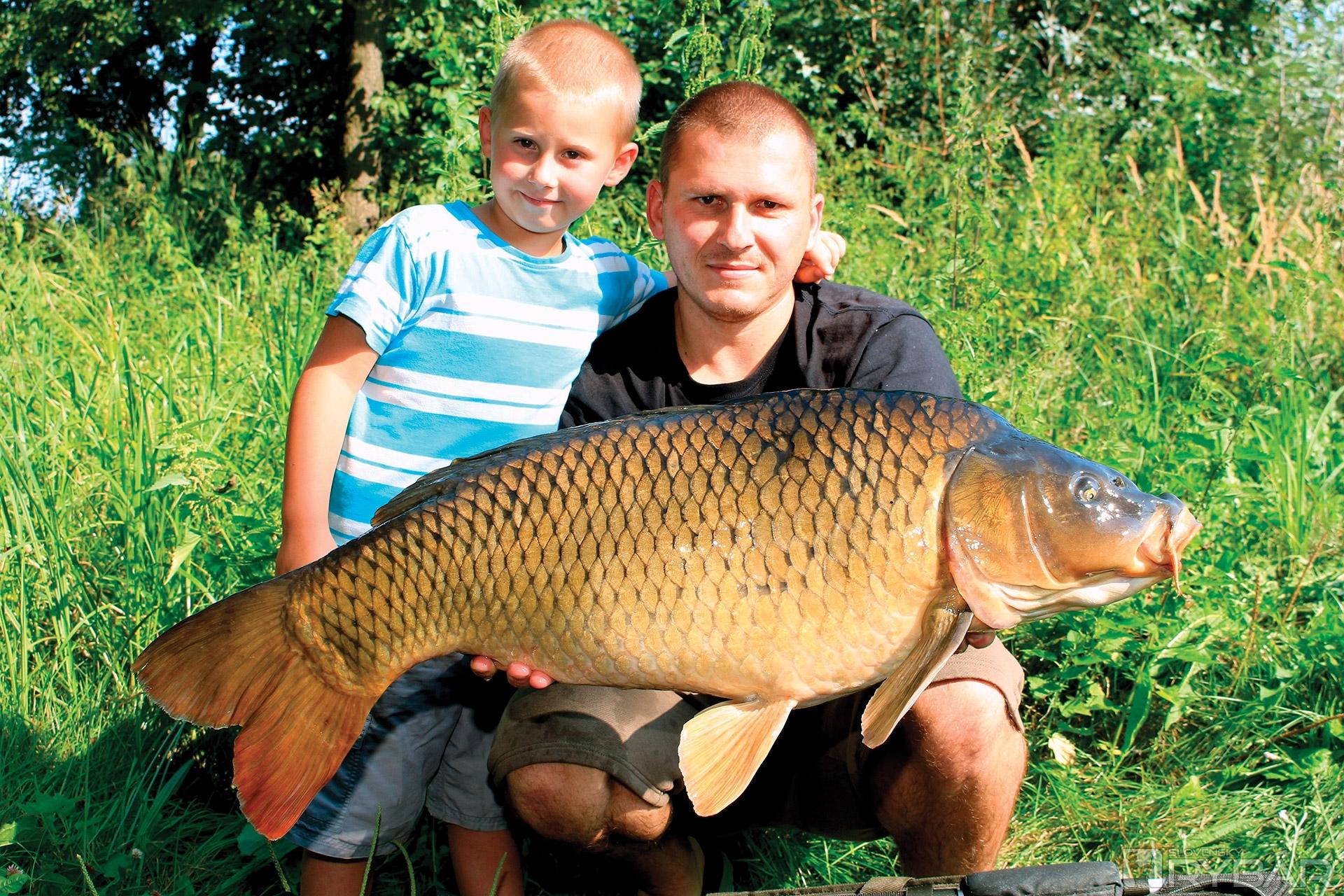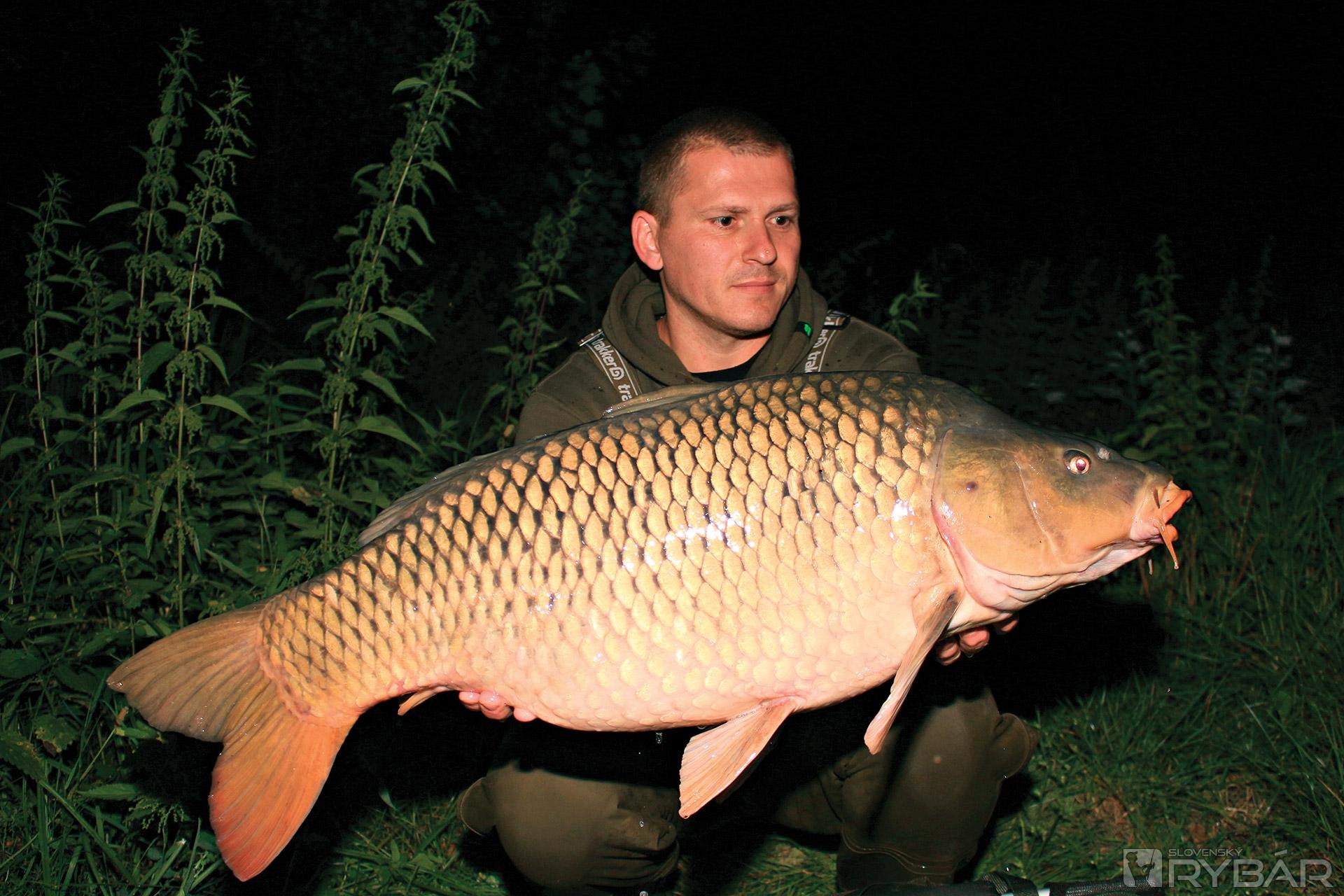 Pre vysoké teploty som si veľa šancí v priebehu dňa nedával a sústredil sa skôr na nočný lov. Tiež som vyzeral vietor a zmenu tlaku, ktorá by mi mohla pomôcť k uloveniu niektorého z miestnych mohykánov. Prvý deň boli moje prúty v pokoji a my sme sa s manželkou mohli venovať vymýšľaniu programu pre naše deti, ktoré táborisko ovládli a pobyt pri vode si od prvého dňa užívali. Nasledujúci deň sa dostavila očakávaná zmena tlaku a zosilňujúci vietor. Zvyšujúca sa aktivita rýb sa prejavila ulovením prvého lepšieho kapra z plytčiny v popoludňajších hodinách. Z tohto kapra sme mali radosť všetci. Pôvodne som chcel zaobstarať spoločnú fotografiu aj s radujúcimi sa deťmi, nakoniec sa mi podarilo prehovoriť aspoň polovicu nášho junior tímu. V priebehu niekoľkých desiatok minút sa „rozbehol“ aj druhý prút, ktorý som mal umiestnený vo vzdialenosti približne 30 m od prvého. O kapra som však, žiaľ, počas zdolávania prišiel. Obe miesta som po zábere prikŕmil pol kilogramom boilies, ale ďalších kontaktov s kaprami som sa počas dennej doby už nedočkal. V priebehu noci a ďalšieho dňa sa na mojich lovných miestach ukázali kapry s tými správnymi proporciami, bohužiaľ, nástrahy si nevšímali. Skúsil som posunúť nástrahy mimo kŕmne miesta a ako sa neskôr ukázalo bolo to správne rozhodnutie. Počas nočných hodín sa kapry na miesta pravidelne vracali a ja som si v priebehu niekoľkých nasledujúcich nocí pripísal na svoje konto ďalšie parádne ryby. Radosť mi robila aj pripravovaná novinka na budúci rok, na ktorú sa mi tiež poslednú noc podarilo uloviť najťažšiu rybu našej výpravy. Už po zábere som tušil, že mám na prúte veľkú rybu. Sila ryby, ktorá mi nekompromisne brala metre silónu z navijaka, bola obrovská. Počas súboja sa ma manželka prišla niekoľkokrát opýtať, čo tam tak dlho robím. Priznávam, že som si ten nočný súboj pod oblohou plnou hviezd dosť užíval. Keď som kapra po nekonečných minútach dostal do podberáka, vedel som, že môj vytúžený cieľ pre túto misiu bol splnený. V podložke na mňa čakal krásny letný lysec s hmotnosťou nad 22 kg! Táto ryba si zaslúžila viac než pár fotografií samospúšťou. Moja žena má našťastie pre môj koníček viac ako len pochopenie a fotografie, ktoré vznikli, sú jej príspevkom.