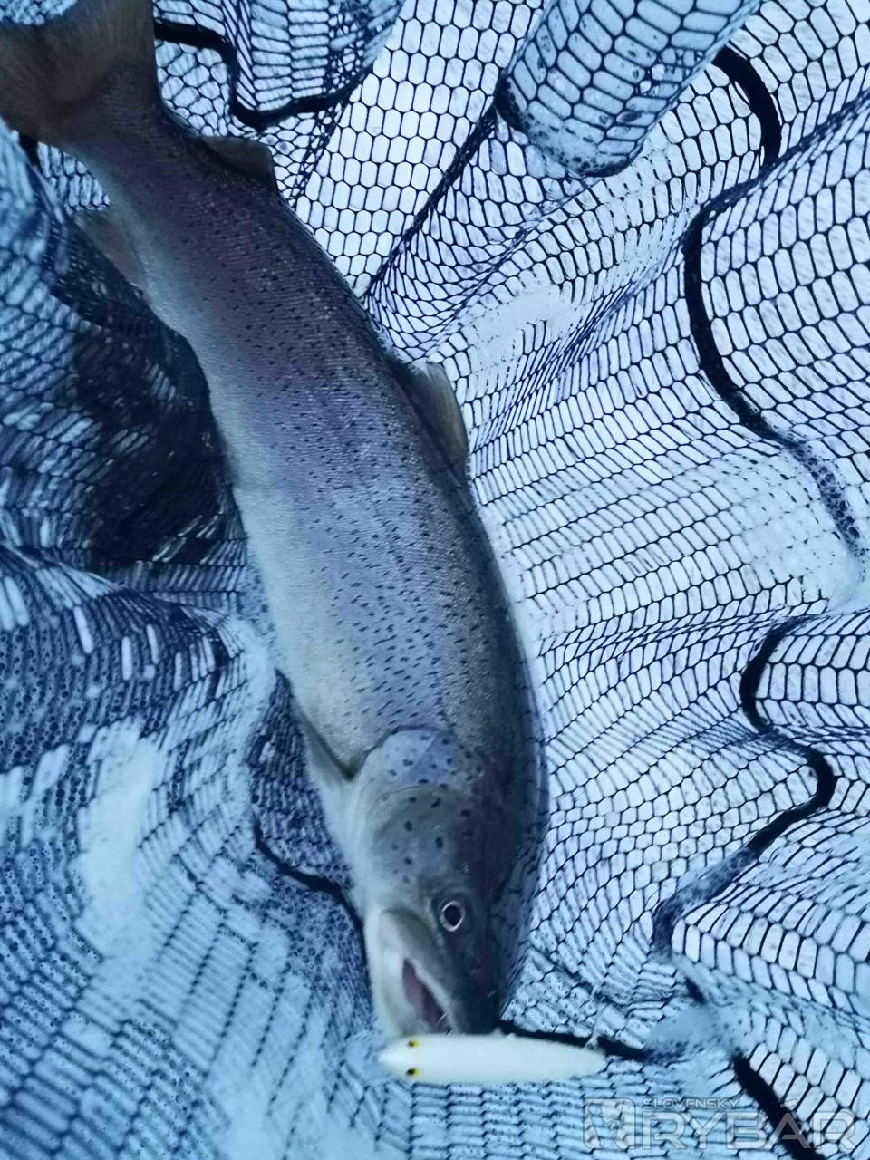 Ráno opäť budíček o 5.30, rýchla káva a cigaretka na uvoľnenie ranných pochodov. Vonku je zamračené a poletuje sneh, teplota klesla a aj Mrázikovi by bola kosa. Nevadí, to pôjde a v aute preberáme dopoludňajšiu stratégiu. Zostávame na regulácii, kde máme už niektoré miesta prešliapnuté. Viem, že tu väčšina ľudí chytá na voblery, ale ja sa chcem odlíšiť. Preto nasadzujem Big Gumy v podobe Hrúzika od môjho kamaráta Radka Paulíka, ktorý mi túto gumu urobil na test. Voda v Hrone o niečo klesla, preto volím 15 g jig s dlhým hákom. Prvých pár nahodení ukazuje, že guma pracuje fantasticky a má moju dôveru. Prehadzujem vytypované miesta a nič sa nedeje. Pomaly strácam nádej a vtom – bum! – rana ako od zubáča. Nič nenechám na náhodu a zaseknem celou silou, čo v sebe nájdem, až mi chrupne v chrbte. Opäť sa nič nedeje a cítim len mŕtvu záťaž. Začnem točiť rumpálom, čo mám na prúte a cítim len jemné vibrácie, pridám teda na razancii a začnú sa diať divy. Ryba sa hádže z boka na bok a snaží sa dostať do prúdu. Doťahujem brzdu na krv a nedávam jej žiadny priestor. Vtom sa objaví na hladine červenkasté podlhovasté telo ryby a ja viem, s kým bojujem – je tam Kráľovná. Revem na Martina ako prvorodička na hekárni: „Mám ju, mám ju, poď mi ju podobrať!“ Ten keď ma vidí, pridá do kroku. Behom chvíle je pri mne a Kráľovnú mi podoberie. Plný šťastia a eufórie kričím od radosti na celé mesto. Je nádherná! Rubínová farba prechádza do striebornej s množstvom čiernych bodiek, čomu hovorím prerastený pstruh na steroidoch. Ani Picasso by ju nenamaľoval lepšie. Rýchlo urobíme pár fotiek a rybu šetrne púšťame späť do jej kráľovstva.