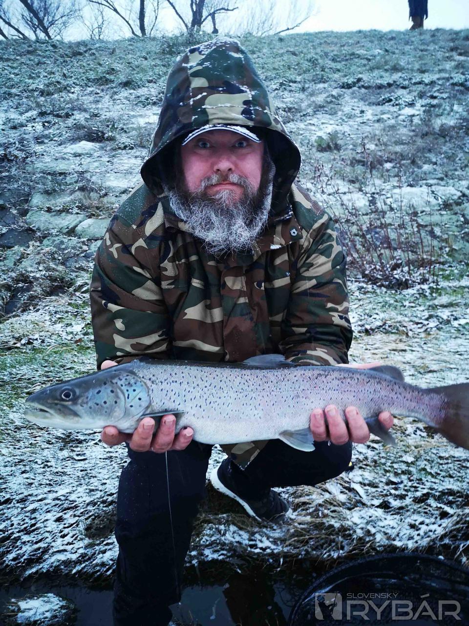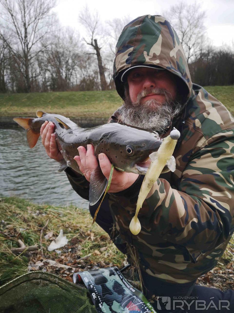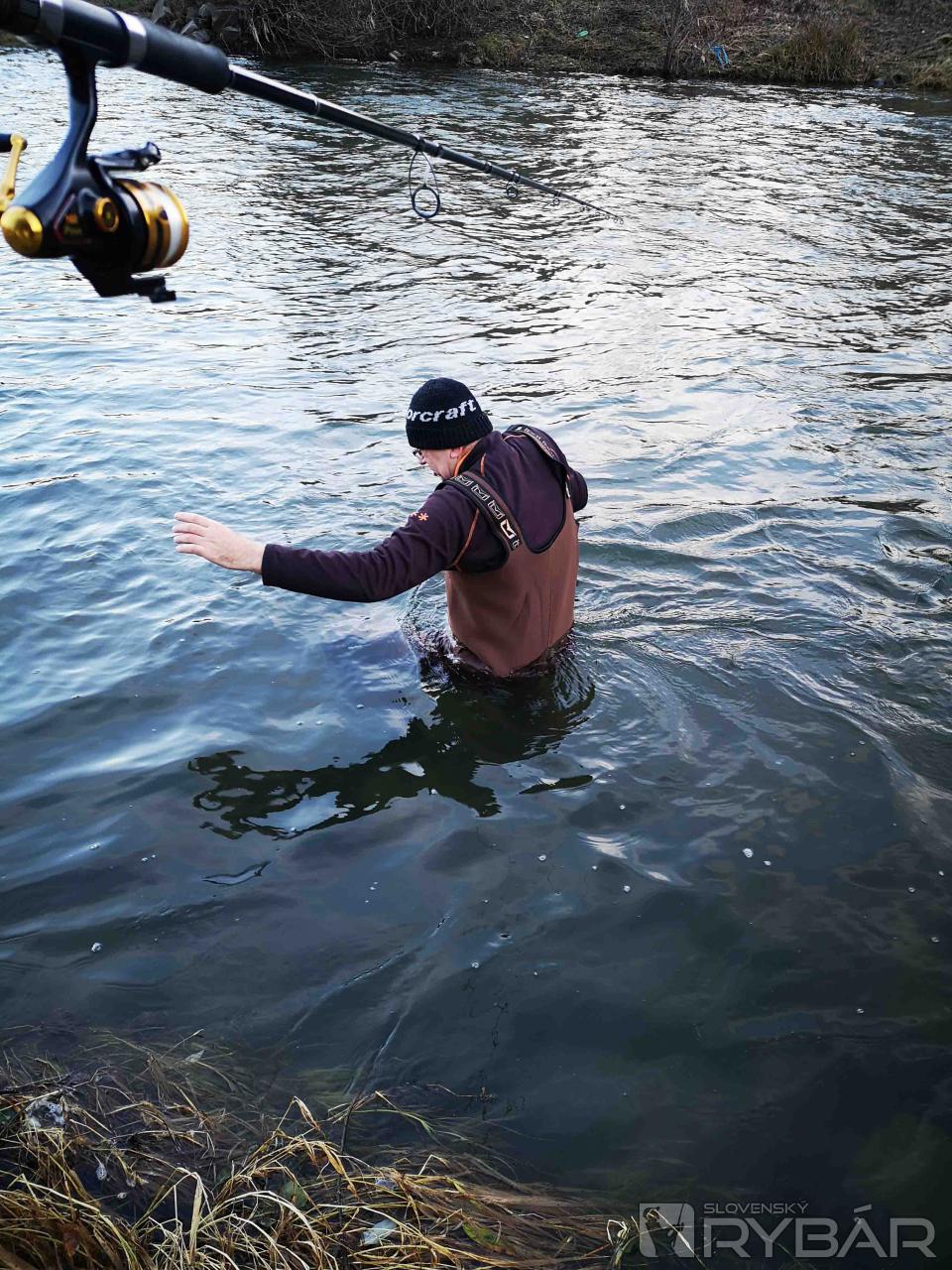 Opäť pripadlo trošku snehu a ja schádzajúc po strmom brehu šľahnem so sebou ako s vrecom zemiakov a celý kamenistý svah zídem po zadku. Nechápem, ako nás to mohlo ako deti baviť. Ihneď kontrolujem vercajk, ale jediné, čo utrpelo šrám, je moja pýcha. Nevadí, zažil som aj horšie veci, a tak hádžem do vody bieleho 3Stana, ale bez výsledku. Asi tak po hodinke hodím vobler do prúdu a prudko trhnem s prútom, aby som vobler dostal hlboko a pomaly navíjam. Asi tak v polovici toku prišla rana ako od zubáča, tak som zasekol a začínam navíjať. Cítim len veľkú hmotnosť, ale žiadna akcia. Vtedy sa však ryba ukáže na hladine a akoby do nej čert vošiel. Je to hlavátka a veľká, tak volám na Martina. Začína preťahovaná – chvíľu ťahám ja, chvíľu ona. Doťahujem brzdu a začínam ju driapať ako vegánsky burger. Vtom prišiel Martin s podberákom a ryba sa rozhodla, že posilňovne má asi dosť a môj vobler vypľula. Skoro som si cvrkol do textilu od zlosti. Musím sa upokojiť, tak si dávam rýchle cigáro a premýšľam, kde som urobil chybu. Zásekom to nebolo, lebo keby som zasekol o trochu viac, rovno ju vykostím... No chyba bola tá brzda. Skúsim to znova. Keď je tam jedna, bude ich tam viac. A veruže áno! Tentoraz rana do prúta a silný ťah po prúde. Bol som si istý, že to bude hlavátka. Veru, bola. Nebola taká veľká a na vlasec 0,45 mm išla ako hrúzik. Martin bol pri mne, tak mi ju hneď podobral a ja som si mohol urobiť druhý zárez s hlavátkou 67 cm. Opäť pár rýchlych fotiek a ryba odplávala do temných hlbín Hrona. Ešte chvíľu to s Martinom skúšame aj na iných miestach, ale ryba sa nám už nepodarila.