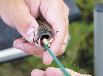 Je to predovšetkým preto, lebo ryba, ktorú chcem loviť, je tak neuveriteľne pažravá, že nie je ničím neobvyklým chytiť sumčeka s obrovským prepchaným bruškom plným našej nástrahy. Znásobme si takých hoci len 30 g nástrahy tristočlenným húfom a krmivo je do zrniečka preč. Zakŕmil som a na rad prišlo prvé nahodenie. Na háčik som napichol zaručenú nástrahu, ktorou je kúsok nočného červa. Systém som položil presne do kŕmneho miesta.