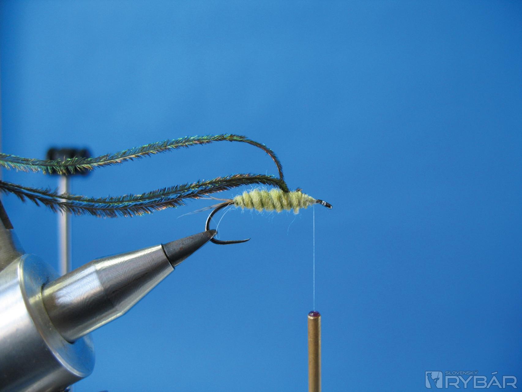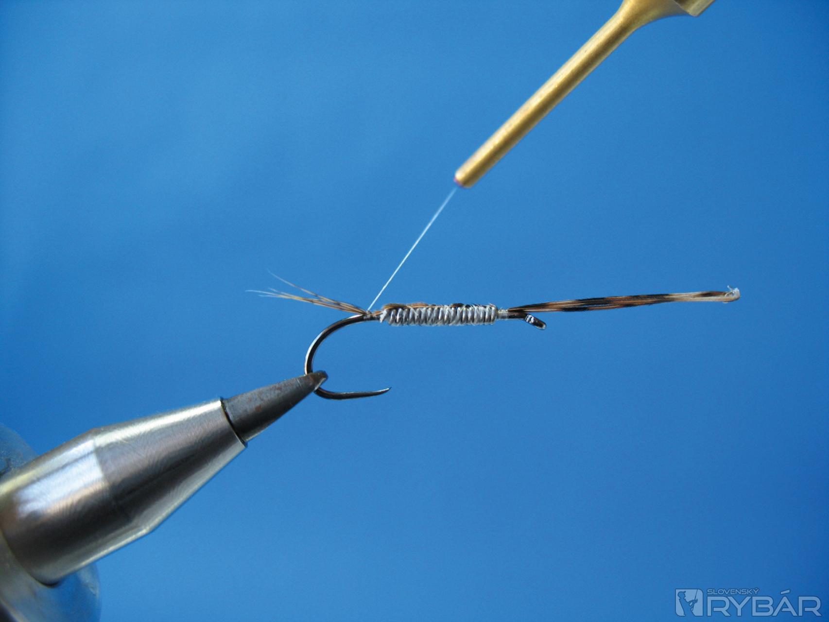 Naviažeme tri až štyri lúče z chvostového pera bažanta, urobíme jedno ovinutie pod štety ako fixáciu do vodorovnej polohy.