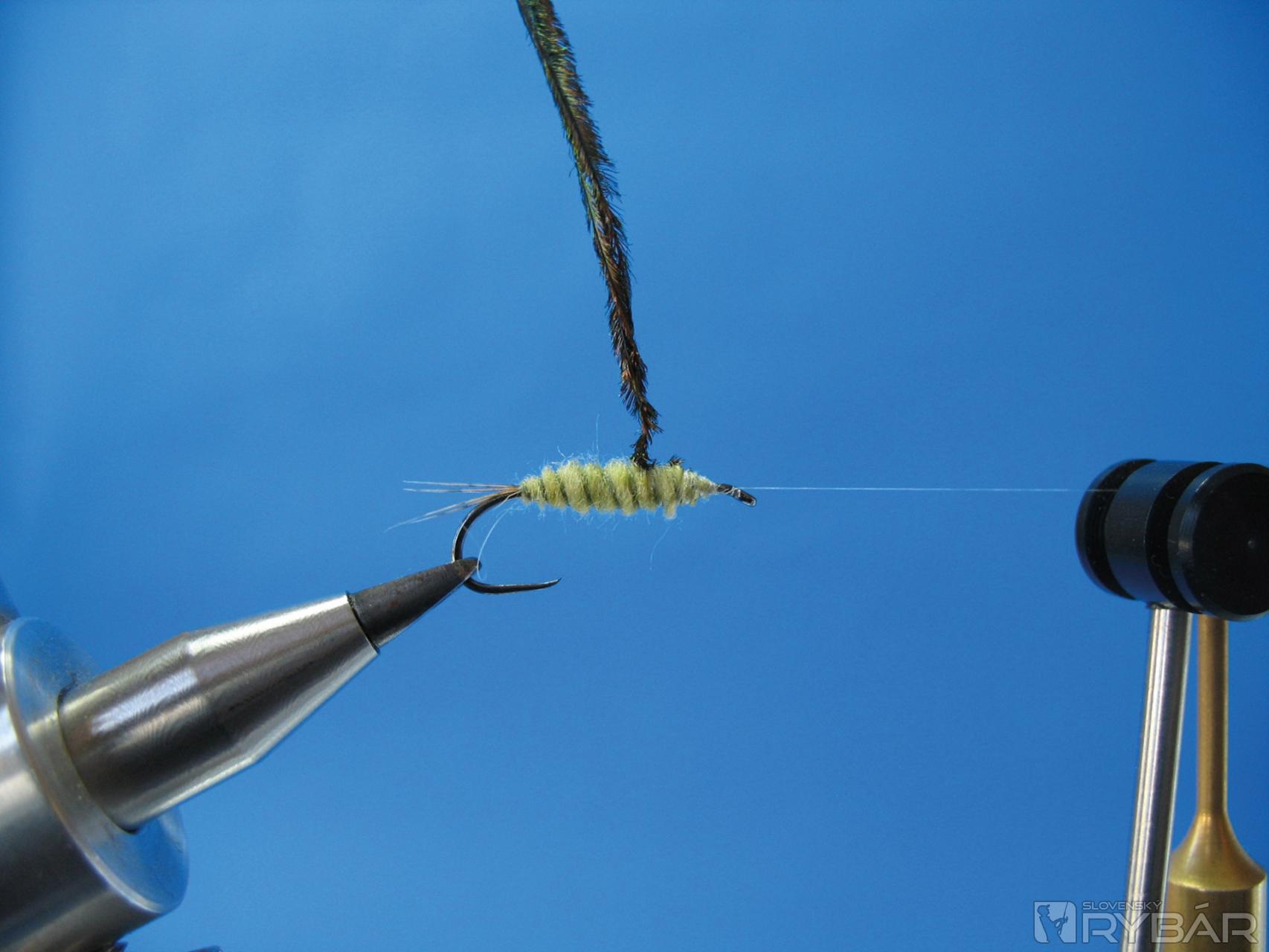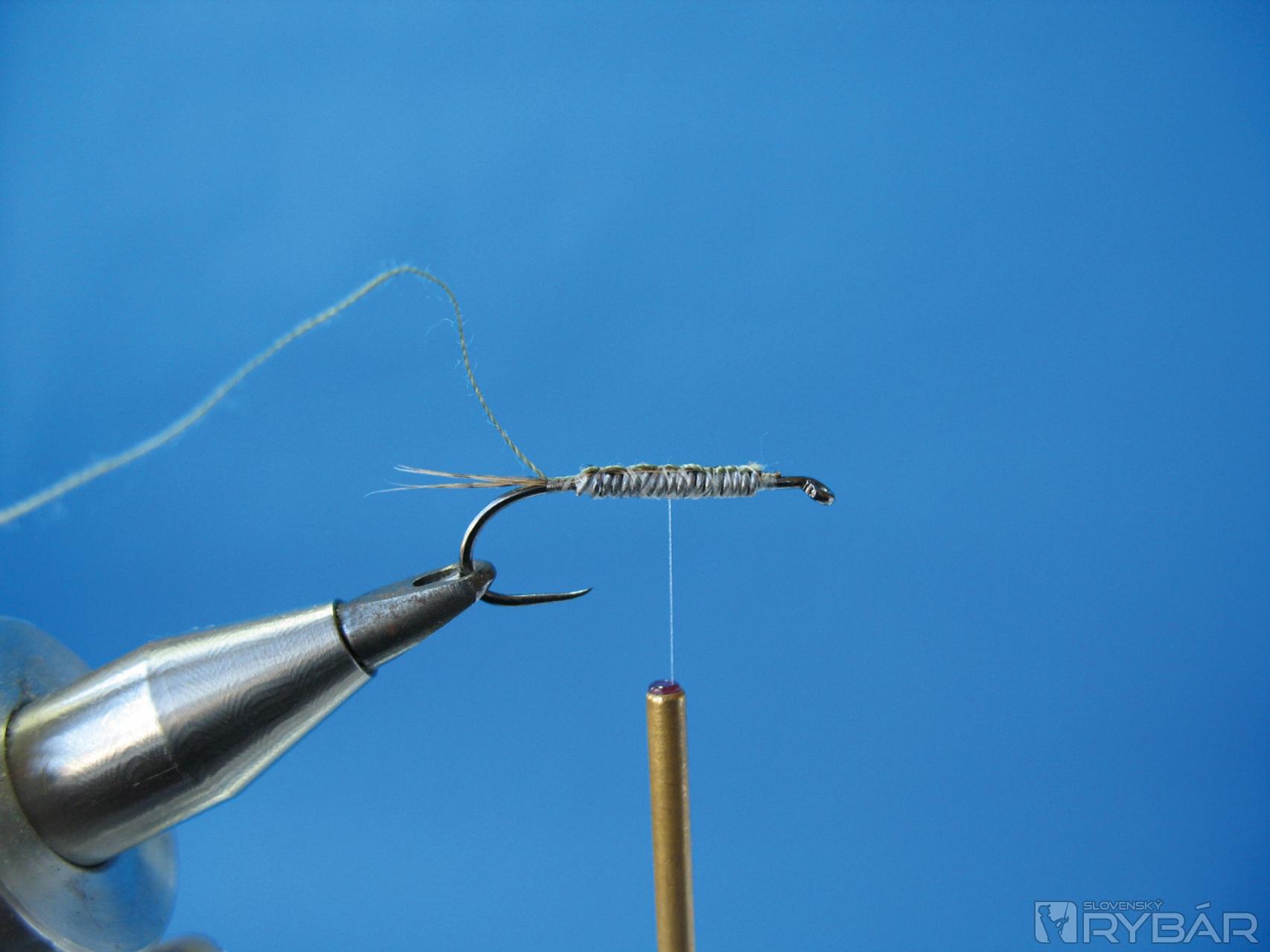 Ako krúžkovacie materiály používam bežné nite na šitie v prírodných farbách. Účinné je aj krúžkovanie medeným drôtikom, a to nielen na telíčku, ale ak medeným drôtikom husto prekrúžkujete hlavohruď z páva, muška bude odolnejšia a účinnejšia. Hlavohruď je naviazaná z dvoch až troch lúčov z pera páva stočených do knôtika a navinutých na telíčko.