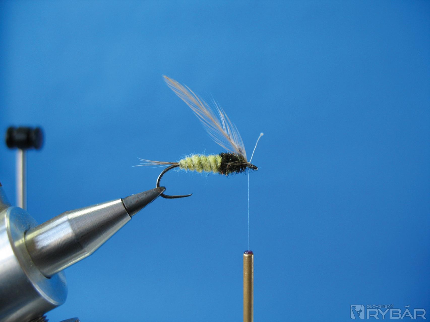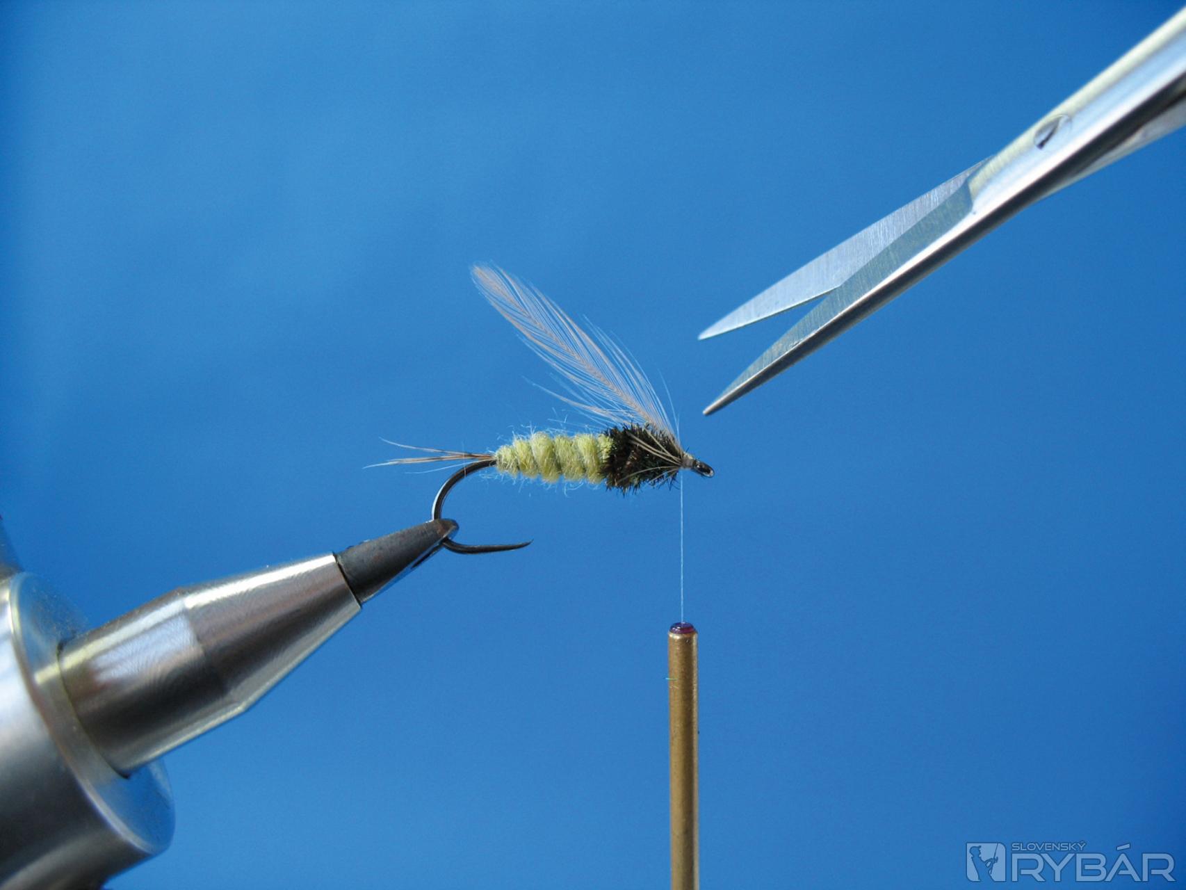 Všetky nožičky stiahneme smerom dozadu a vyviažeme muške peknú hlavičku, zakončíme strateným uzlom, zalakujeme a muška je hotová!