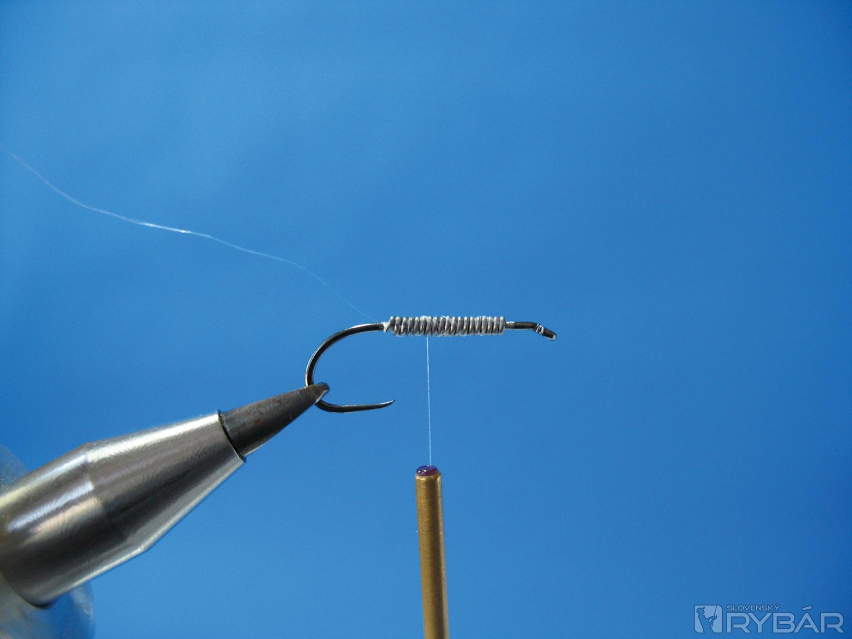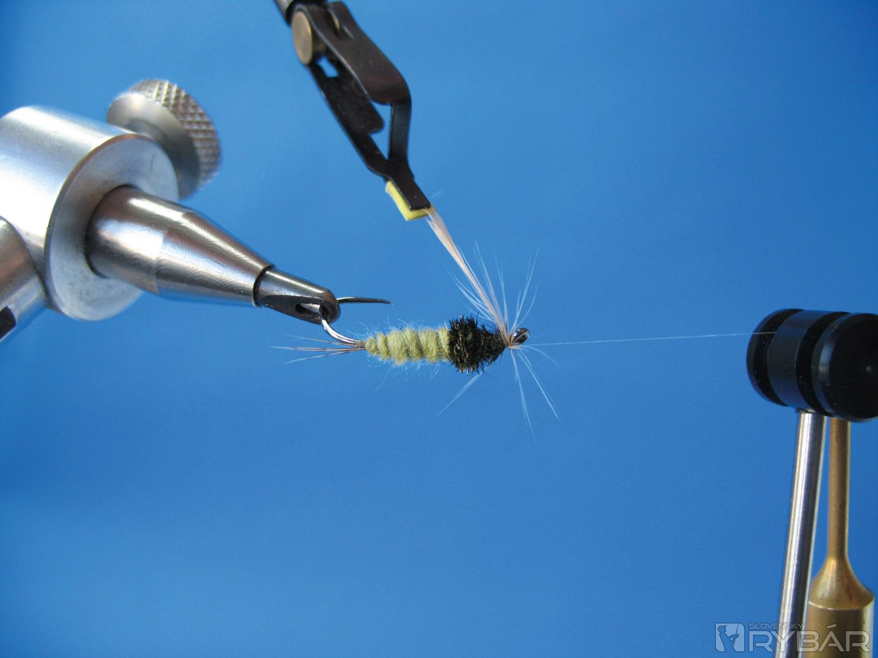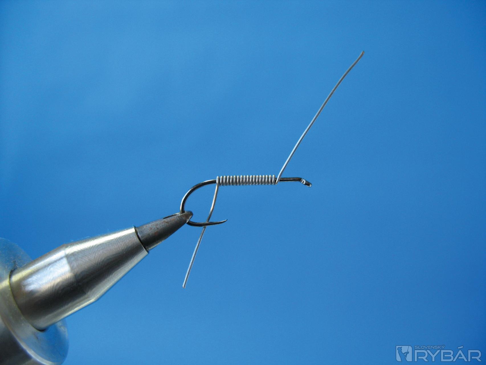 Pomocou škripca navinieme pierko okolo ramienka háčika, stačia dve až tri ovinutia. Záleží na hustote a kvalite pierka.