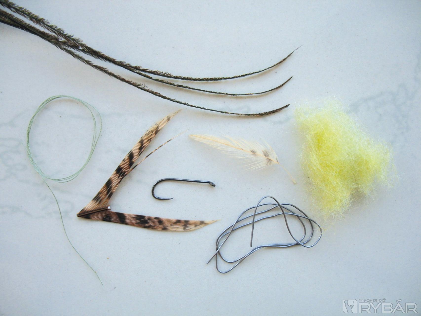 Háčik č. 8, olovený drôtik, lúče z bažanta, kosierik zo skalpu kohúta, lúče z pera páva, dubbing vo farbe slonovej kosti, svetlá niť na krúžkovanie.