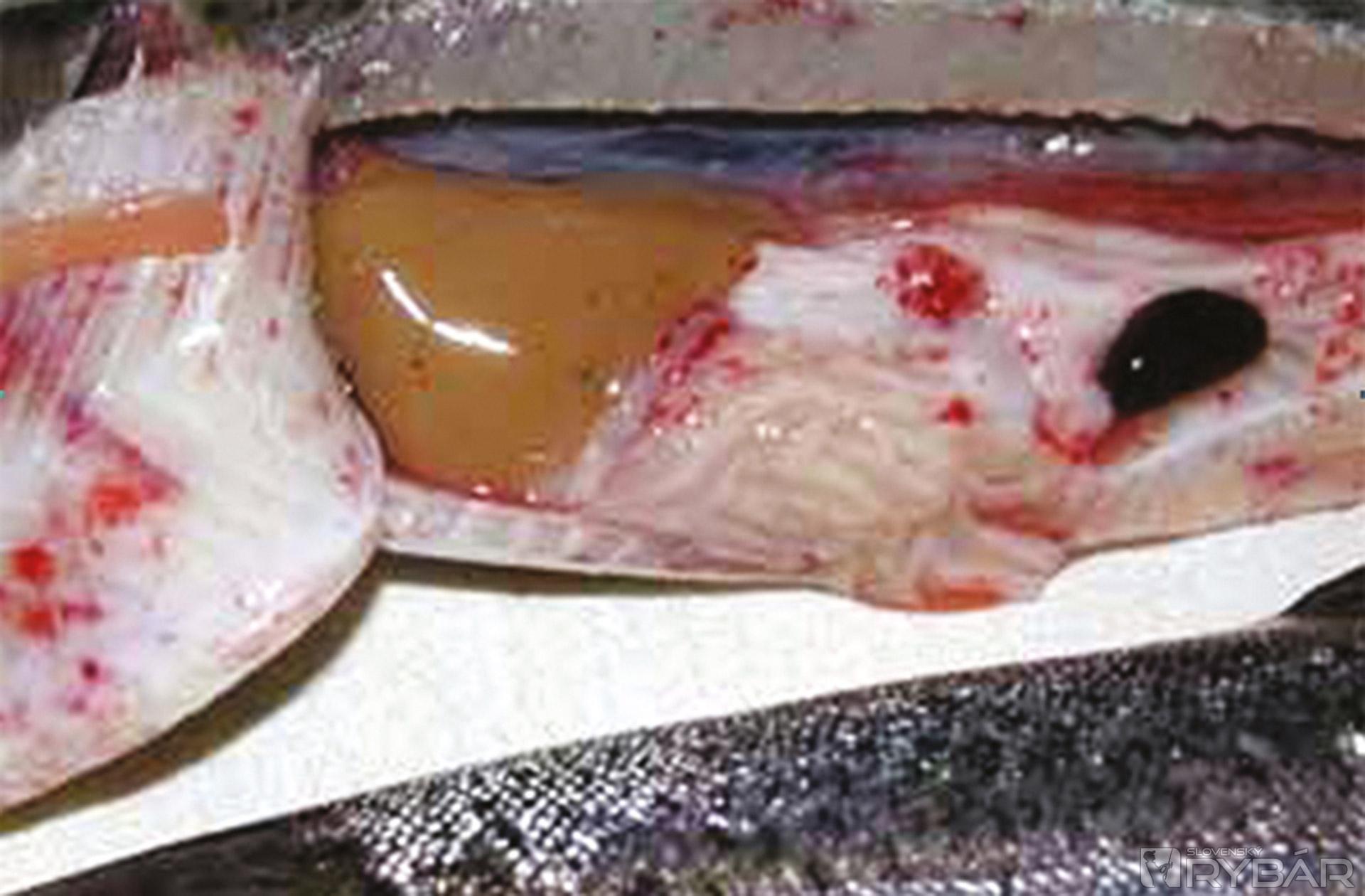 Chorobné zmeny: ryby sú nápadne tmavé (zo začiatku na chrbte, neskôr aj na bokoch), častý je exoftalmus (vypúlenie očí), žiabre sú výrazne bledé, nedokrvené, v koži pri báze plutiev sa objavujú menšie krvácaniny (hemoragie), ktoré už pozorujeme i vo svalovine a vnútorných orgánoch, nadobličkový systém (nesprávne obličky) je zdurený až granulovaný, výrazne hrboľatý, tmavočervený až šedivastý, v telesnej dutine sa hromadí tekutina, črevo je stenčené.