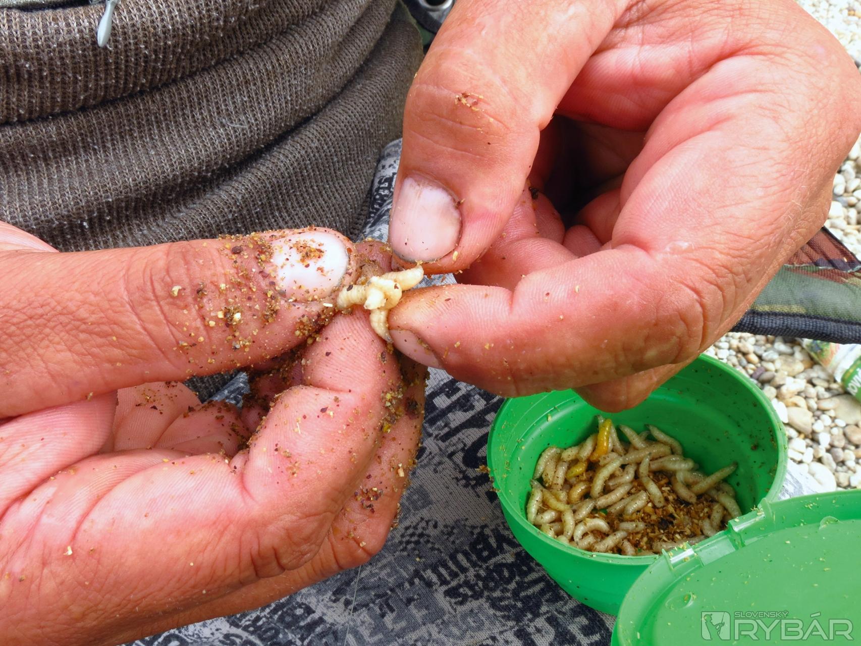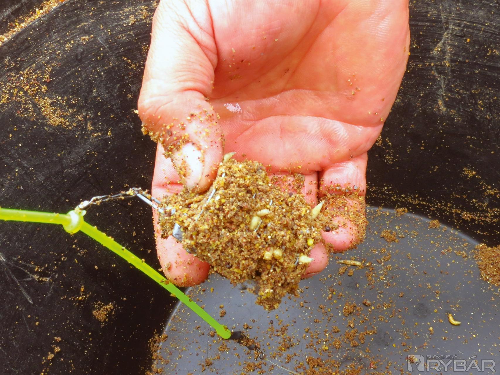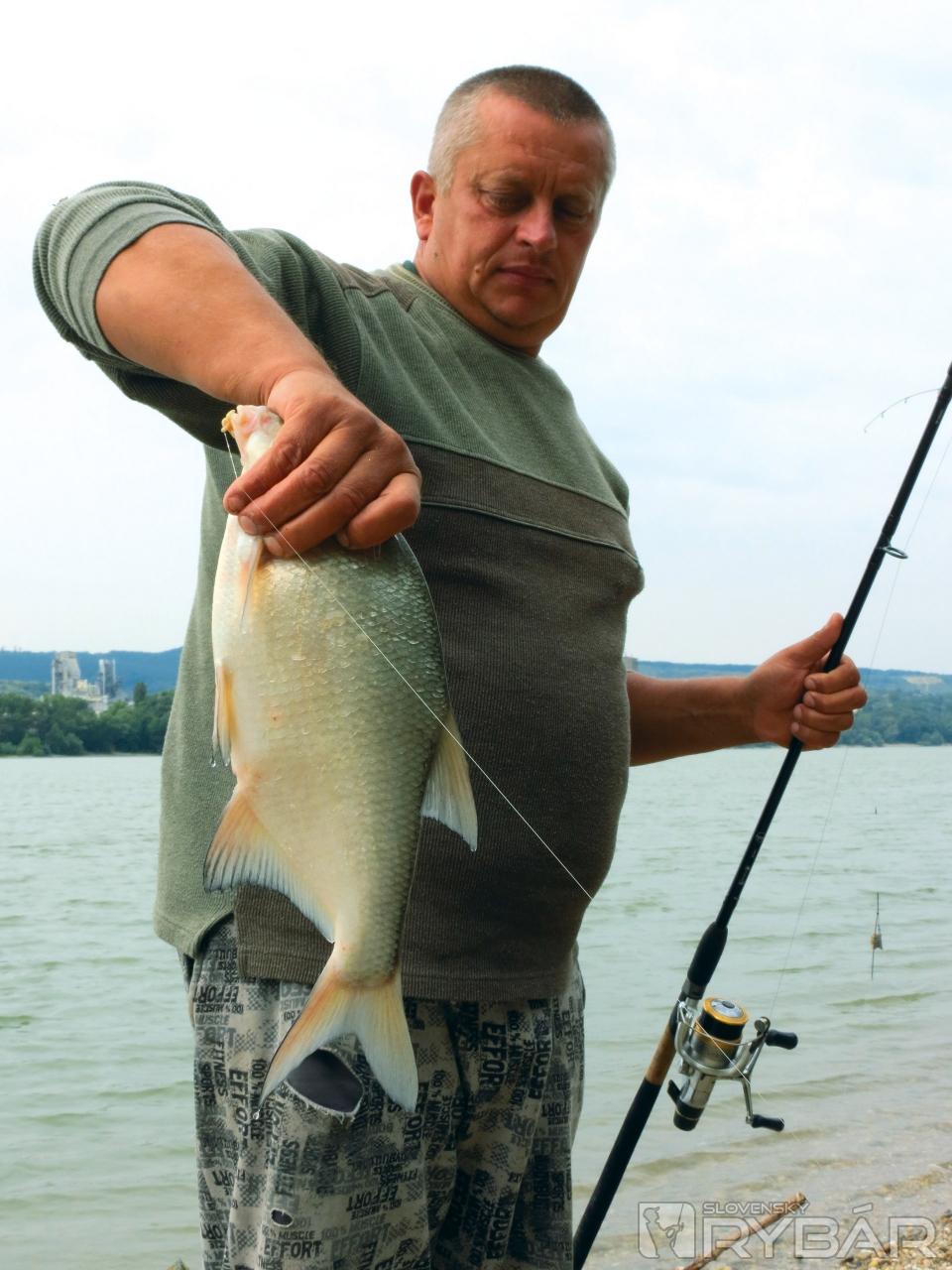 Jeden háčik to však má. Vo vzdialenosti približne 20 m od brehu dno náhle klesá z 1,70 m do hĺbky cca 4 m, a vytvára tak slušný zlom. Nazval by som to akousi jamou, lebo nad týmto miestom je plytko a pod ním tak isto. Vzniká teda 80 m dlhé a 4 m hlboké miesto blízko brehu, kde sa usadzuje nános a s ním aj potrava, ktorú ryby zbierajú. Rozrábam vnadiacu zmes Maggi, ale tentoraz mi Peter káže trochu ju prevlhčiť. A to z dôvodu, aby ju hneď nevymývalo z košíka. Peter napichuje na háčik päť kostných červov, nahadzuje a rúčku udice vkladá do doma vyrobeného stojanu. Je to praktická vec. Špička udice pod uhlom 45° smeruje k nebu a je mierne ohnutá. Aspoň trochu sa tým minimalizuje kontakt vlasca s prúdom a celá zostava vydrží dlhšie na jednom mieste. Záber na seba nenechal dlho čakať. Doslova sa trasie celá udica a o chvíľu je na brehu malý pleskáč. Nastreľujem povyše lovného miesta pár kŕmnych gúľ z rozrobenej vnadiacej zmesi. Keď povyše, myslím tým aj desať - pätnásť metrov proti prúdu, Peťo zdoláva ďalšieho pleskáča. Pri jeho zdolávaní práve prechádza popred nás veľká výletná loď. Vlny, ktoré vytlačila riadne dobili zdolávanú rybu. Vždy je potrebné mať sa na pozore a veci si dávať ďalej od brehu, lebo sa môže ľahko stať, že ich ustupujúca voda odnesie so sebou.