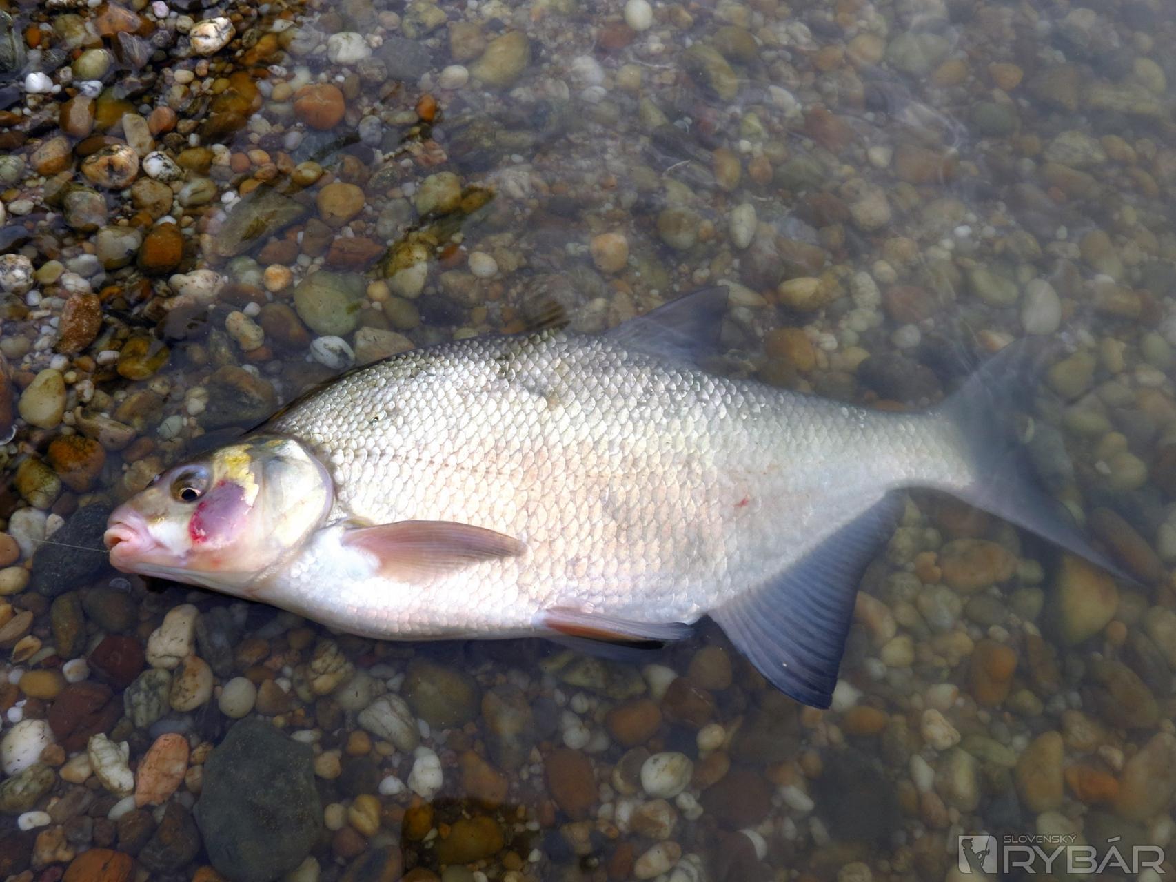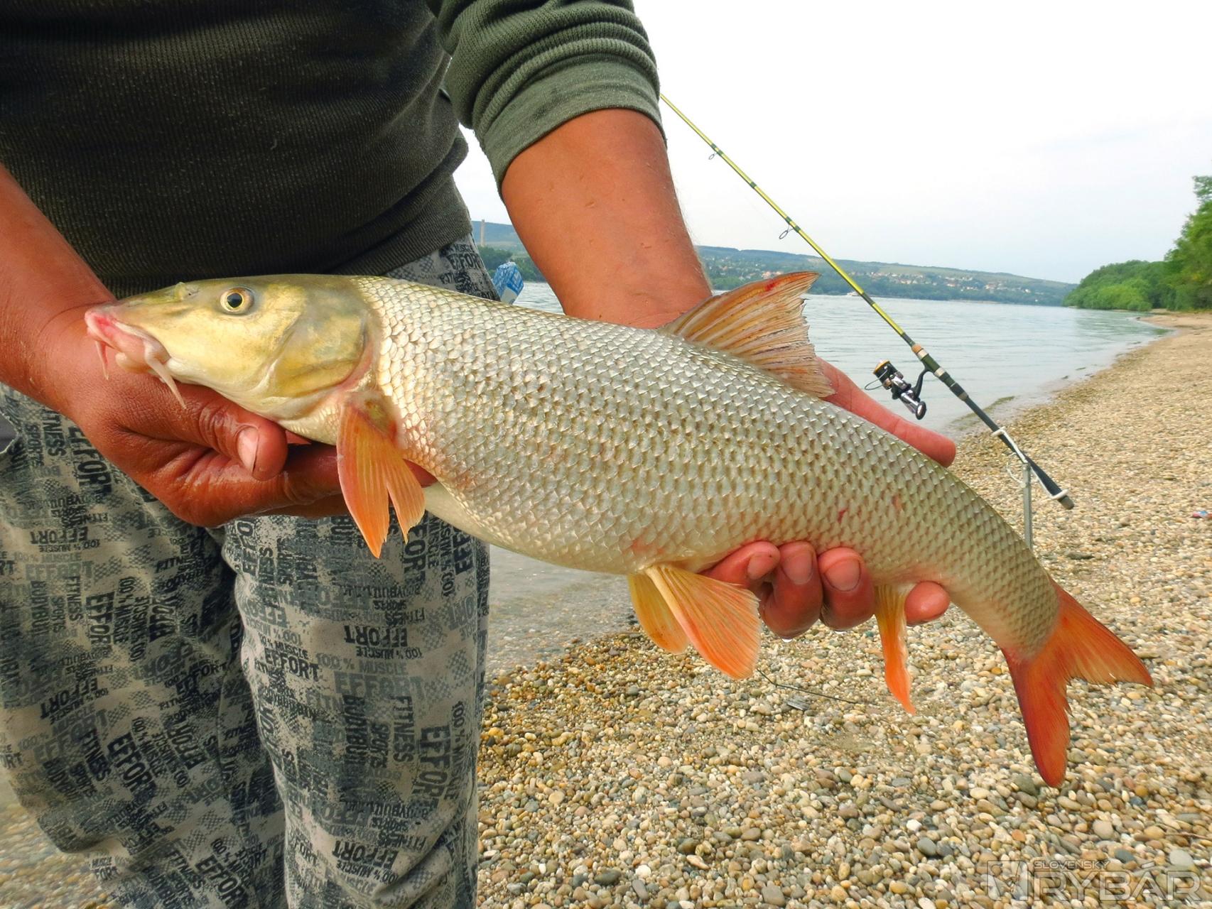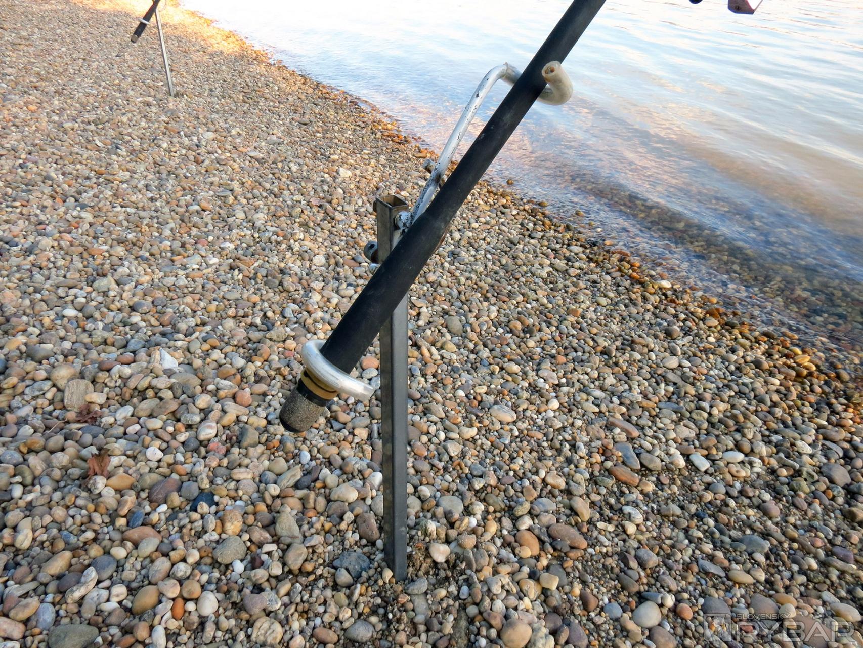 Jeden háčik to však má. Vo vzdialenosti približne 20 m od brehu dno náhle klesá z 1,70 m do hĺbky cca 4 m, a vytvára tak slušný zlom. Nazval by som to akousi jamou, lebo nad týmto miestom je plytko a pod ním tak isto. Vzniká teda 80 m dlhé a 4 m hlboké miesto blízko brehu, kde sa usadzuje nános a s ním aj potrava, ktorú ryby zbierajú. Rozrábam vnadiacu zmes Maggi, ale tentoraz mi Peter káže trochu ju prevlhčiť. A to z dôvodu, aby ju hneď nevymývalo z košíka. Peter napichuje na háčik päť kostných červov, nahadzuje a rúčku udice vkladá do doma vyrobeného stojanu. Je to praktická vec. Špička udice pod uhlom 45° smeruje k nebu a je mierne ohnutá. Aspoň trochu sa tým minimalizuje kontakt vlasca s prúdom a celá zostava vydrží dlhšie na jednom mieste. Záber na seba nenechal dlho čakať. Doslova sa trasie celá udica a o chvíľu je na brehu malý pleskáč. Nastreľujem povyše lovného miesta pár kŕmnych gúľ z rozrobenej vnadiacej zmesi. Keď povyše, myslím tým aj desať - pätnásť metrov proti prúdu, Peťo zdoláva ďalšieho pleskáča. Pri jeho zdolávaní práve prechádza popred nás veľká výletná loď. Vlny, ktoré vytlačila riadne dobili zdolávanú rybu. Vždy je potrebné mať sa na pozore a veci si dávať ďalej od brehu, lebo sa môže ľahko stať, že ich ustupujúca voda odnesie so sebou.
