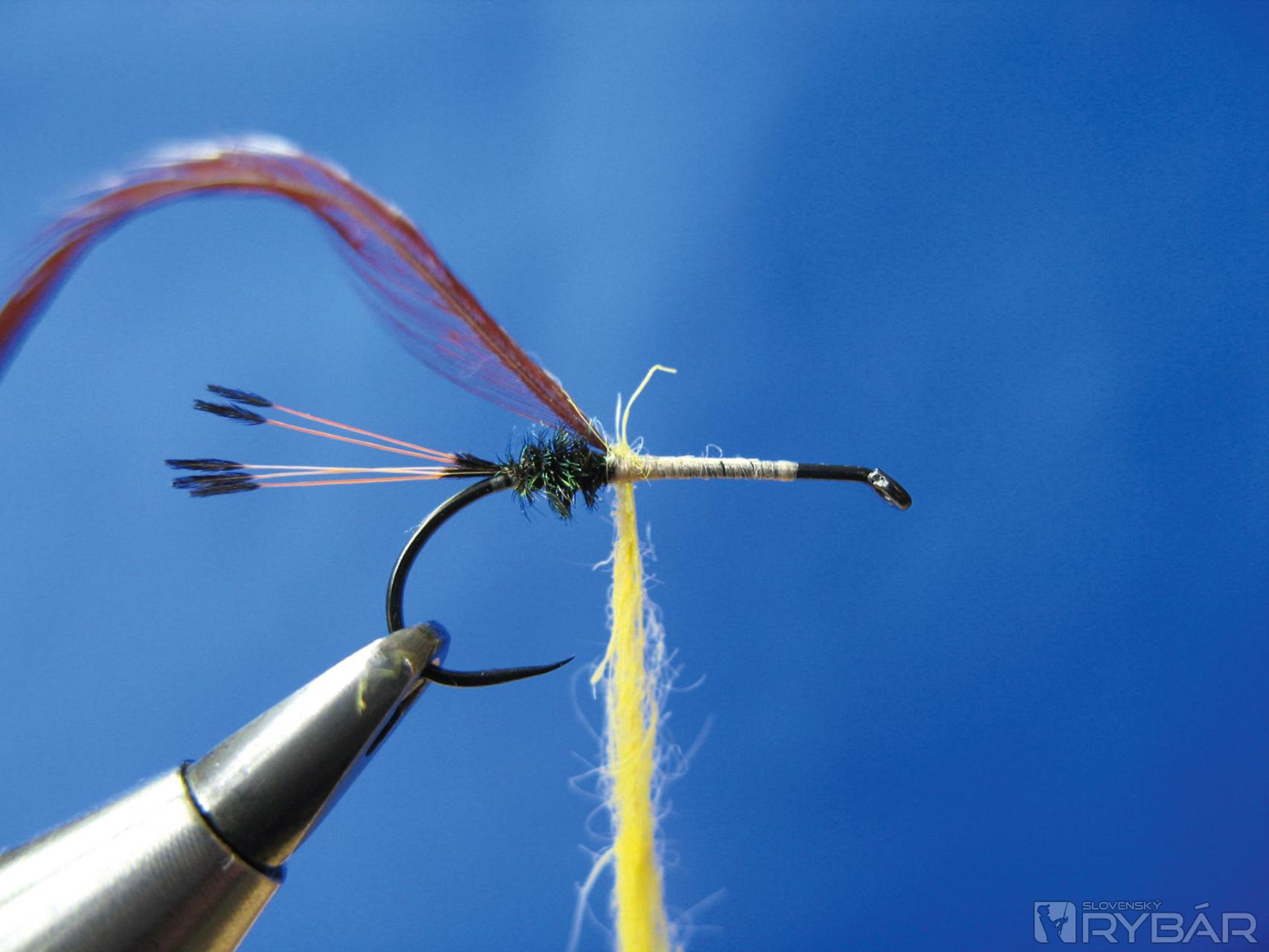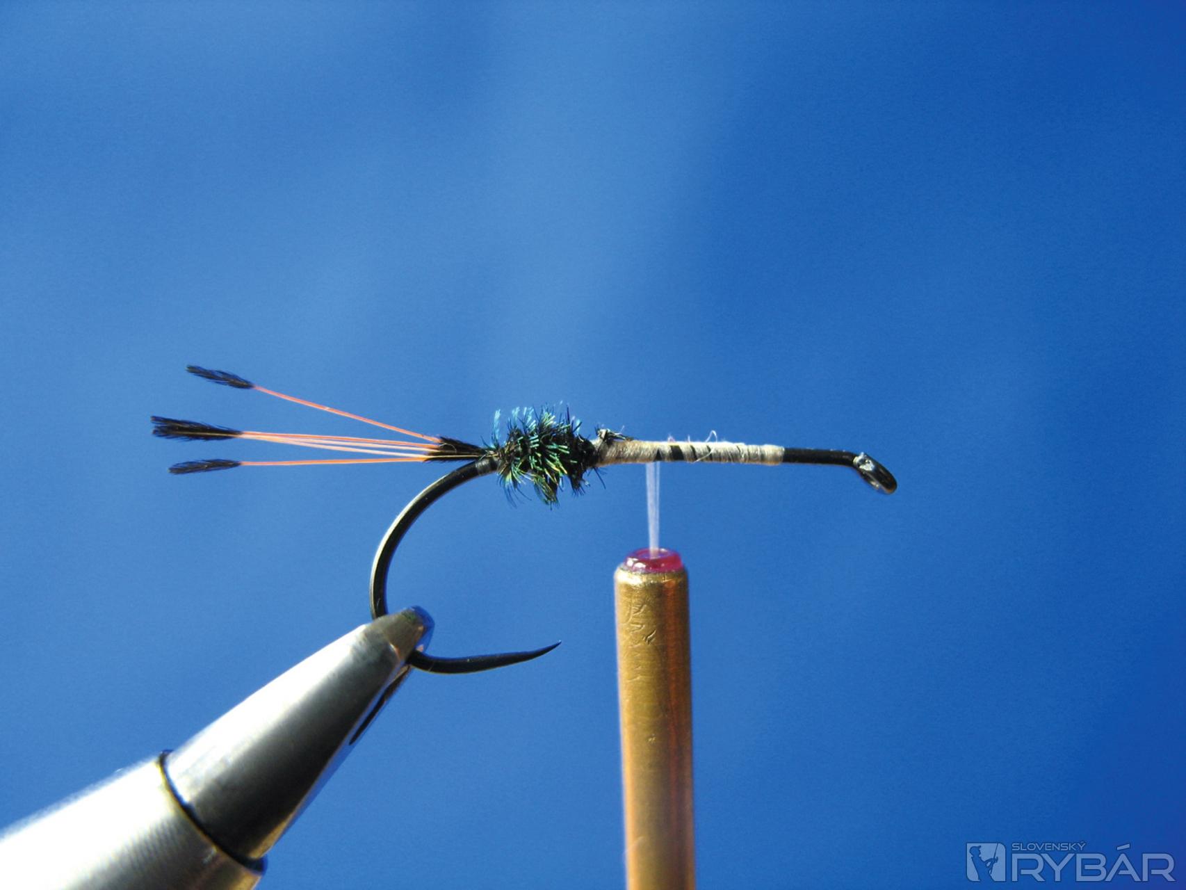 Knôtik postupne natočíme na ramienko. Telíčko musí byť tenké a jemné. Malo by byť o niečo nižšie ako je zelený zadoček mušky. Pri očku musí zostať miesto min. 3 mm na naviazanie krídeliek a nožičiek.