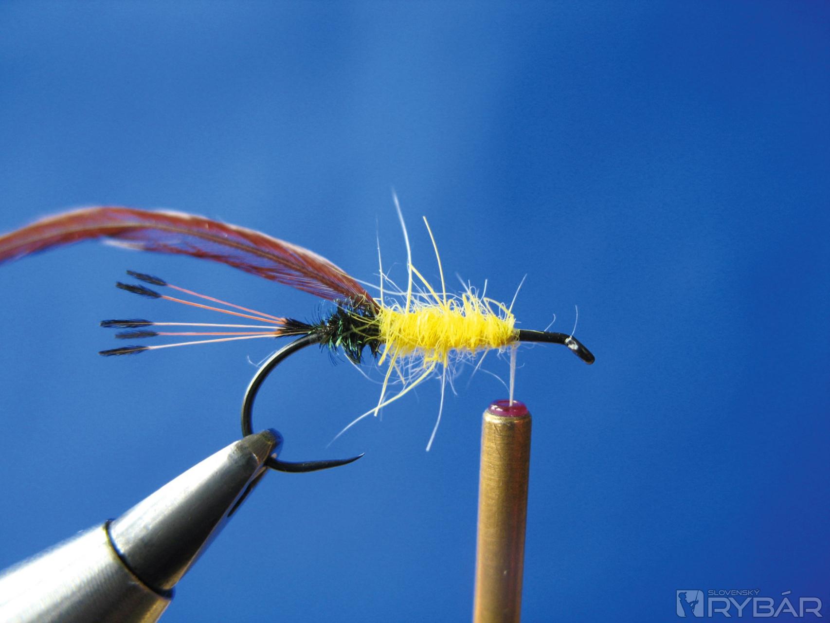 Hneď za zelený zadoček mušky naviažeme kvalitný hnedý kosierik z kohúta. Predtým je dobré si zmerať dĺžku nožičiek. Na niť si nadabujeme tenký knôtik žltého dabingu.