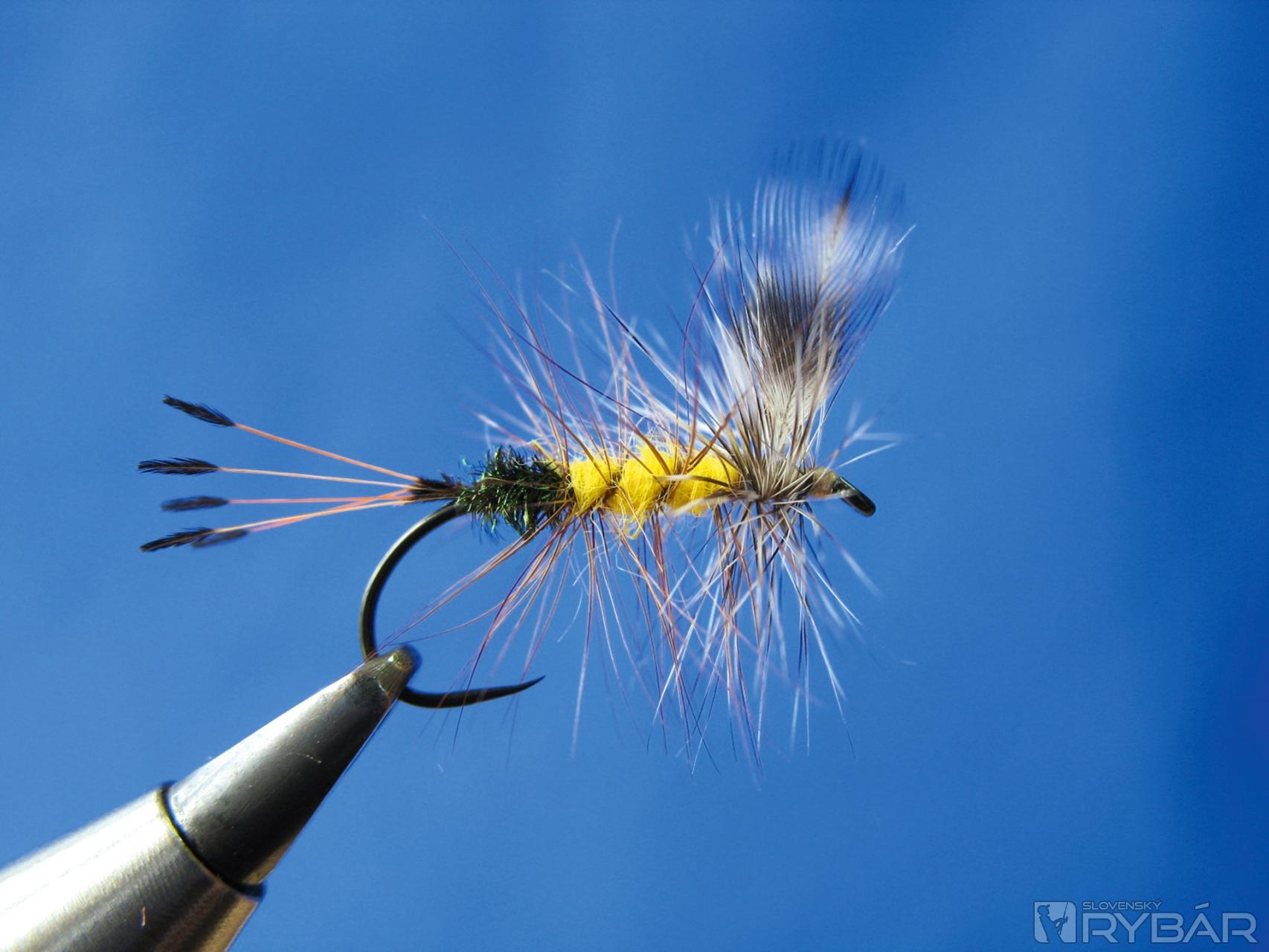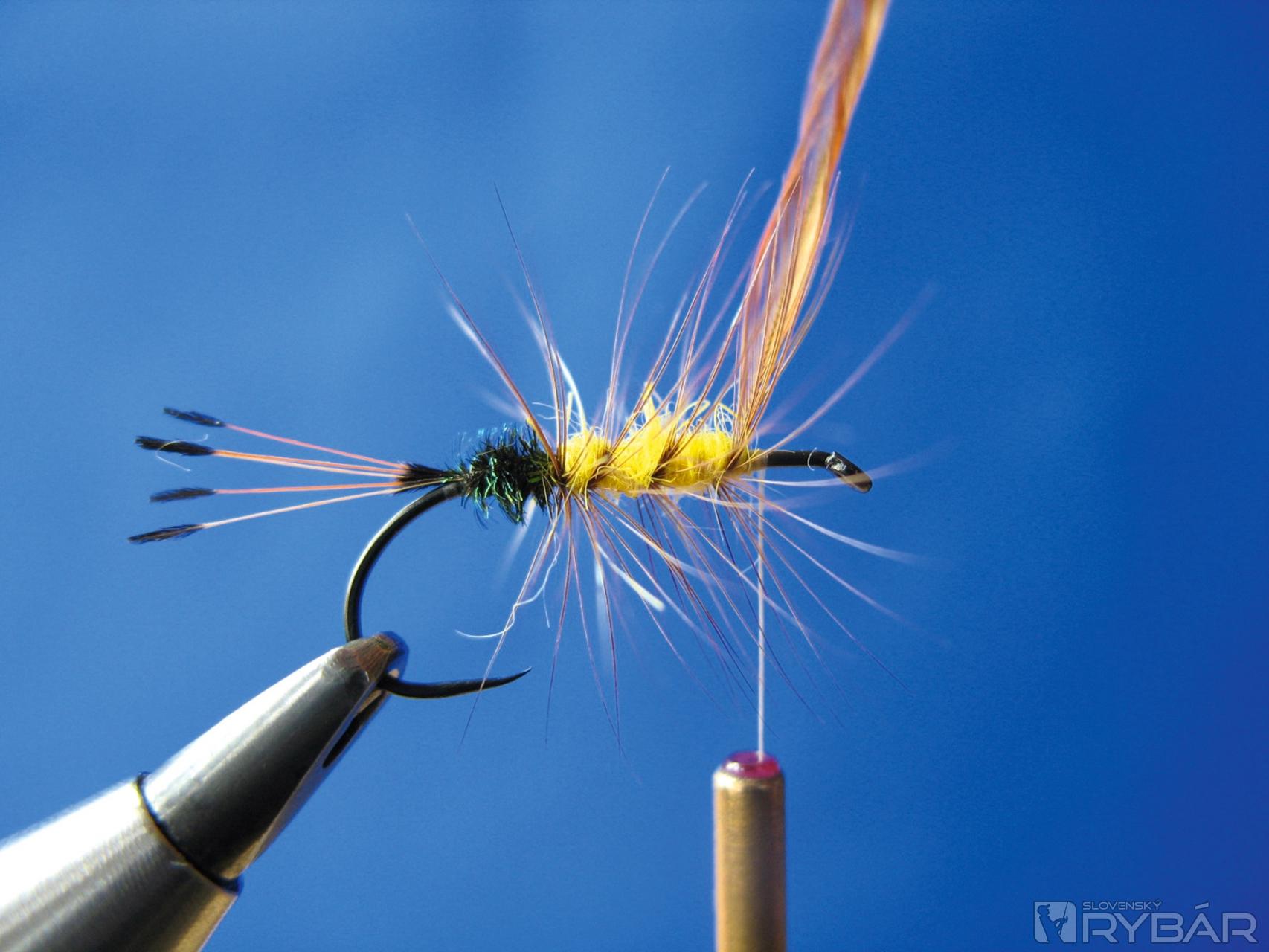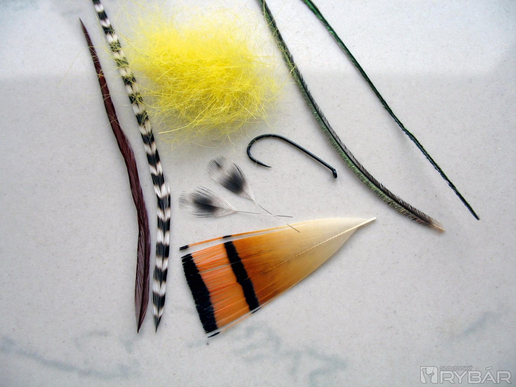 Z viazacích materiálov budeme potrebovať pierko z obojku zlatého bažanta, žltý dabing z králika alebo jeho mix s tuleňom. Dva vyzreté lúče z pera páva a po jednom kvalitnom kosieriku z hnedého kohúta a kohúta sfarbenia grizzly. Na krídelká sú použité špičky kosierikov z pierka sliepky vo sfarbení grizzly. Viazacie materiály môžete vidieť na obrázku. Okrem žltej farby rád používam Mosquito i v oranžovom, zelenom alebo béžovom odtieni.