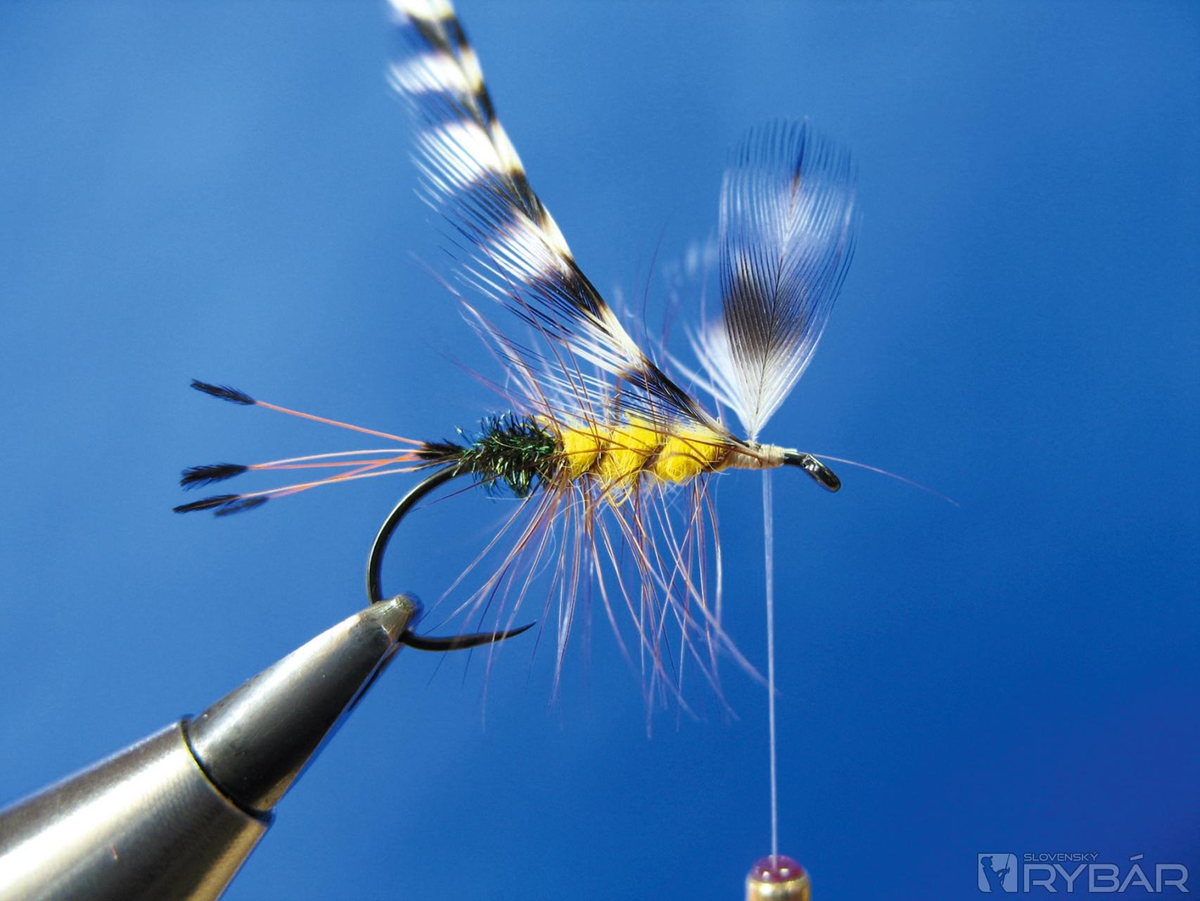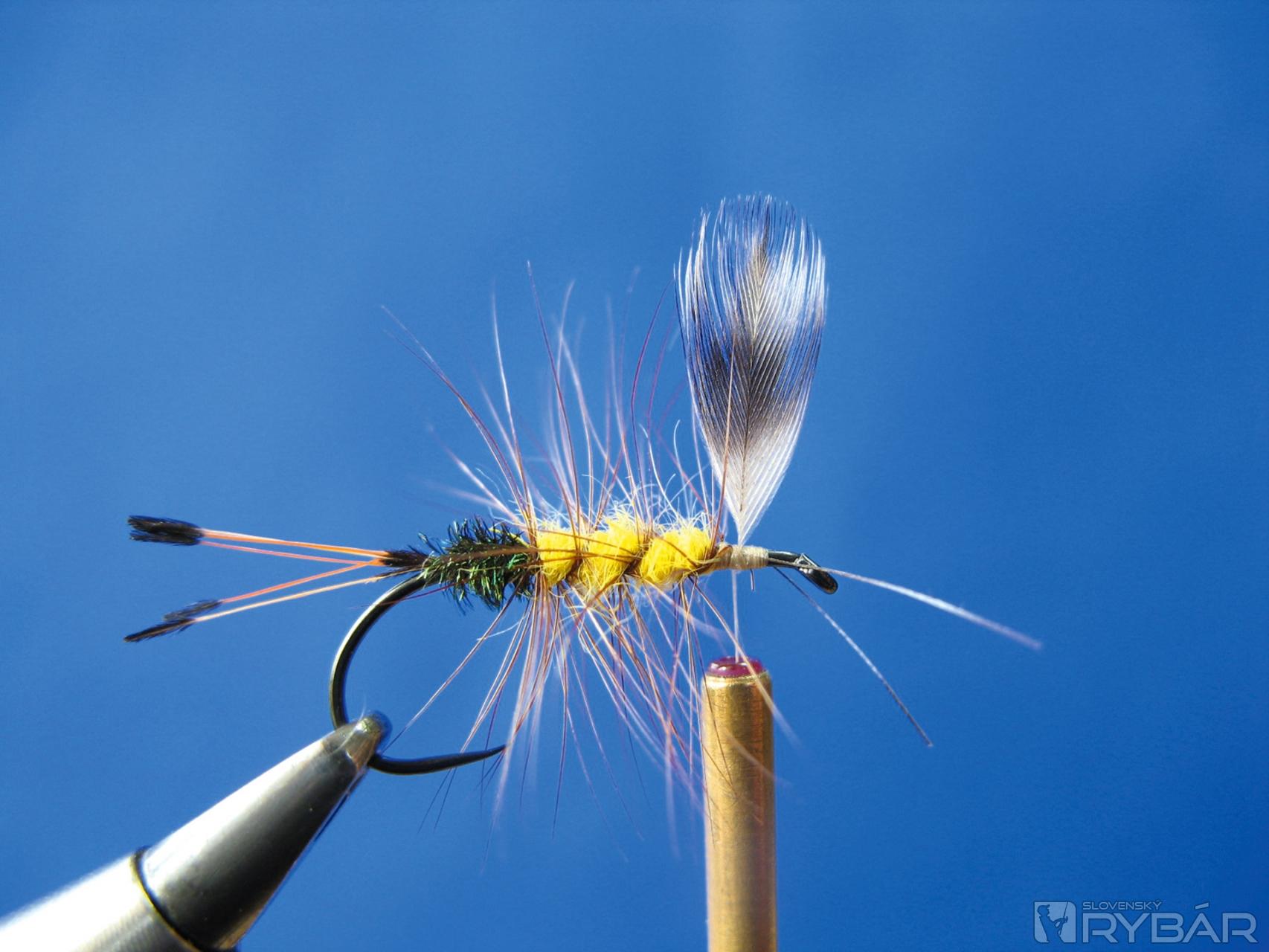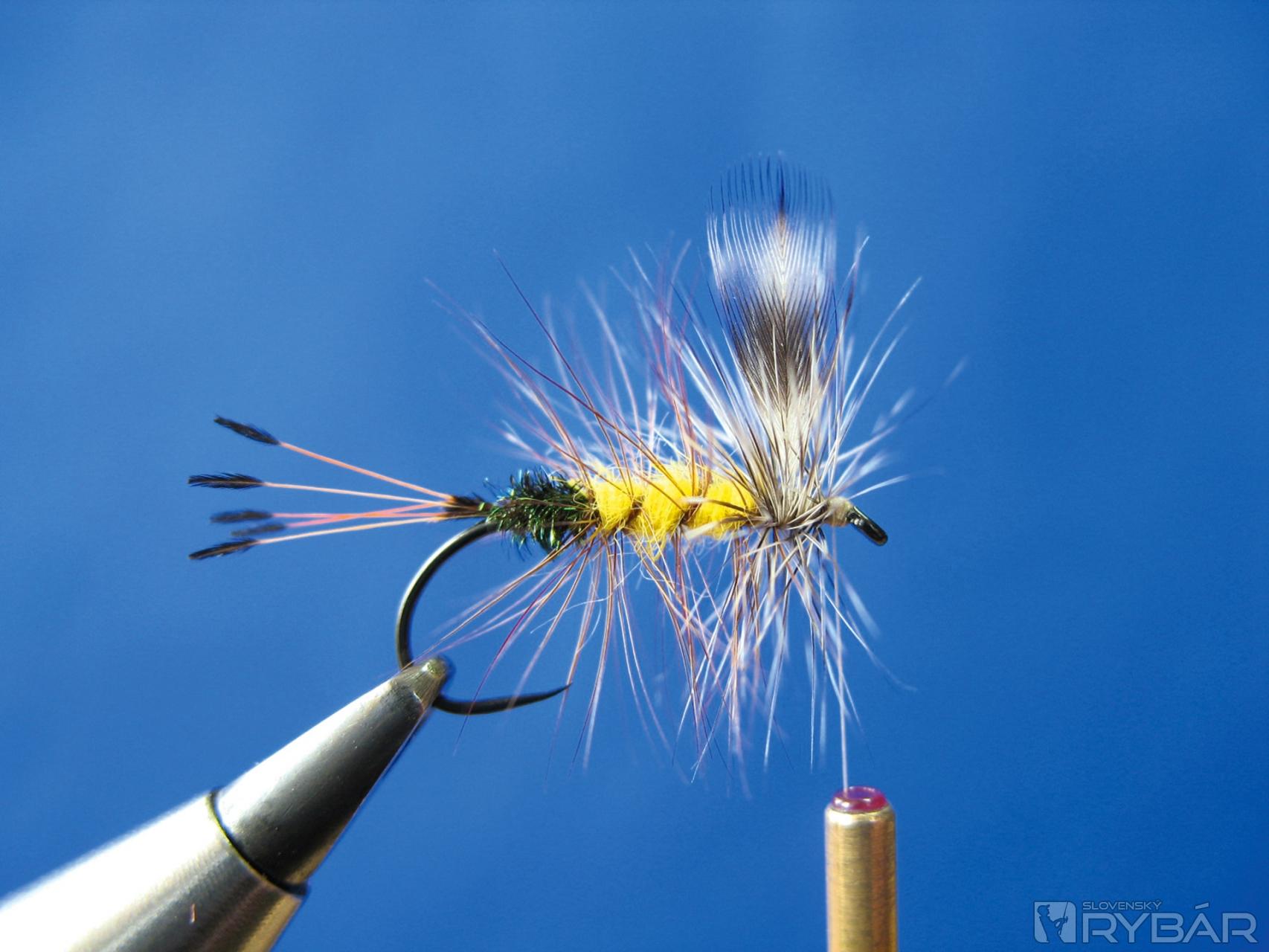 Z viazacích materiálov budeme potrebovať pierko z obojku zlatého bažanta, žltý dabing z králika alebo jeho mix s tuleňom. Dva vyzreté lúče z pera páva a po jednom kvalitnom kosieriku z hnedého kohúta a kohúta sfarbenia grizzly. Na krídelká sú použité špičky kosierikov z pierka sliepky vo sfarbení grizzly. Viazacie materiály môžete vidieť na obrázku. Okrem žltej farby rád používam Mosquito i v oranžovom, zelenom alebo béžovom odtieni.