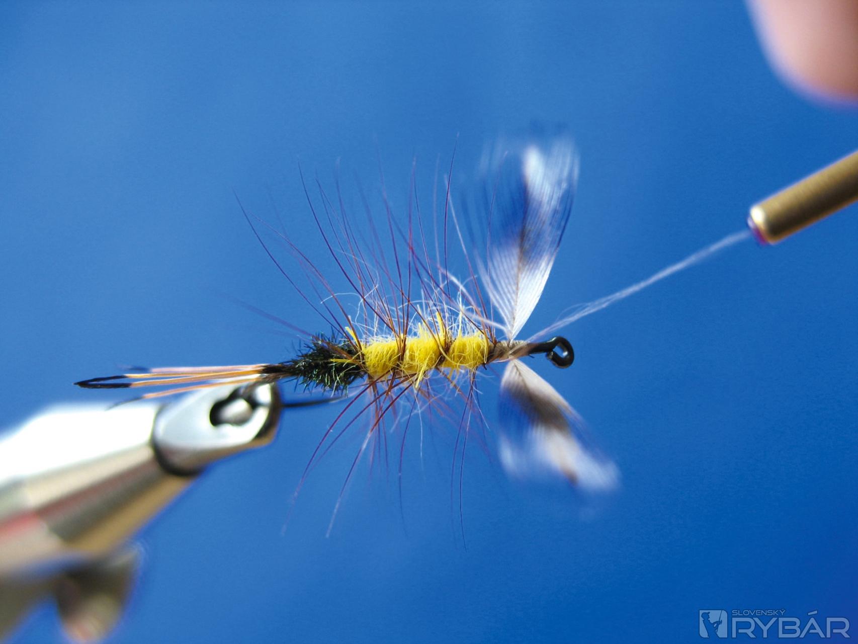 Stvoly sú mäkké, nie je preto nevyhnutné ich naviazať niekoľkými desiatkami ovinutí a úplne si tak zrušiť dôležité miesto pri očku. Bohato postačí niekoľko presných a pevných ovinutí, ktoré zaistia tvar a pevnosť naviazaných krídeliek. Rozmiestnenie ovinutí bude nasledujúce: prvé ovinutie urobíme vpredu, t.j. na strane očka. Týchto ovinutí urobíme max. 5. Pritom stále držíme krídelká stlačené medzi palcom a ukazovákom ľavej ruky.Dráždivá napodobenina suchozemského hmyzu