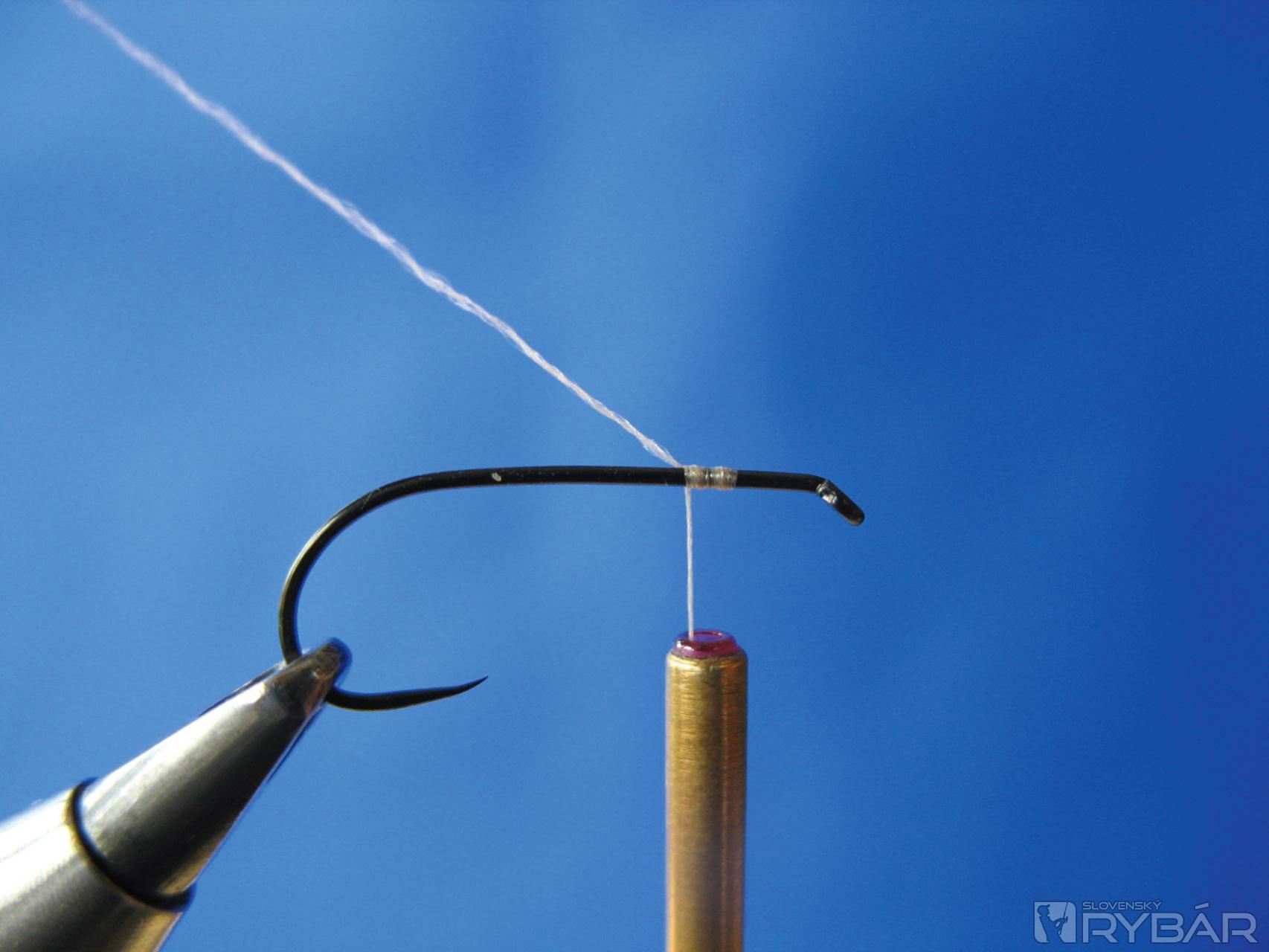 Na háčik si pomocou niekoľkých ovinutí prichytíme viazaciu niť.