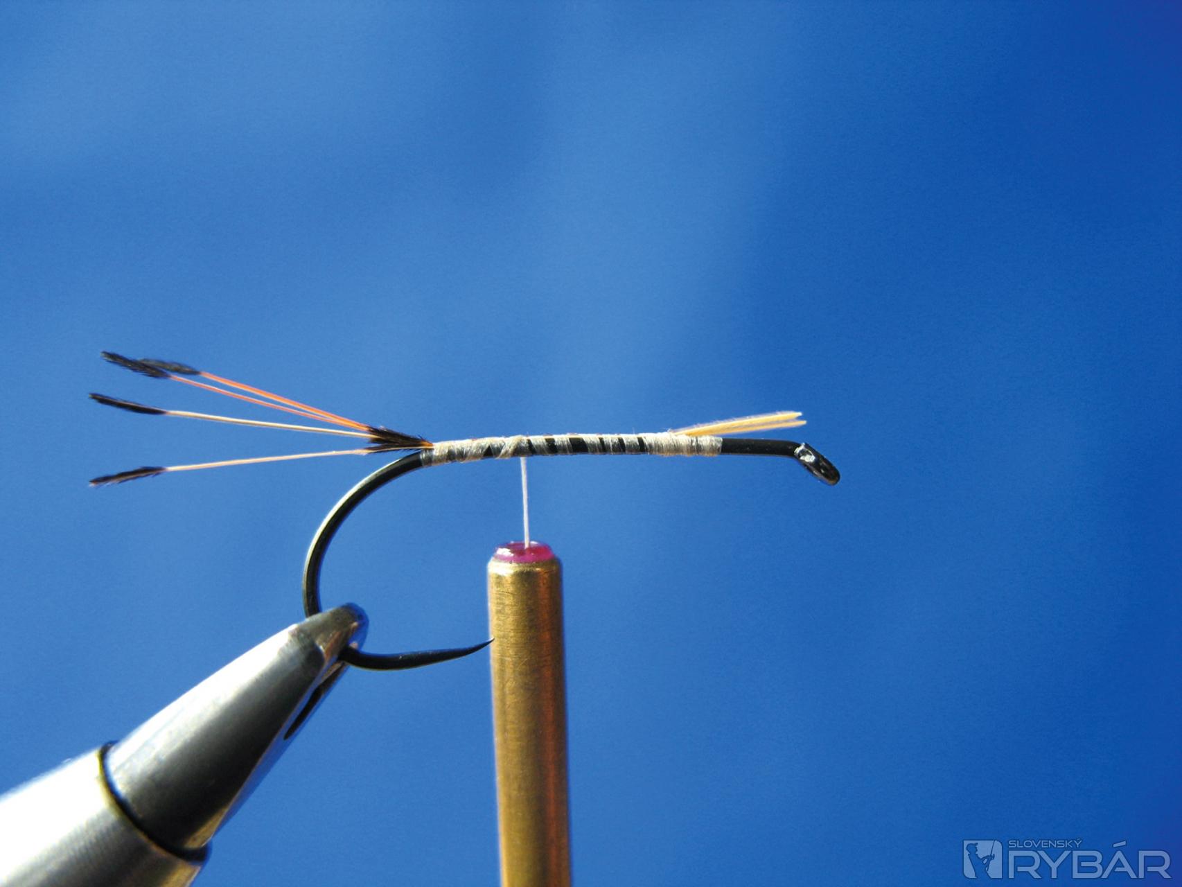 Uchopíme kosierik kohúta sfarbenia grizzly a odtrhneme od neho cca 2 mm vetvičiek. Kosierik priložíme z boku a naviažeme ho za a pred krídelkami. Krídla sa tak nepokrútia.