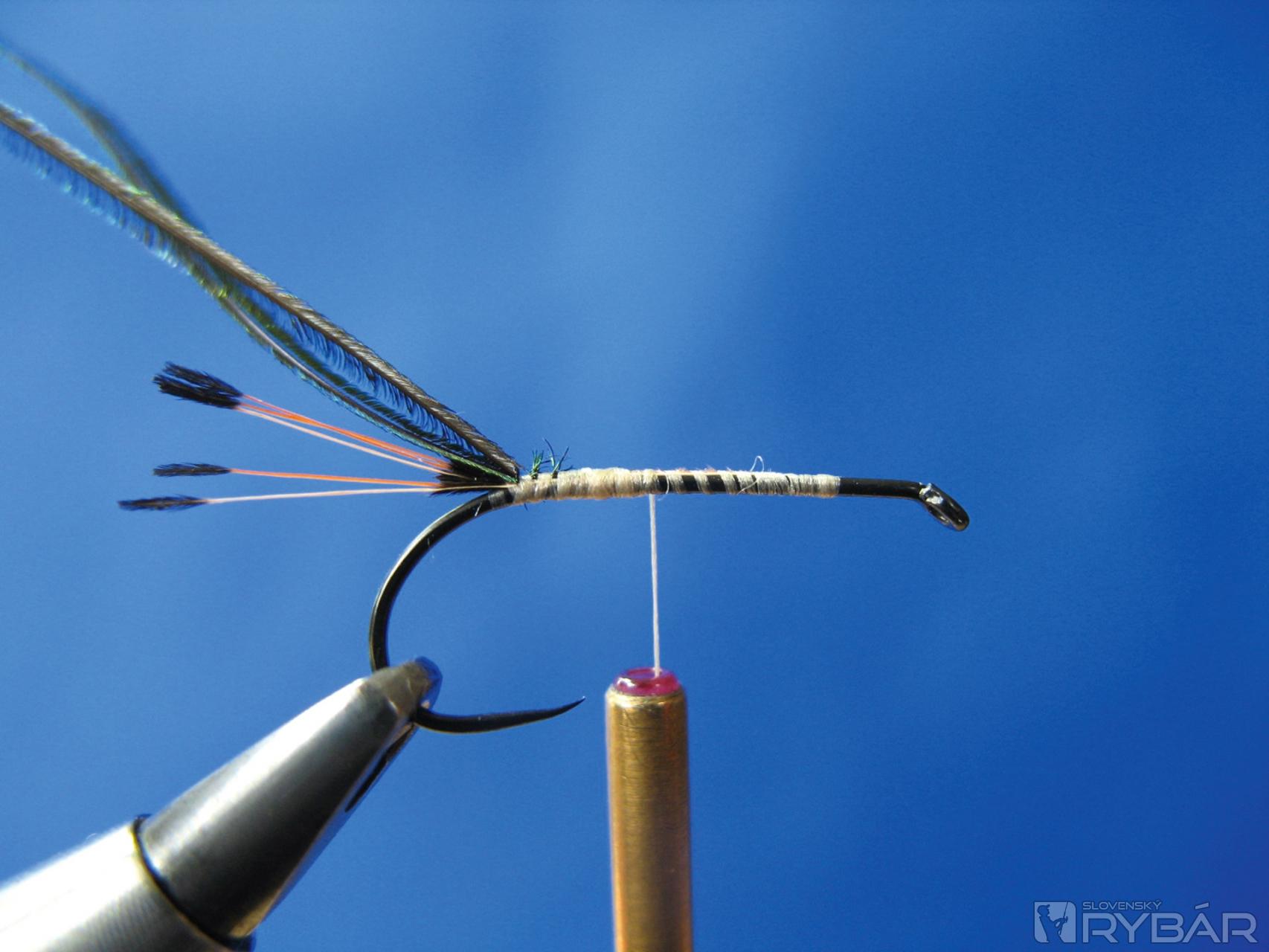 Pri konci háčika si naviažeme 2 pekné, husté a vyzreté lúče z pera páva.