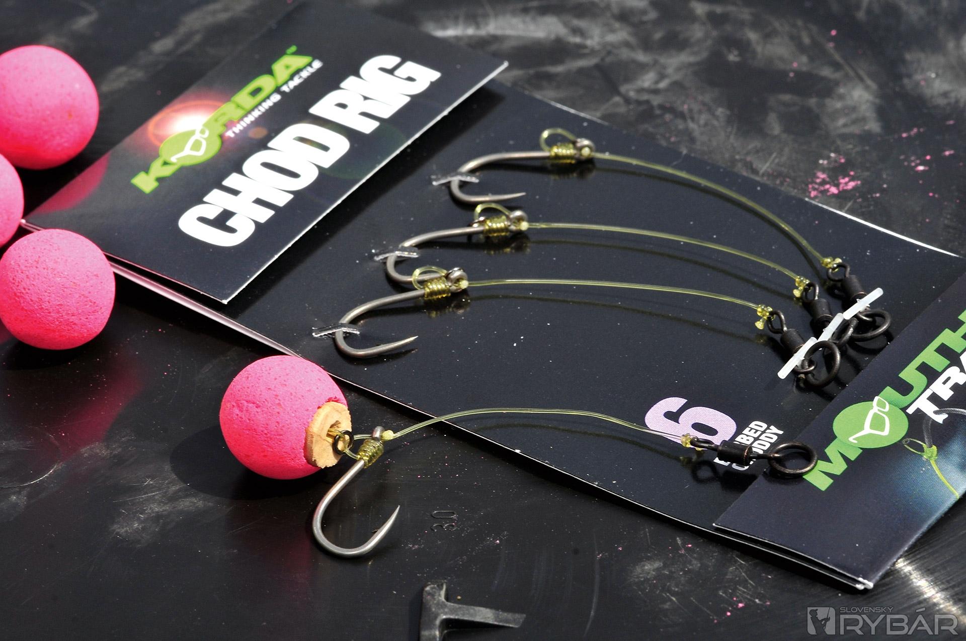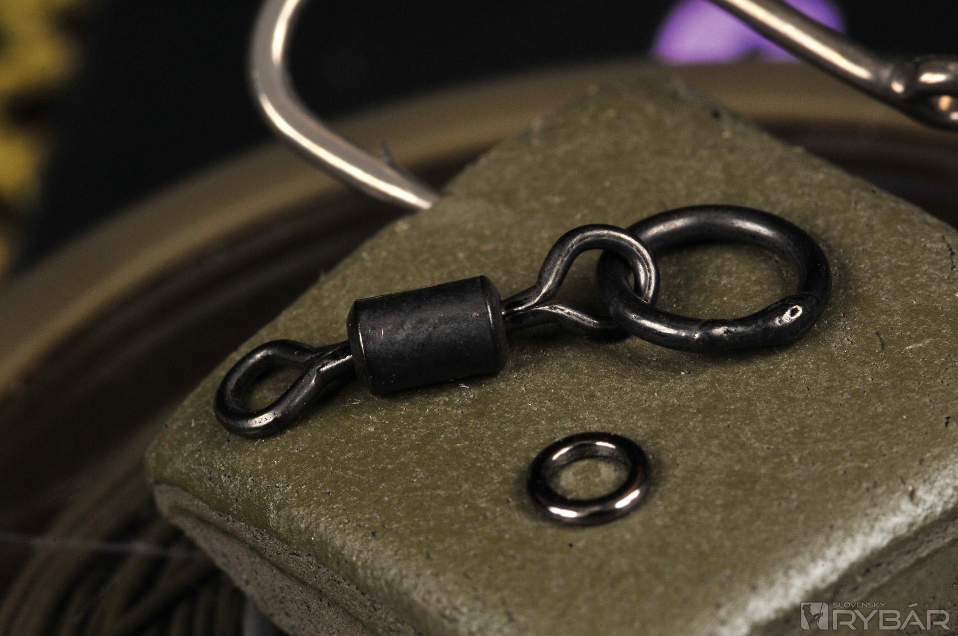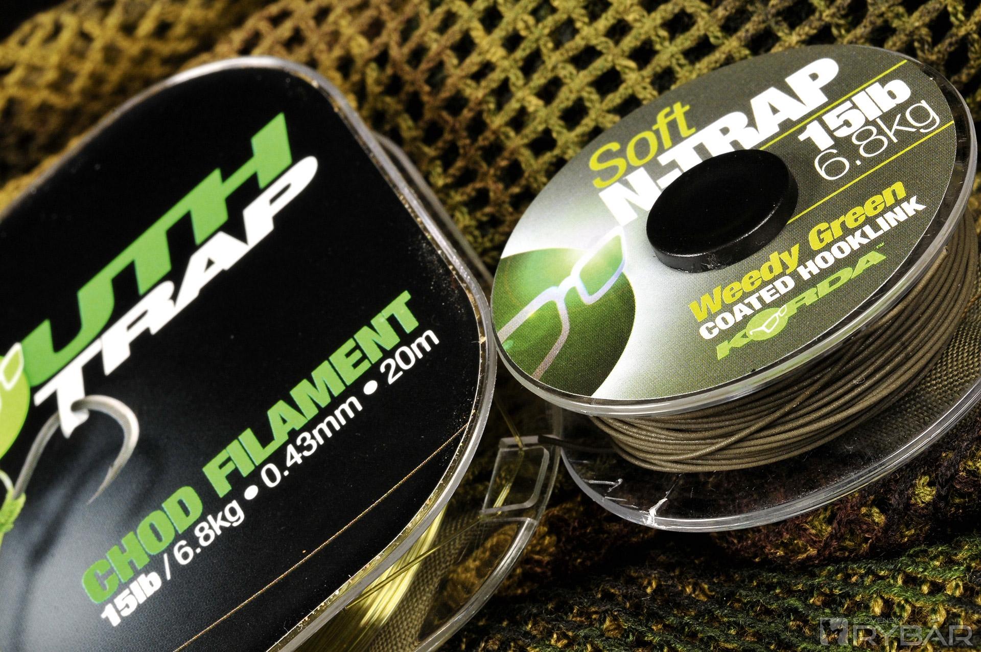 krúžok na obratlíku (Ring Swivels) veľ. 11, krúžok veľ. Medium, háčik Choddy veľ. 6, volfrámová pasta „Dark Matter Putty“, vlasec Mouth Trap 15 lb, stužená šnúrka N-Trap Soft 15 lb.