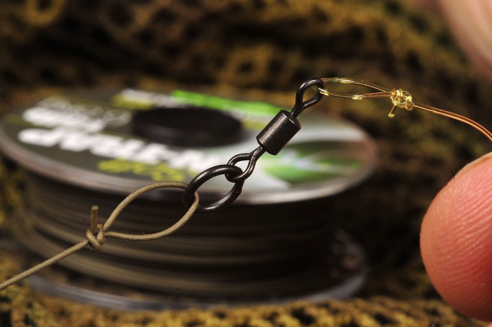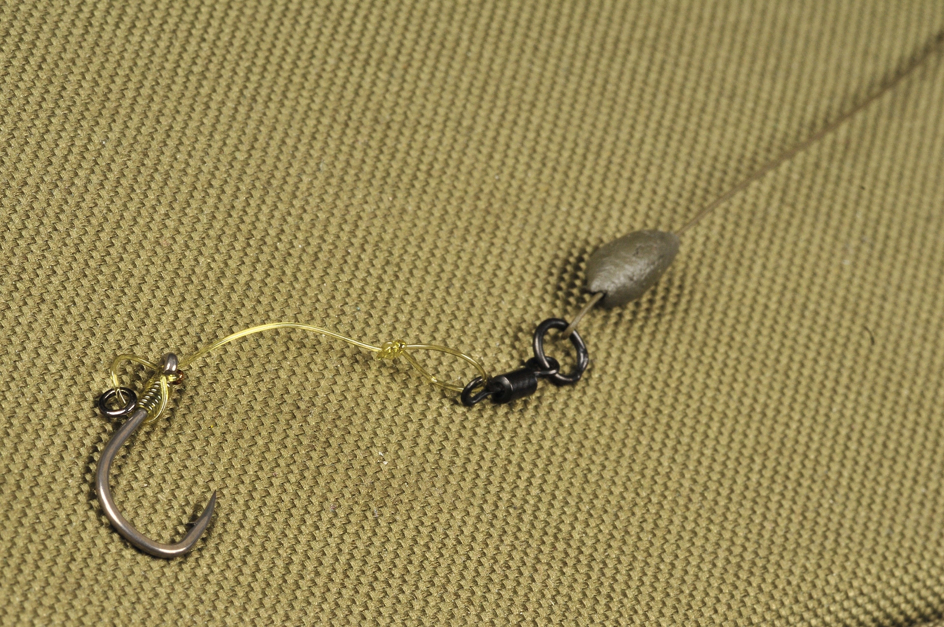 Jedna z mojich najobľúbenejších montáží je modifikovaná montáž Terryho Hearna – hinged stiff rig. Efekt zaseknutia ryby je rovnaký ako pri už spomínanej chod-rig. Vďaka zakrivenému vlascu koncovej montáže sa veľmi dobre zasekáva do spodnej pery kapra. Veľmi efektívne! Montáž je predurčená na lov na mäkkom dne bez rastlín, kde môžete chytať s olovom bez toho, aby sa zaborilo hlboko do dna. Ak je dno aj trochu mäkšie, táto montáž vykoná svoju prácu veľmi dobre vďaka tomu, že medzi olovom a koncovou montážou sa nachádza mäkká časť (vlasec). Ak použijete tuhú časť, montáž bude na dne sedieť tak trochu smiešne a nebude fungovať tak, ako má.