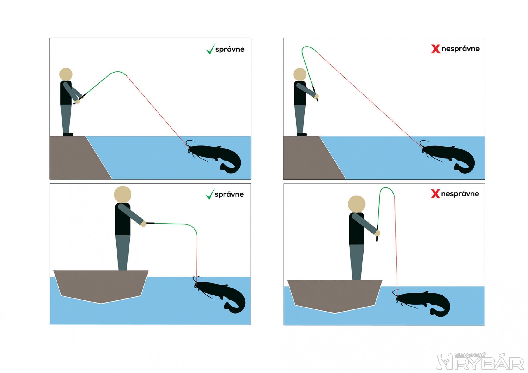 Z brehu rybu zdolávame tak, že v pokojnom stave špička neprejde cez hranicu cca 120-stupňového uhla s vlascom. Najlepšie asi je, keď sa počas priťahovania zastavíme v 90-stupňovom uhle, aby špička bola v pokojnom stave. Kvôli rybe je špička ohnutá, takže tá nás bude klamať, pocit treba mať v rukách. No a tu som videl prasknúť nie jeden vysoko kvalitný výrobok. Dotyčný začal zdolávať rybu, ktorá nebola ani extrémne veľká, ale chcel ju vytiahnuť rýchlo, takže pumpoval rybu vo viac ako 120-stupňovom uhle. Stačil jeden silnejší výpad ryby keď mal svoje náčinie maximálne napnuté a dobrý kus od špičky sa odlomil.