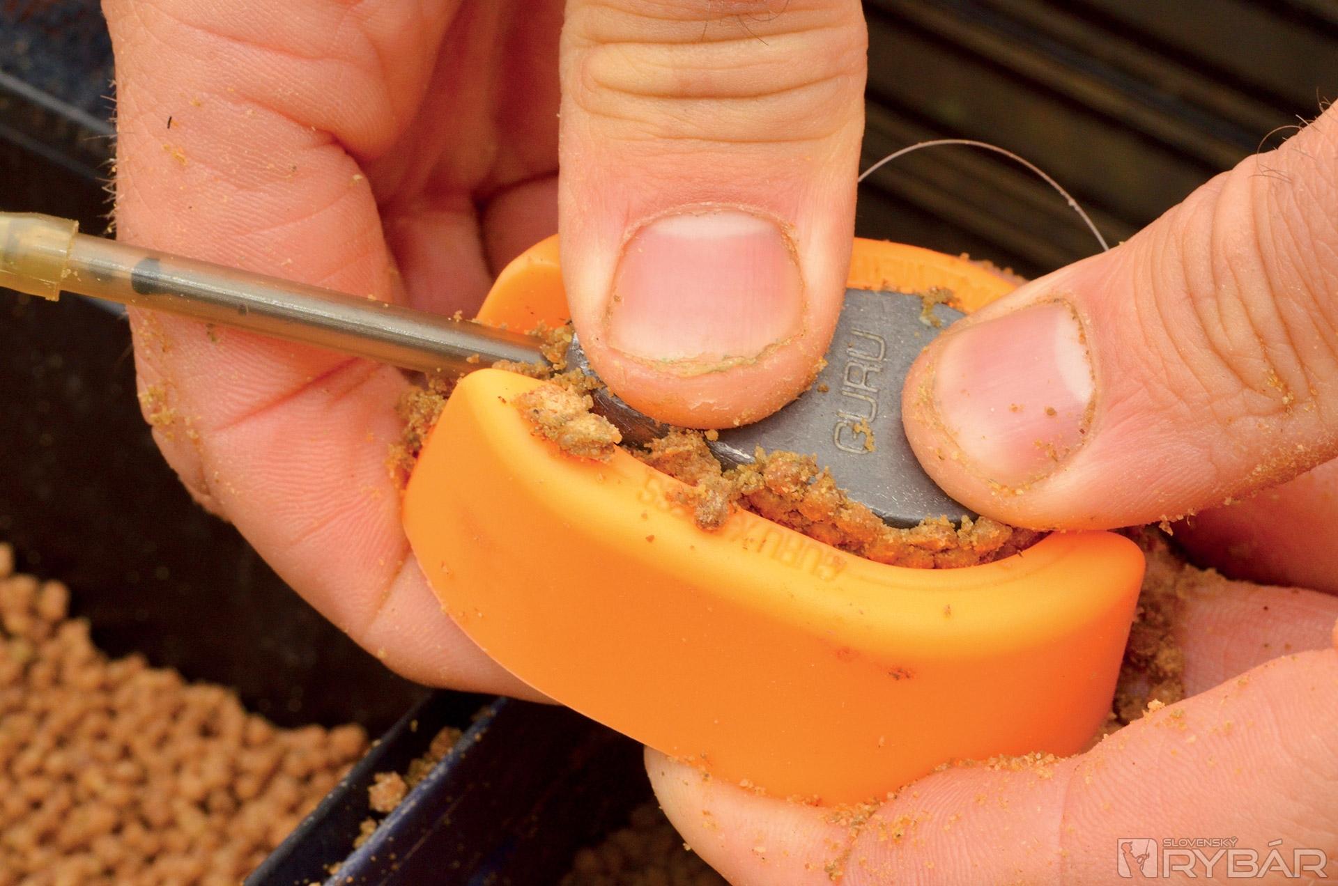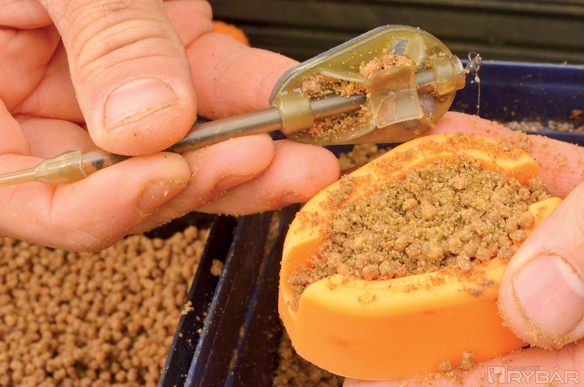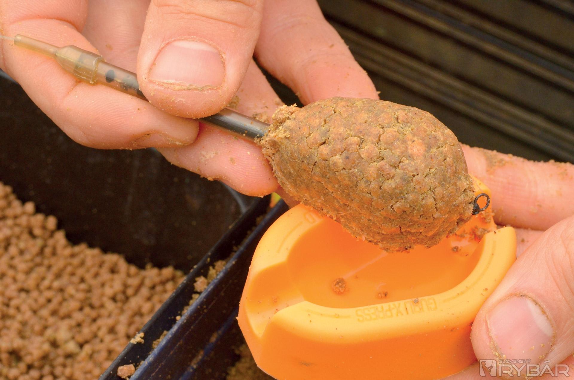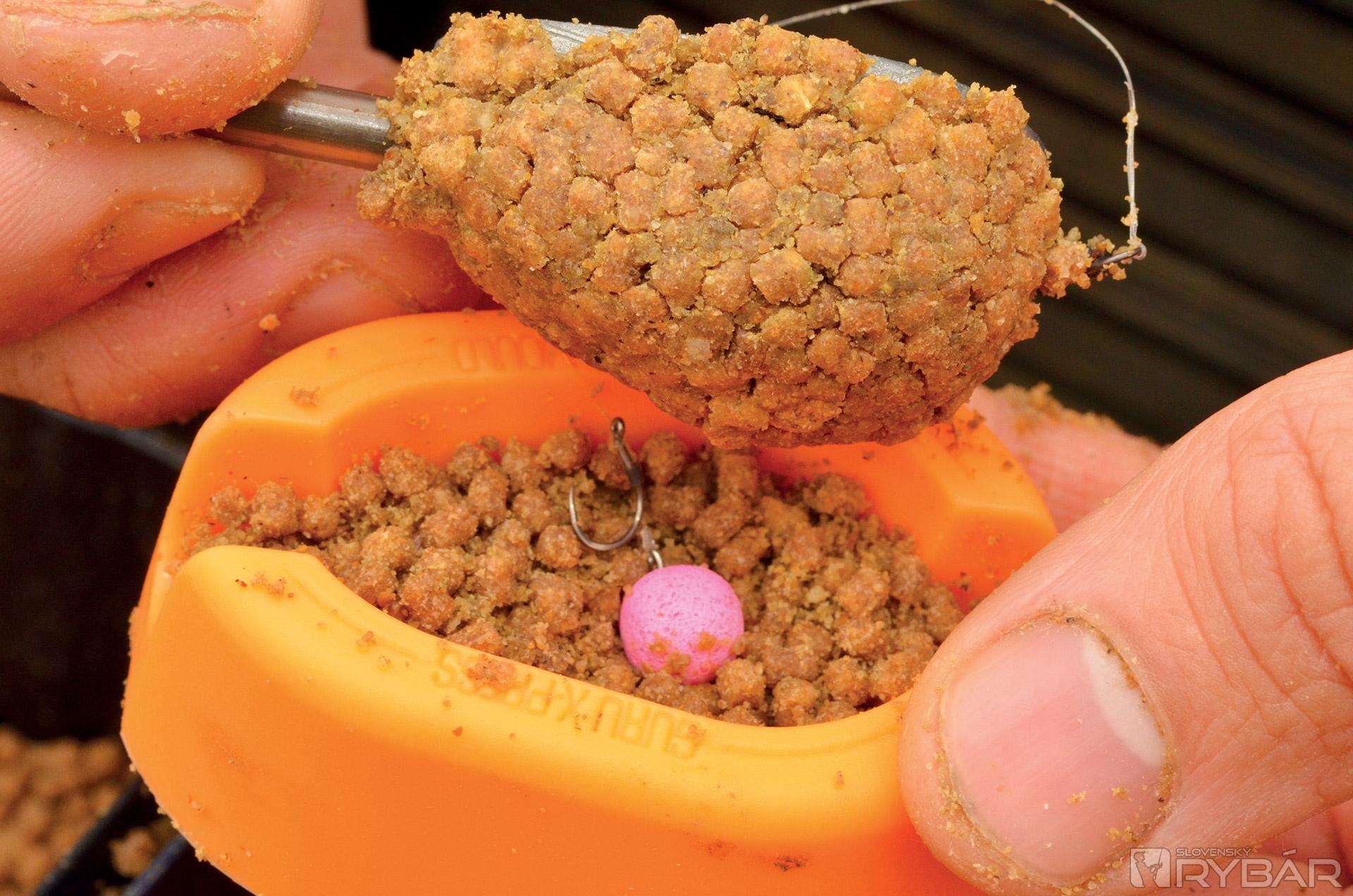 Potom ich vložím do ďalšieho vedra, kde ich nechávam odpočívať aspoň 30 minút. Pelety sú potom lepkavé a držia pokope ako hlina. Keď mám všetko pripravené, môžem krmivom plniť kŕmidlo. Na to používam Guru X-Press formu. Do nej vložím peletky, položím na vrch kŕmidlo a stlačím. Takto mi vznikne prvá vrstva. Následne znova naplním formu, do stredu položím háčik s nástrahou a opäť poriadne zatlačím. Všetko by malo držať pekne pohromade. Presvedčte sa o tom pred nahodením...