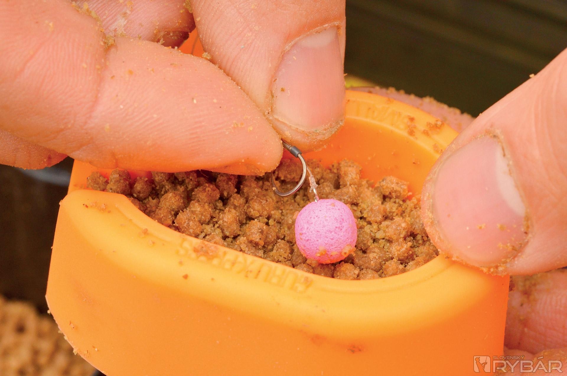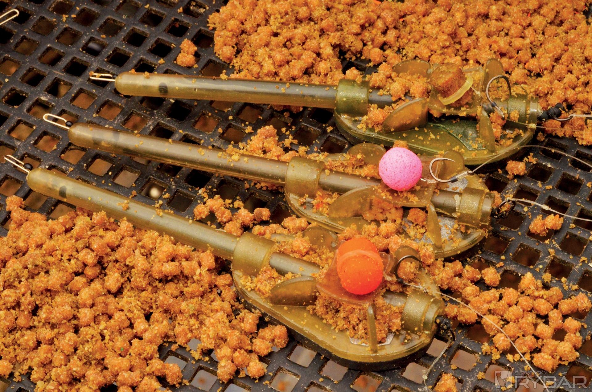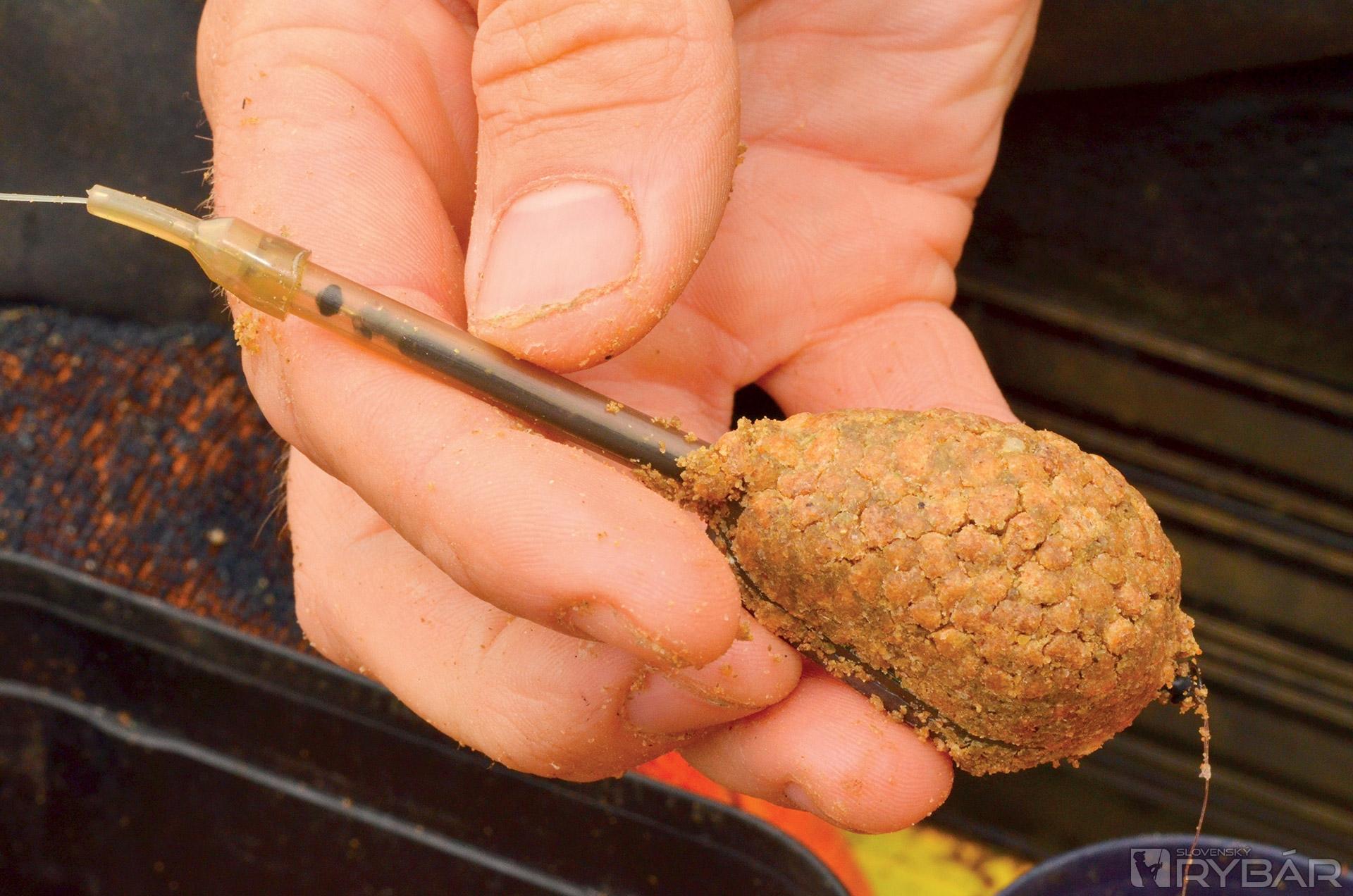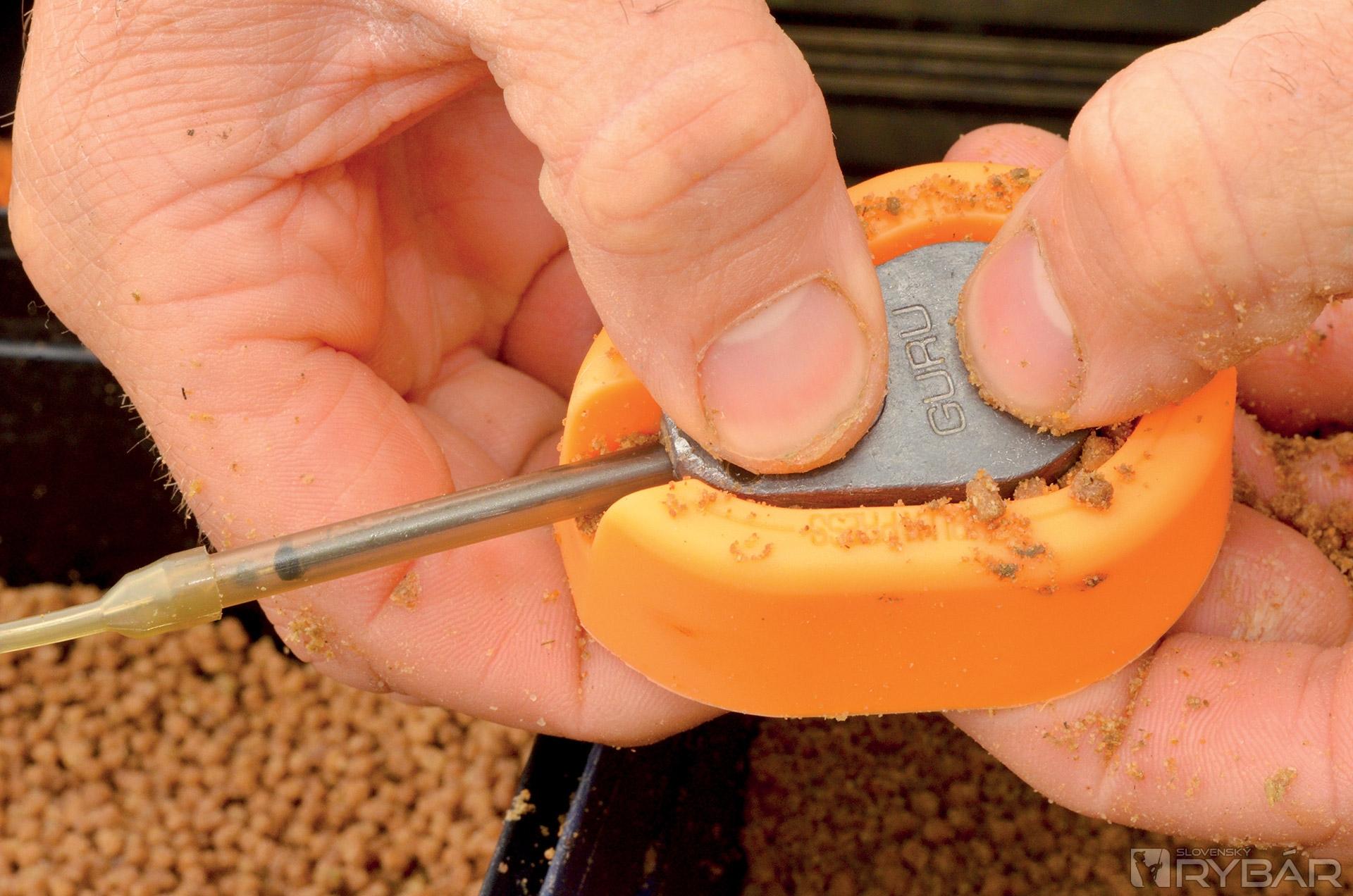 Potom ich vložím do ďalšieho vedra, kde ich nechávam odpočívať aspoň 30 minút. Pelety sú potom lepkavé a držia pokope ako hlina. Keď mám všetko pripravené, môžem krmivom plniť kŕmidlo. Na to používam Guru X-Press formu. Do nej vložím peletky, položím na vrch kŕmidlo a stlačím. Takto mi vznikne prvá vrstva. Následne znova naplním formu, do stredu položím háčik s nástrahou a opäť poriadne zatlačím. Všetko by malo držať pekne pohromade. Presvedčte sa o tom pred nahodením...